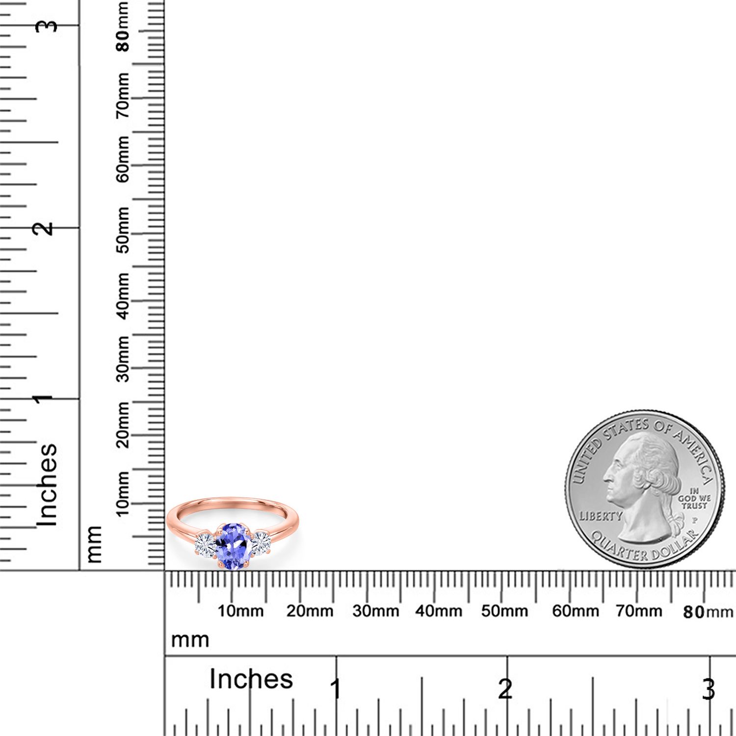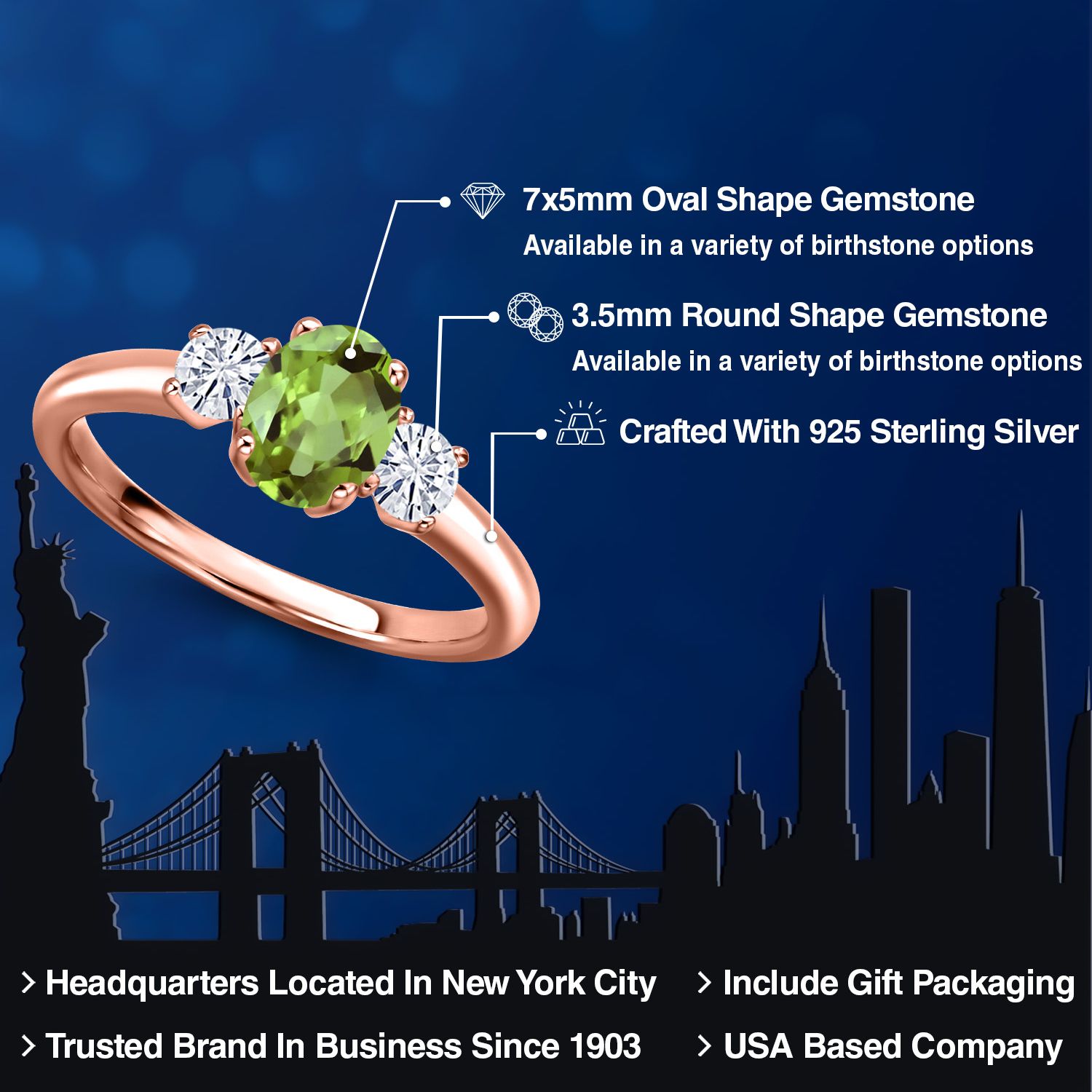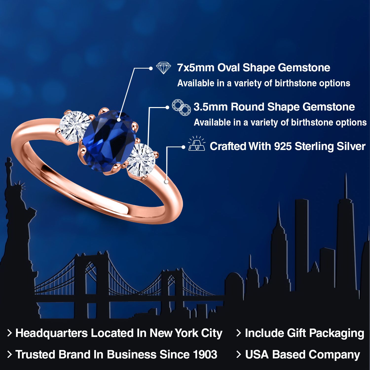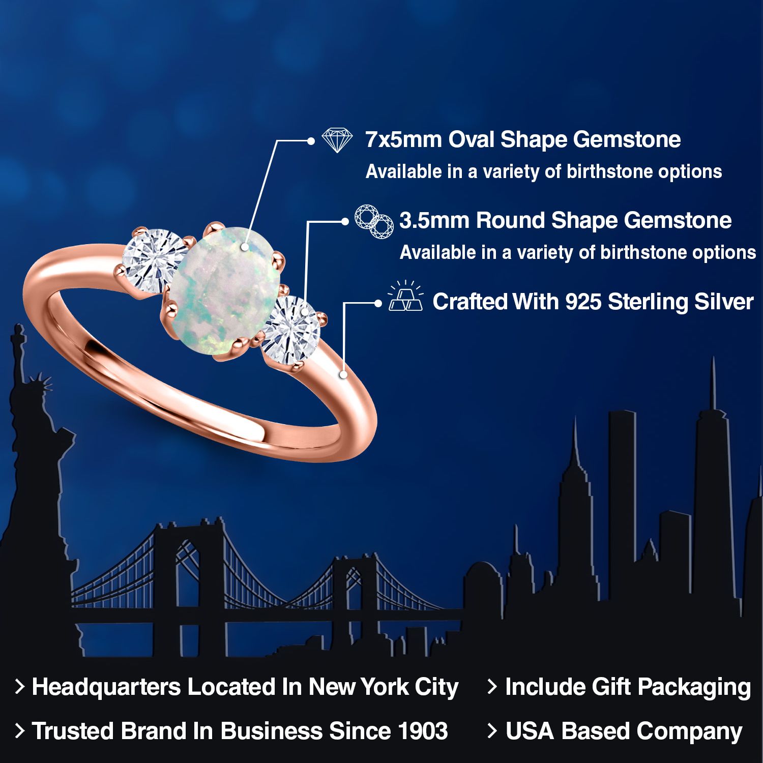 18K Rose Gold Plated Silver Gemstone Birthstone and White Moissanite 3-Stone Engagement Ring for Women | Oval 7X5MM and Round 3MM | Wedding Anniversary Promise Ring | Sizes 5, 6, 7, 8, 9