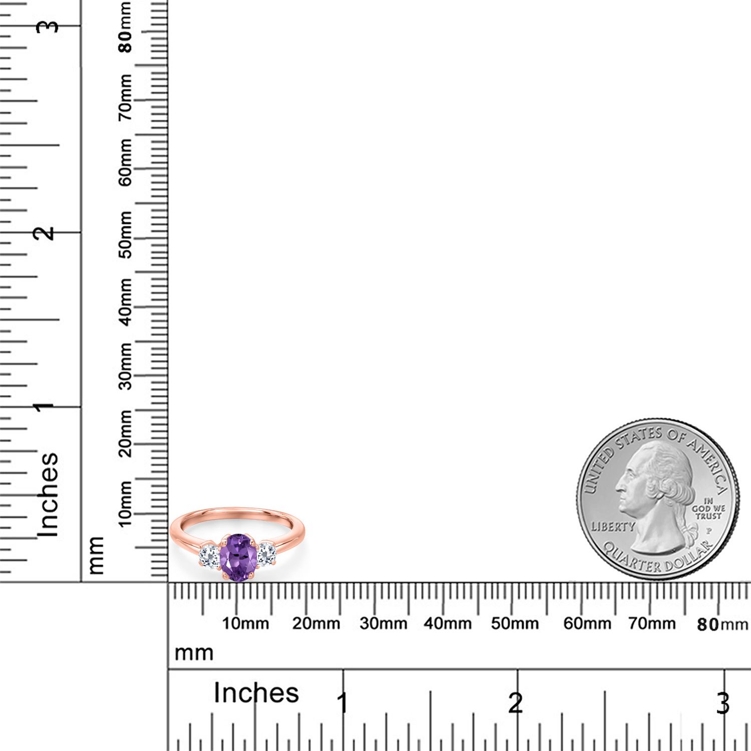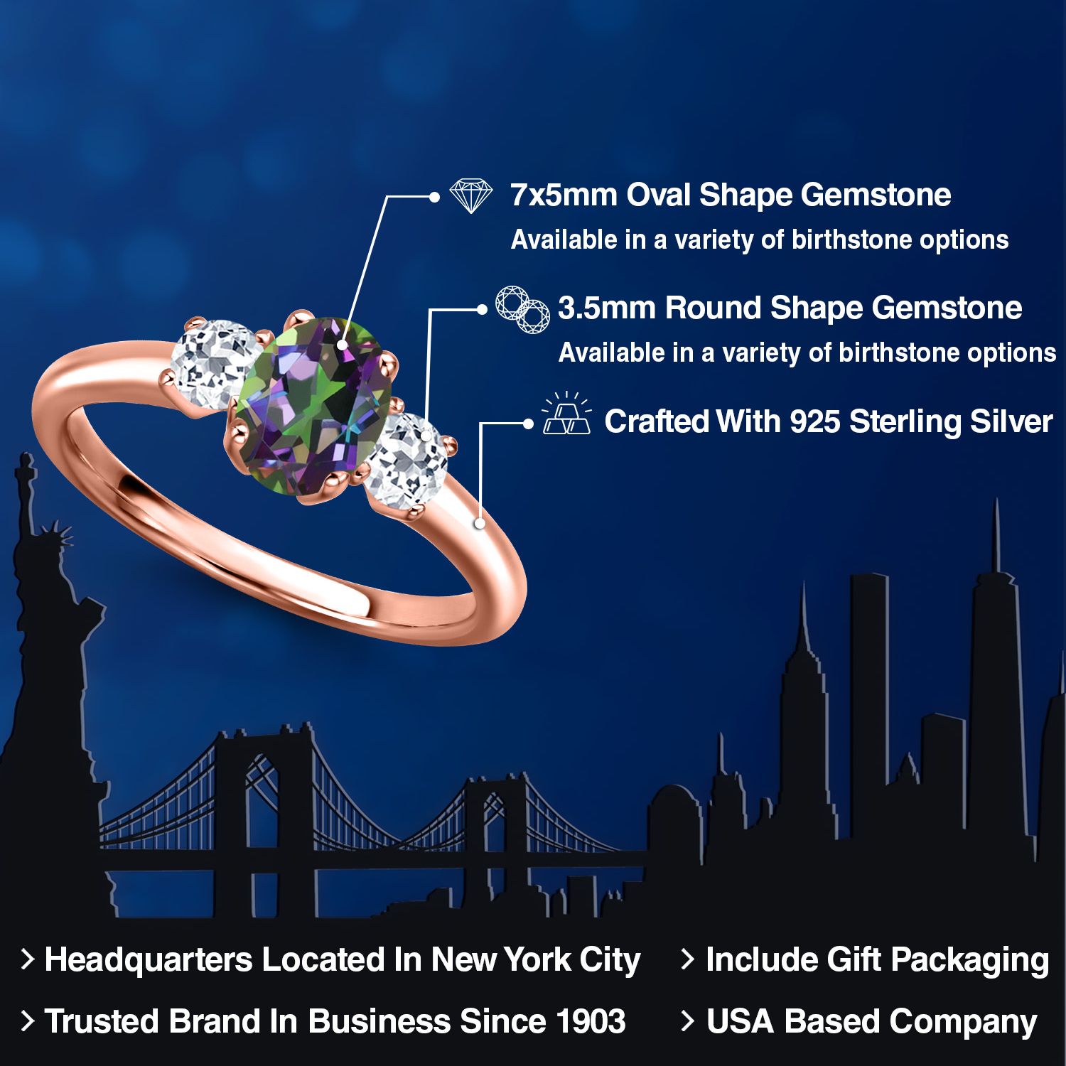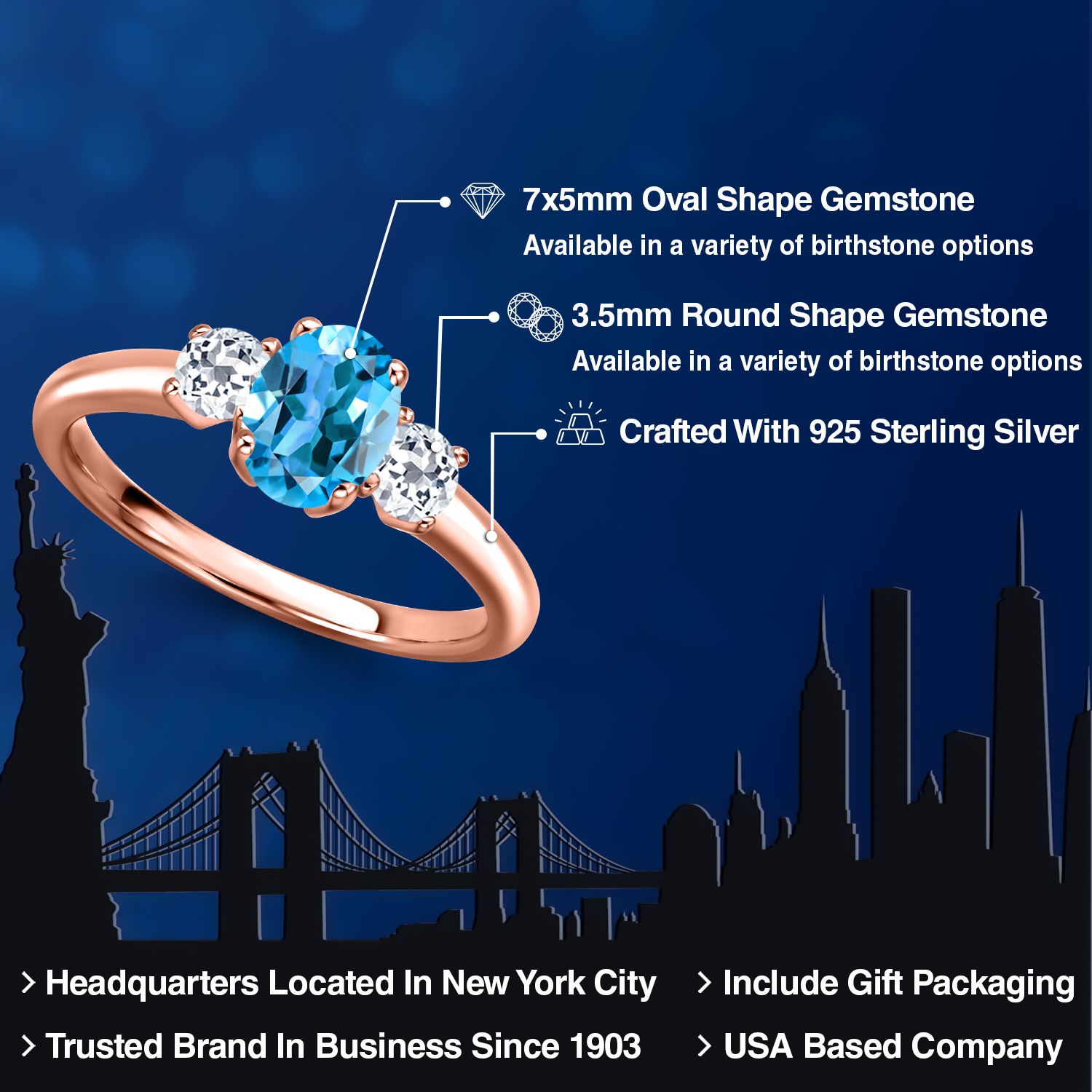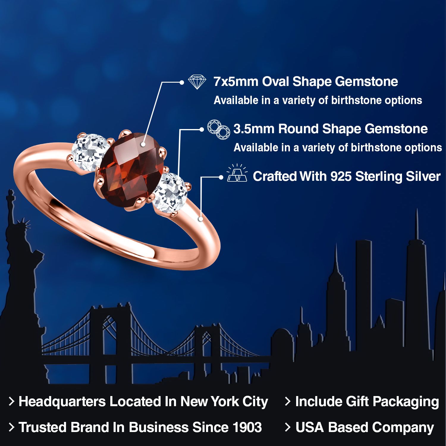 18K Rose Gold Plated Silver Gemstone Birthstone and White Topaz 3-Stone Engagement Ring for Women | Oval 7X5MM and Round 3MM | Wedding Anniversary Promise Ring | Sizes 5, 6, 7, 8, 9