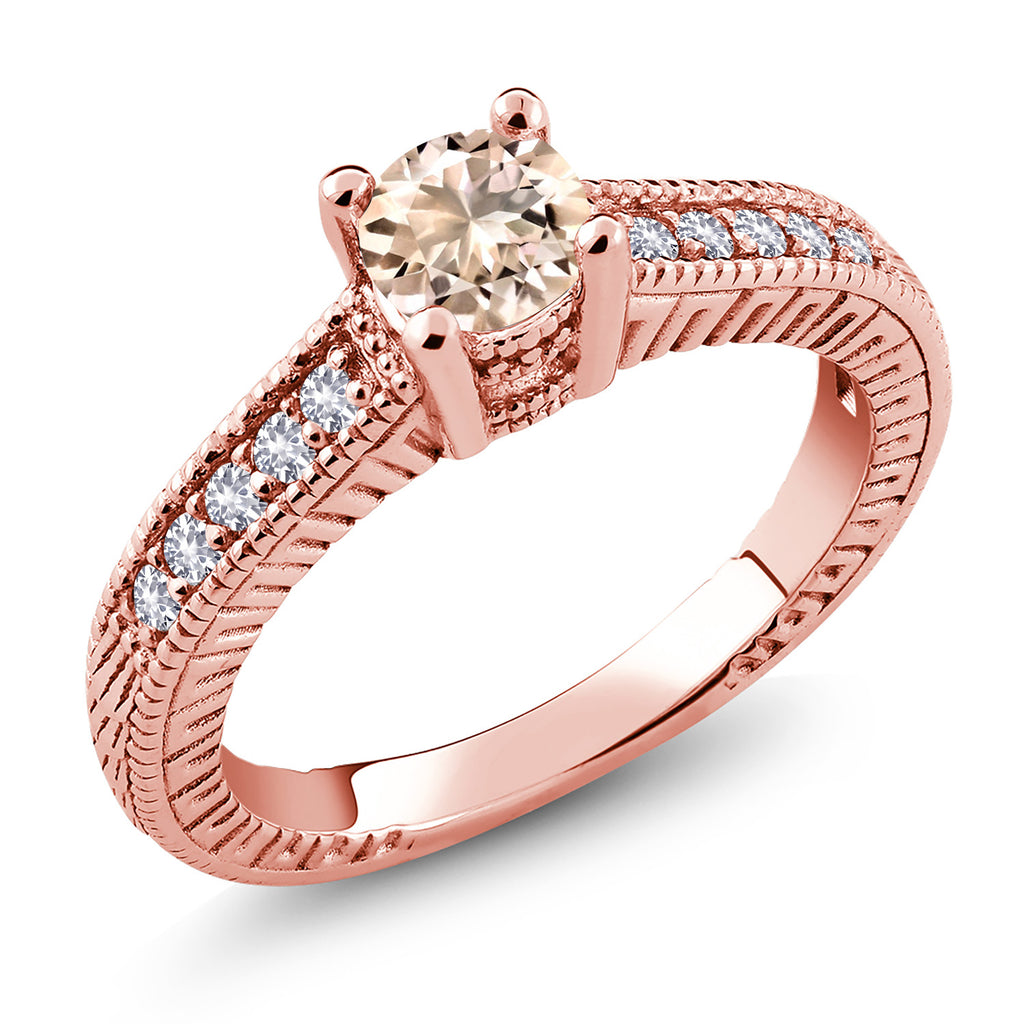 MEASUREMENTS: 5x5mm Round Irradiated Peach Morganite, 1.5x1.5mm Round Heat-Treated White Created Sapphire. Total Carat Weight is 0.55 cttw