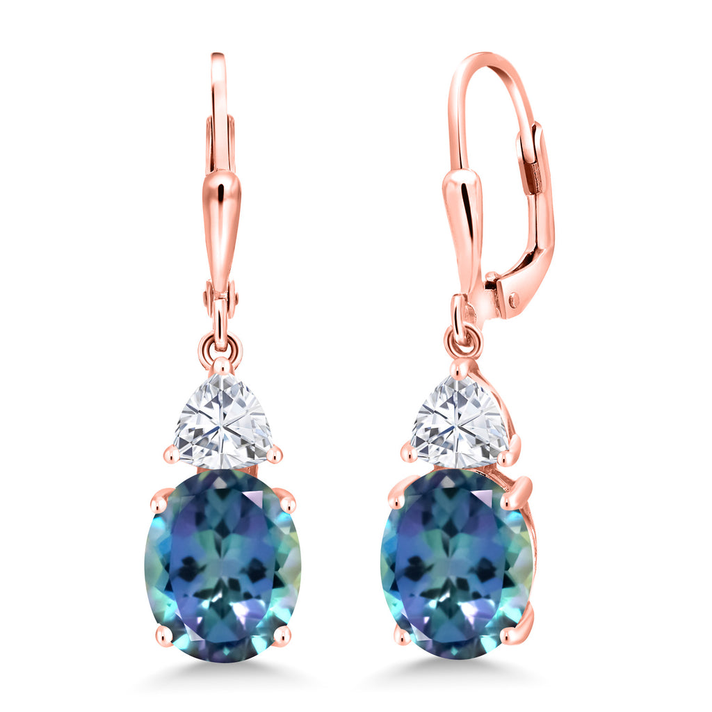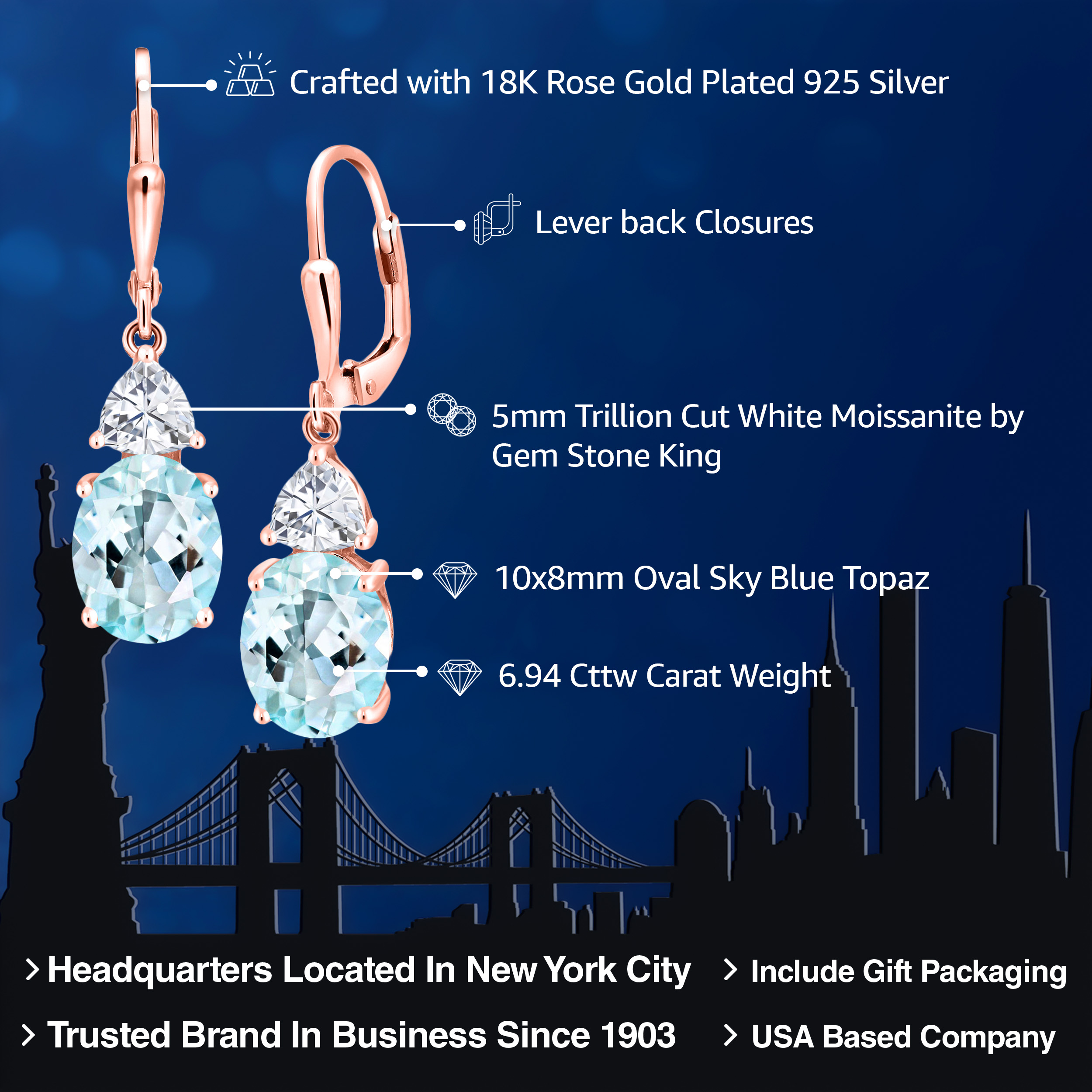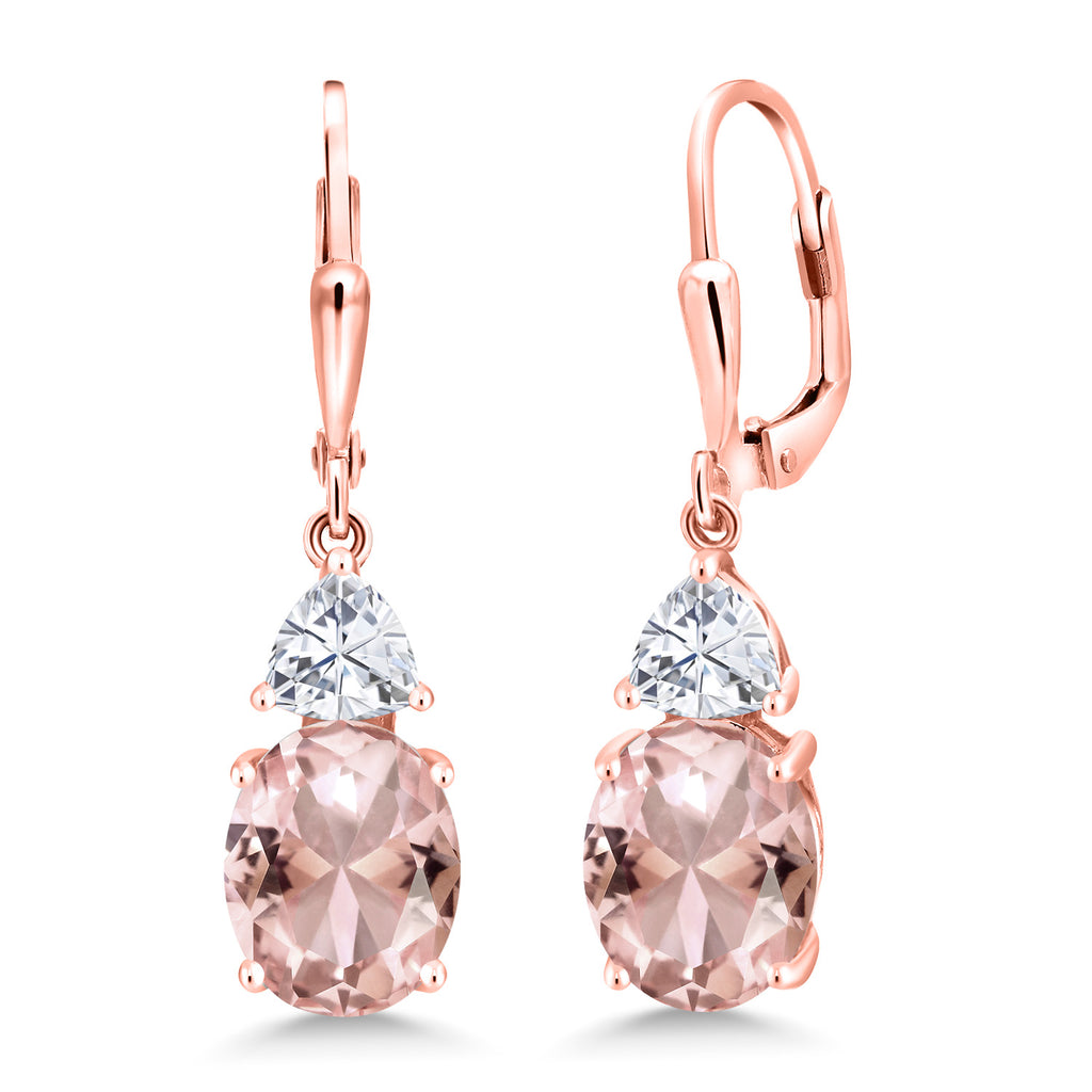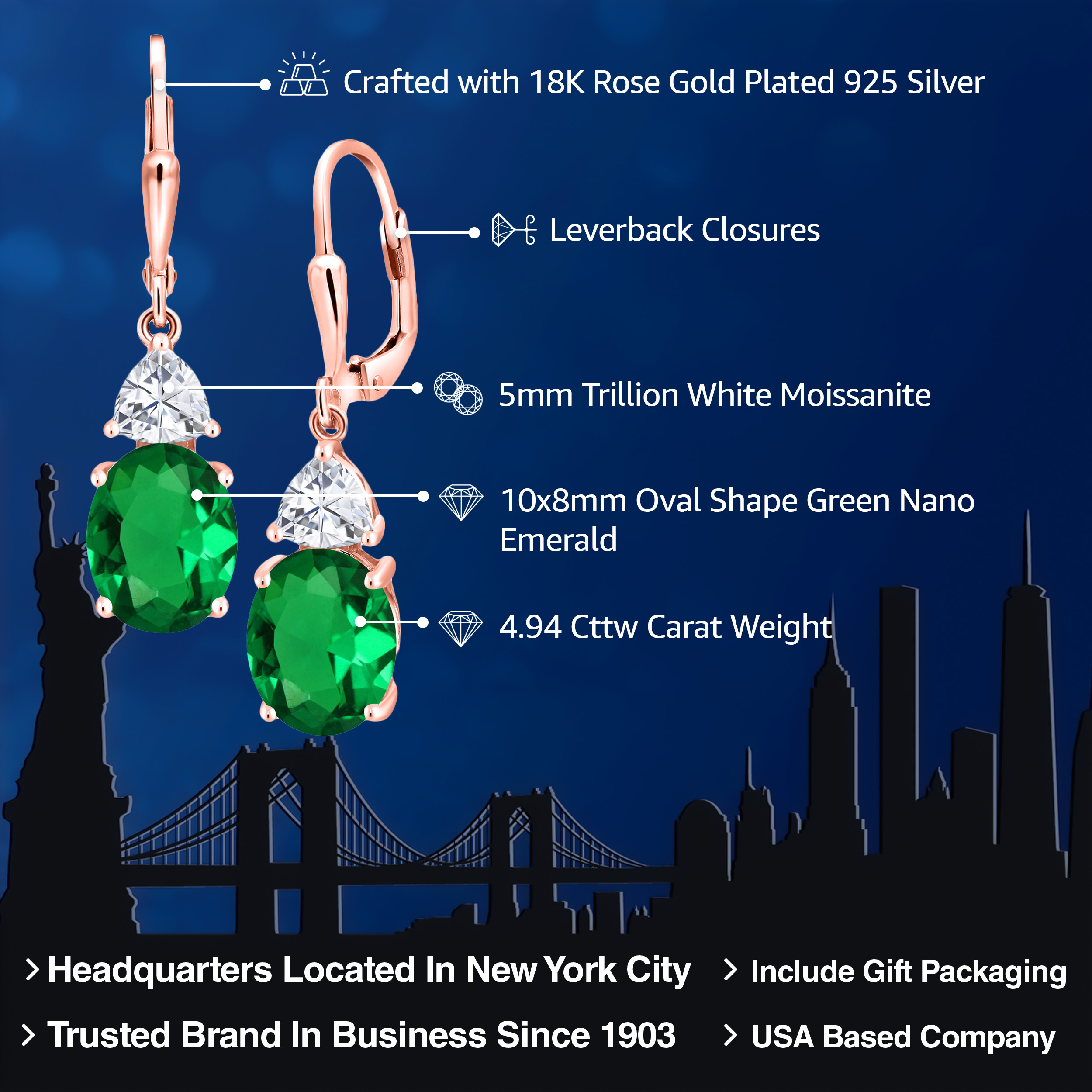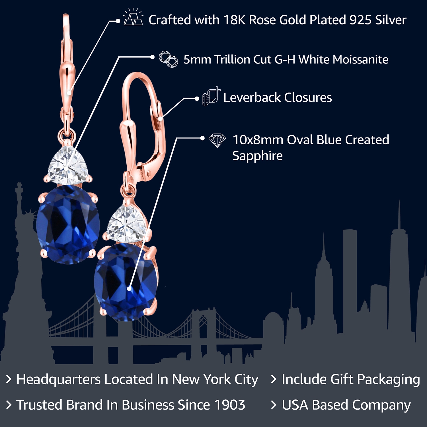 18K Rose Gold Plated Gemstone Birthstone and White Moissanite Leverback Dangle Earrings For Women | Oval 10X8MM and Trillion 5MM | Elegant Drop Design | Gift for Her Wife Mom