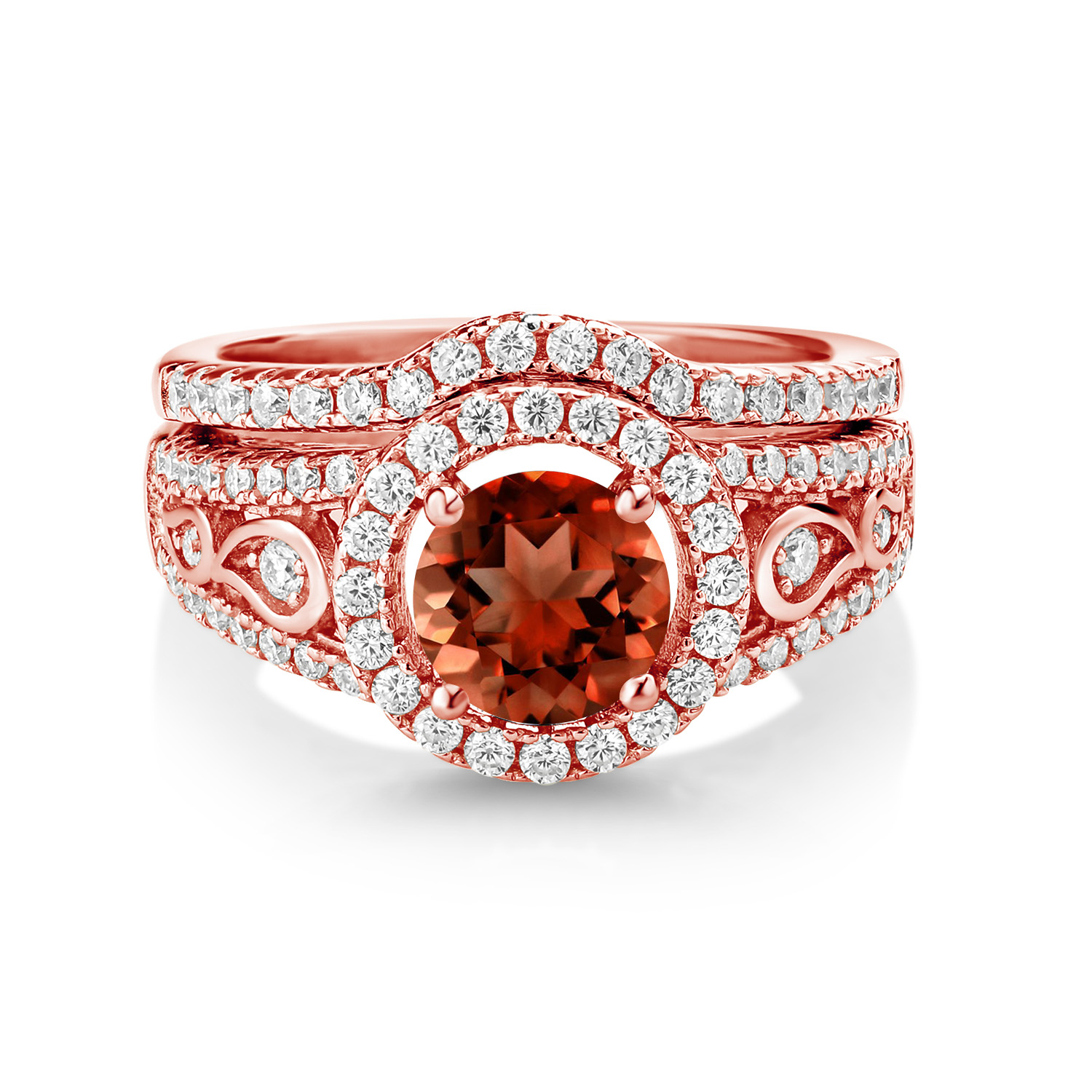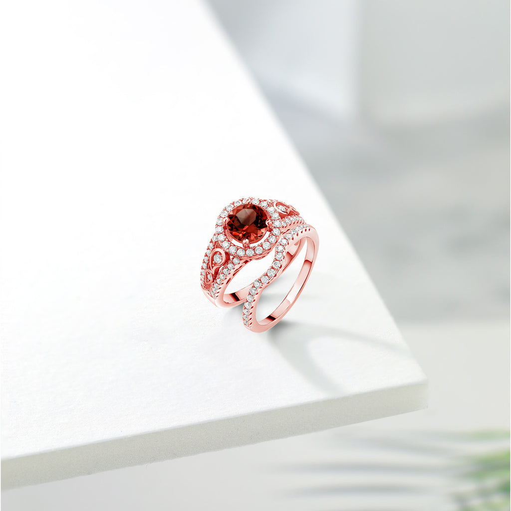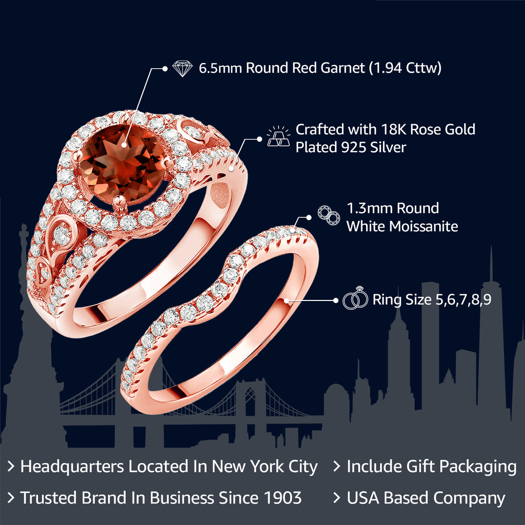 QUALITY CRAFTSMANSHIP IN 18K ROSE GOLD PLATED SILVER: Meticulously crafted in high-quality 18K rose gold plated silver, this bridal set seamlessly combines durability with refined aesthetics. The rose gold plating adds a romantic and luxurious touch, setting the stage for the red garnet and white moissanite.