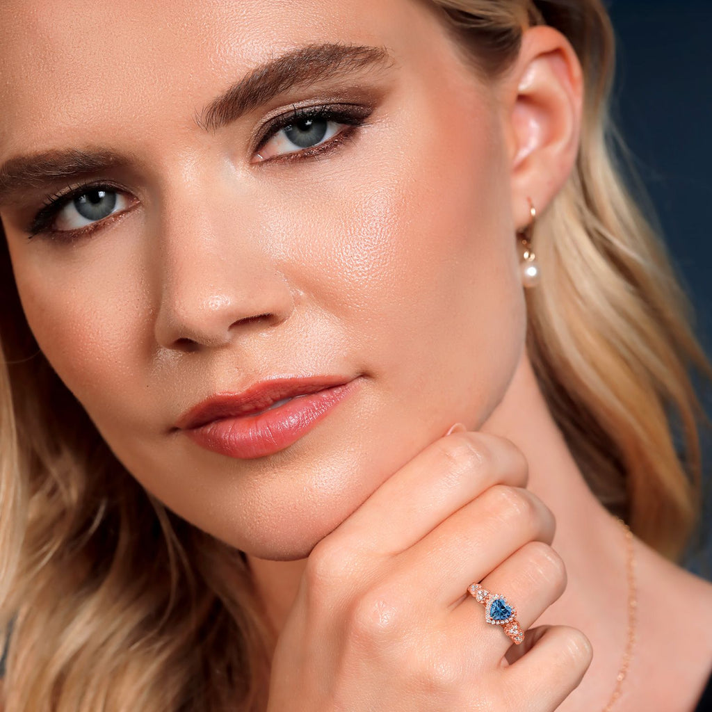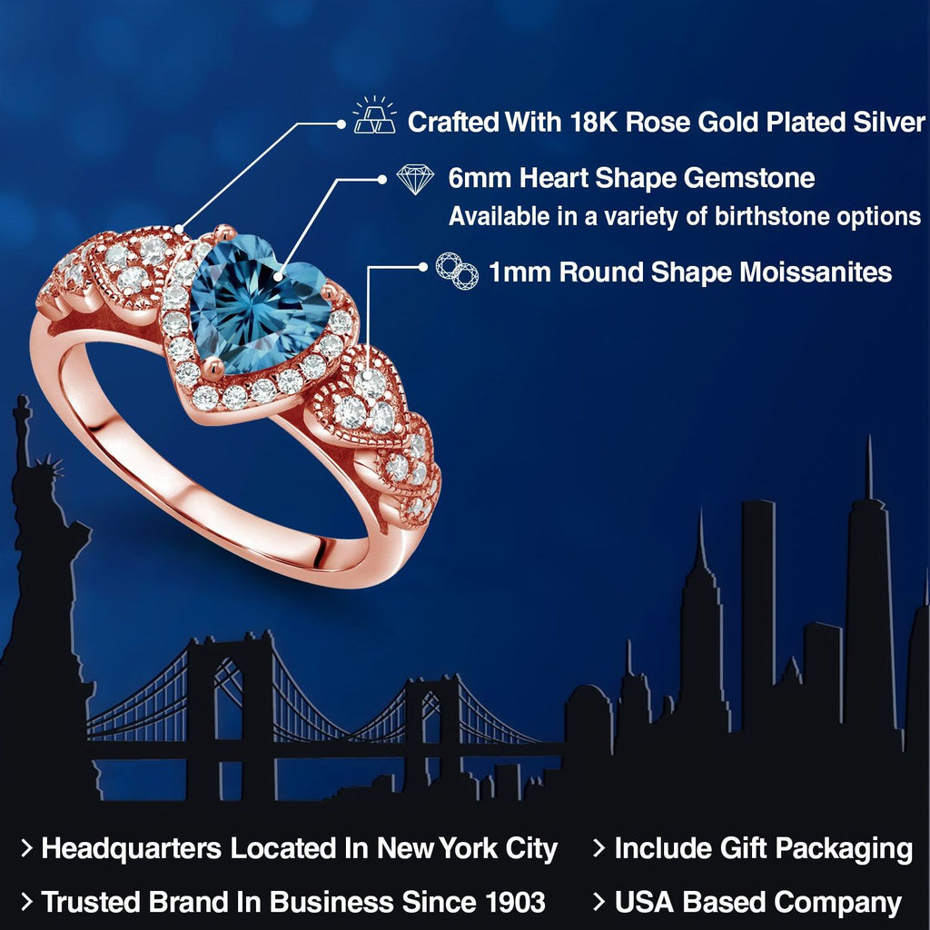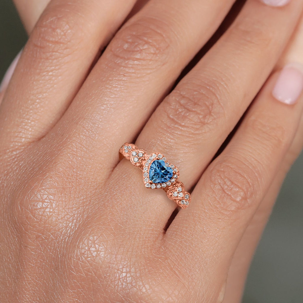 MEASUREMENTS: 6x6mm Heart Shape Coated Persian Blue Moissanite, 1x1mm Round Near Colorless (GH) Moissanite. Total Carat Weight is 0.98 cttw