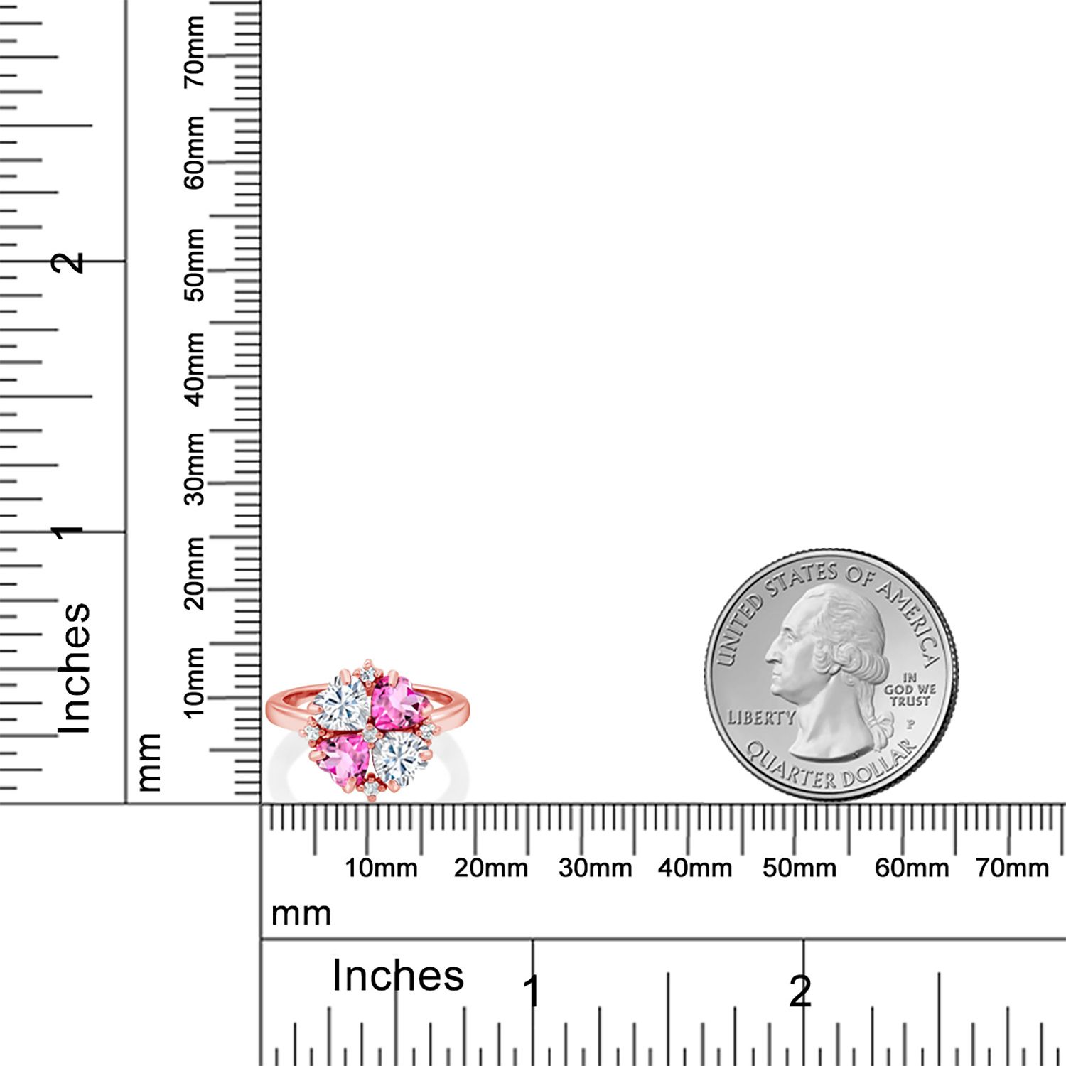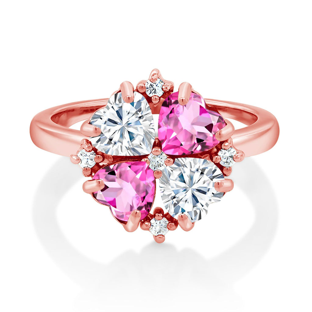 MEASUREMENTS: 5x5mm Heart Shape Near Colorless (GH) Moissanite, 5x5mm Heart Shape Coated Pink Mystic Topaz1.5, x, 1.5, mm Round White Zirconia. Total Carat Weight is 2.12 cttw