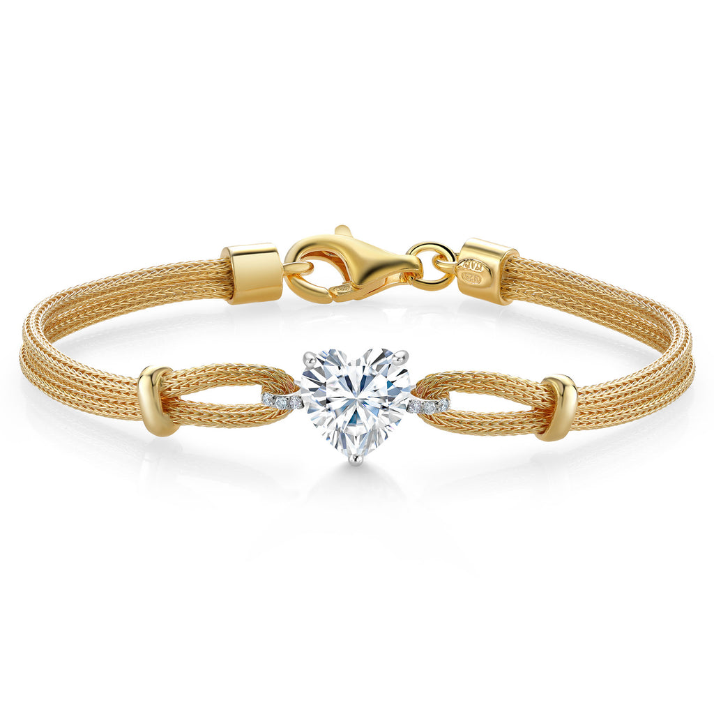 18K Gold Plated Two Tone Sterling Silver White Moissanite and White Lab Grown Diamond Bracelet For Women | 1.84 Cttw | Heart Shape 8MM | 6.5/7/7.5 Inches | Made In Italy