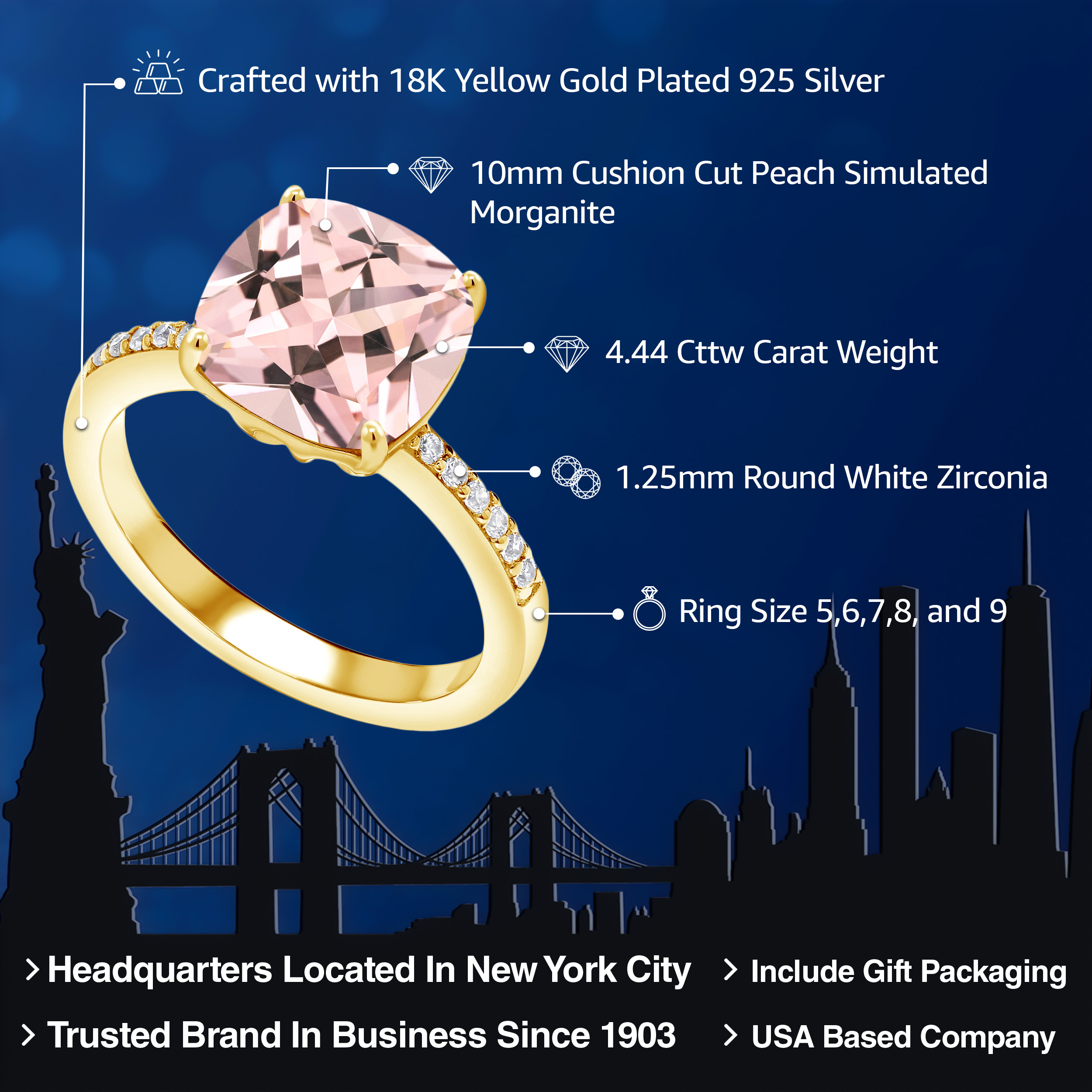 HIGH-QUALITY CRAFTSMANSHIP: Crafted with meticulous attention to detail, this ring combines the durability of sterling silver with the opulent finish of 18K yellow gold plating. The precisely set gemstone ensures lasting beauty and brilliance.