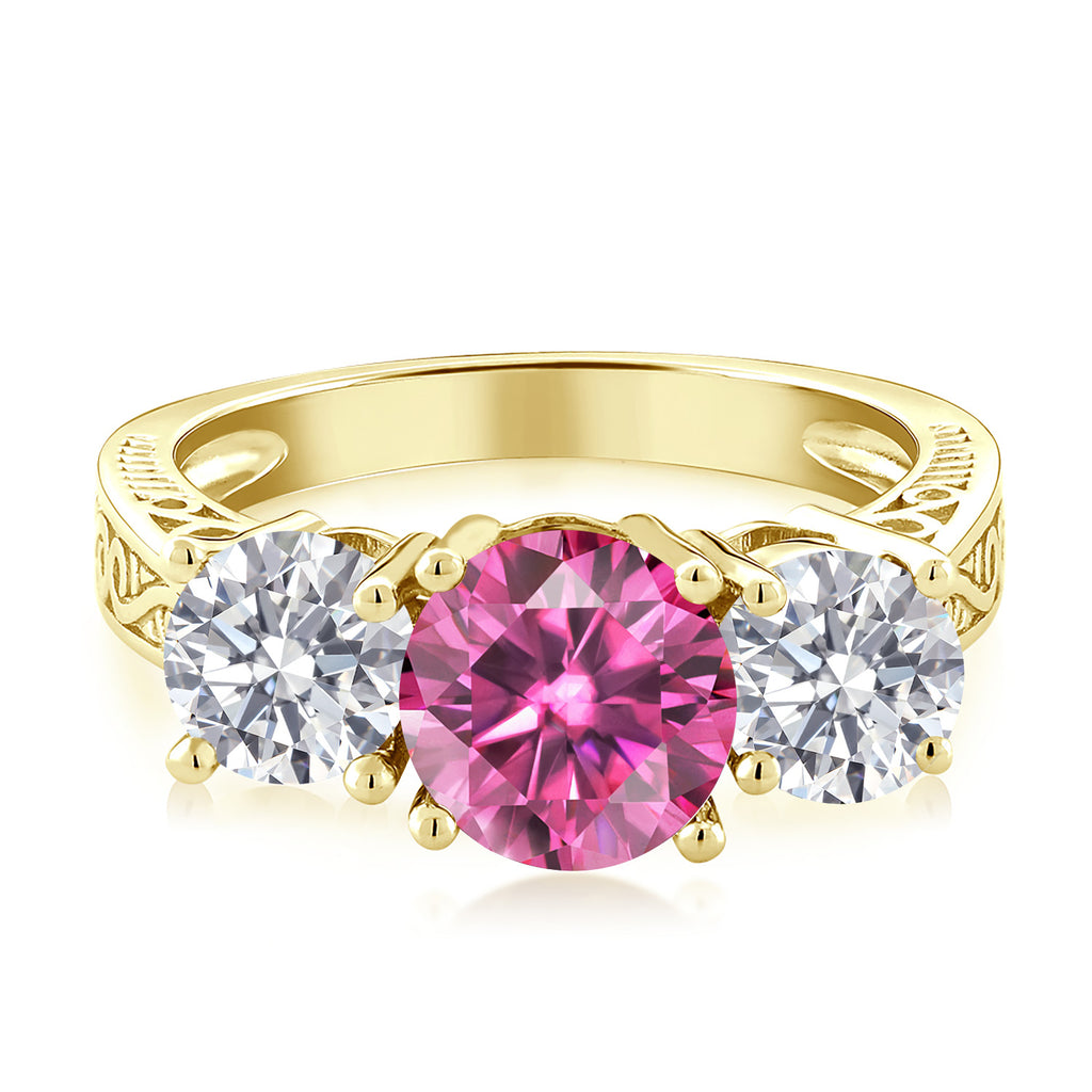 MEASUREMENTS: 7x7mm Round Coated Pink Moissanite, 5x5mm Round E - F Lab Grown Diamond. Total Carat Weight is 2.2 cttw