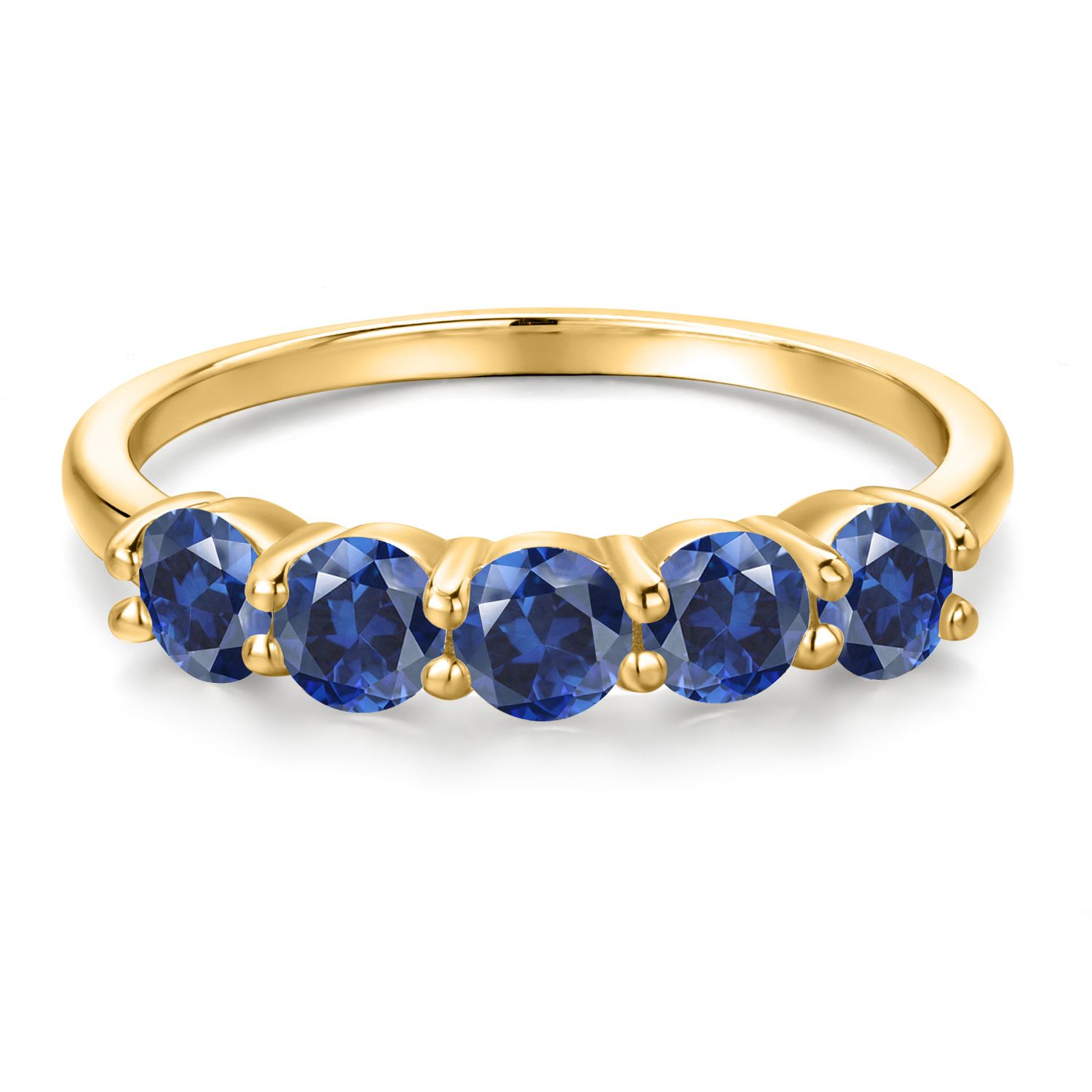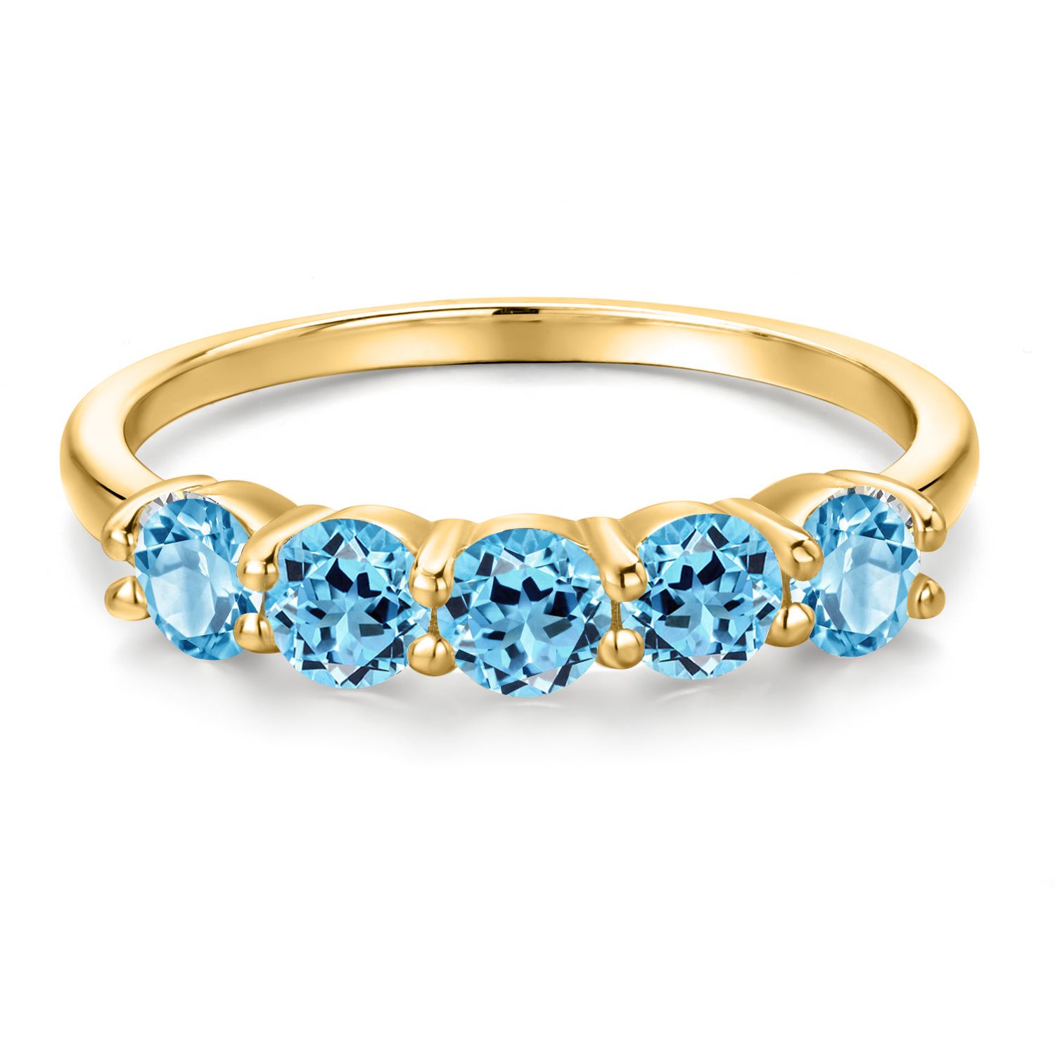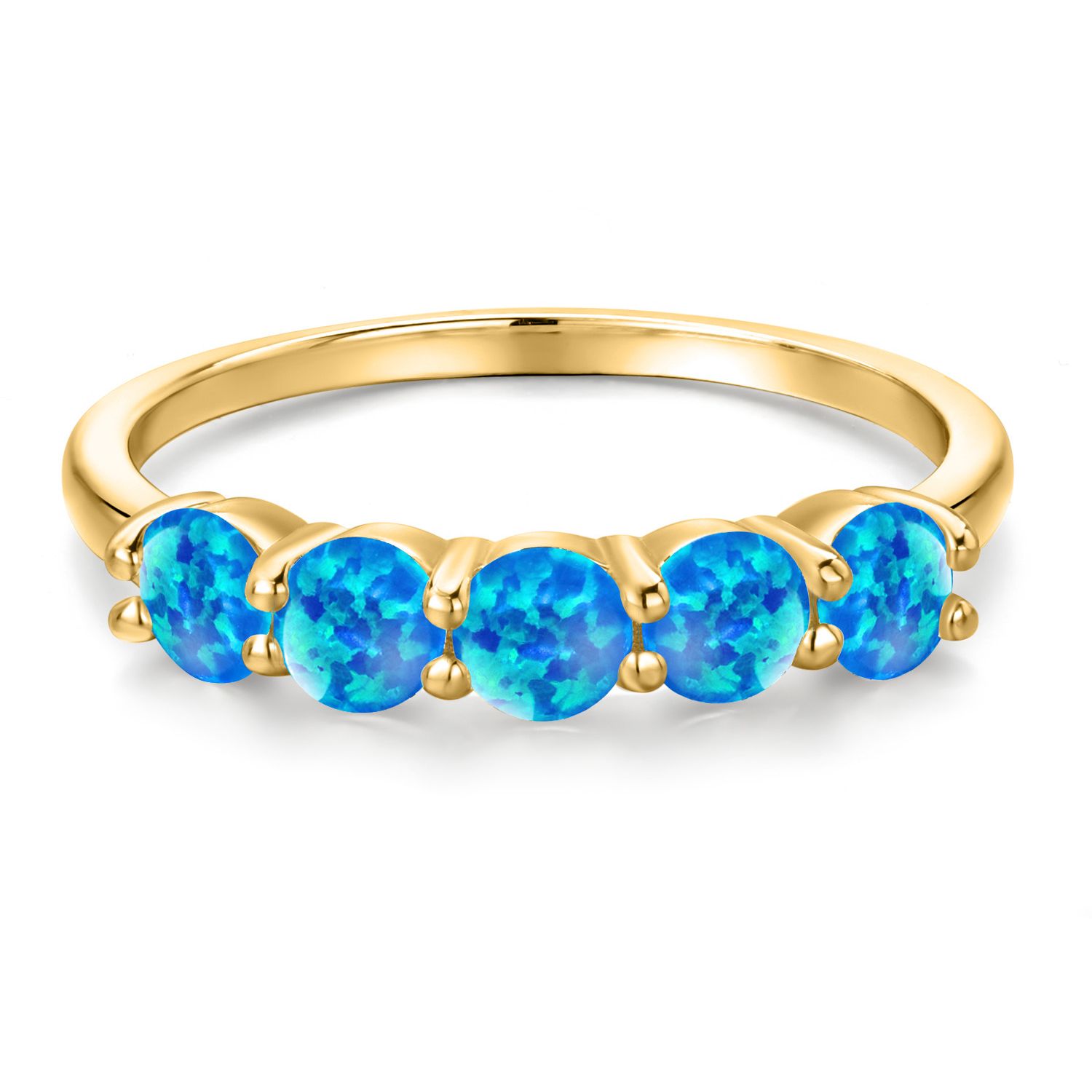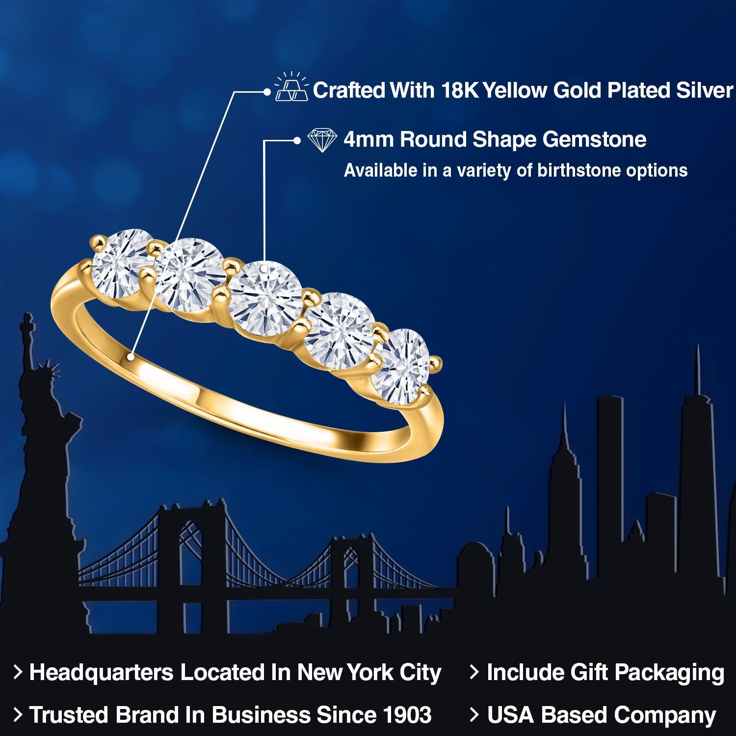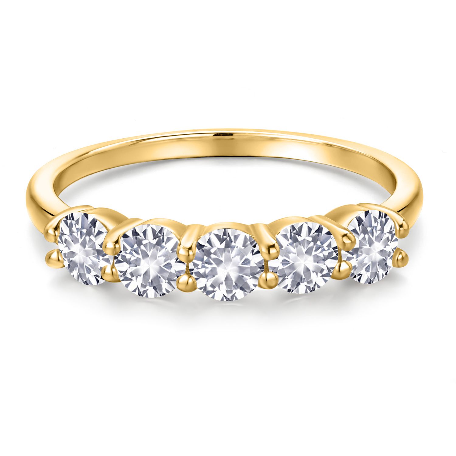 18K Yellow Gold Plated Silver 4MM Round Gemstone Birthstone 5-Stone Wedding Band Ring | Five Stone Engagement Anniversary Promise Ring For Women | Available in Size 5, 6, 7, 8, 9