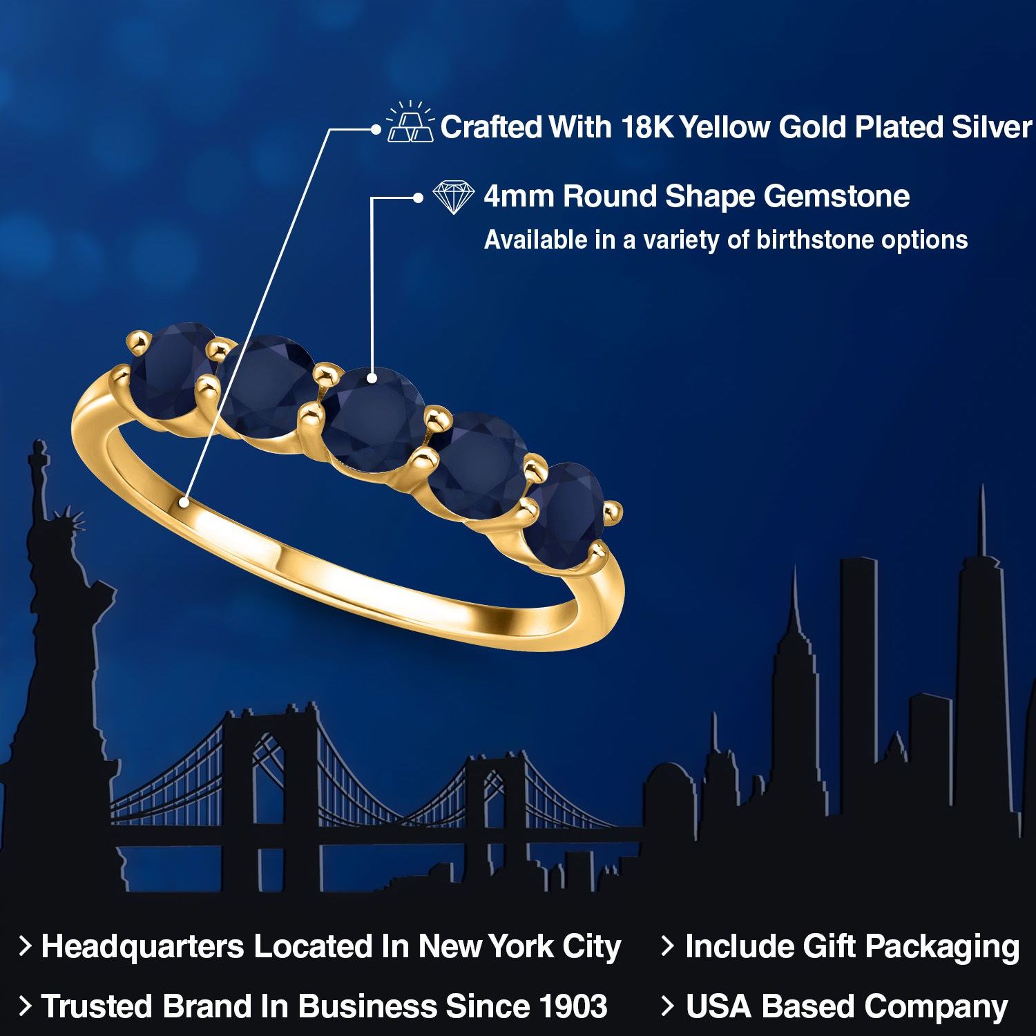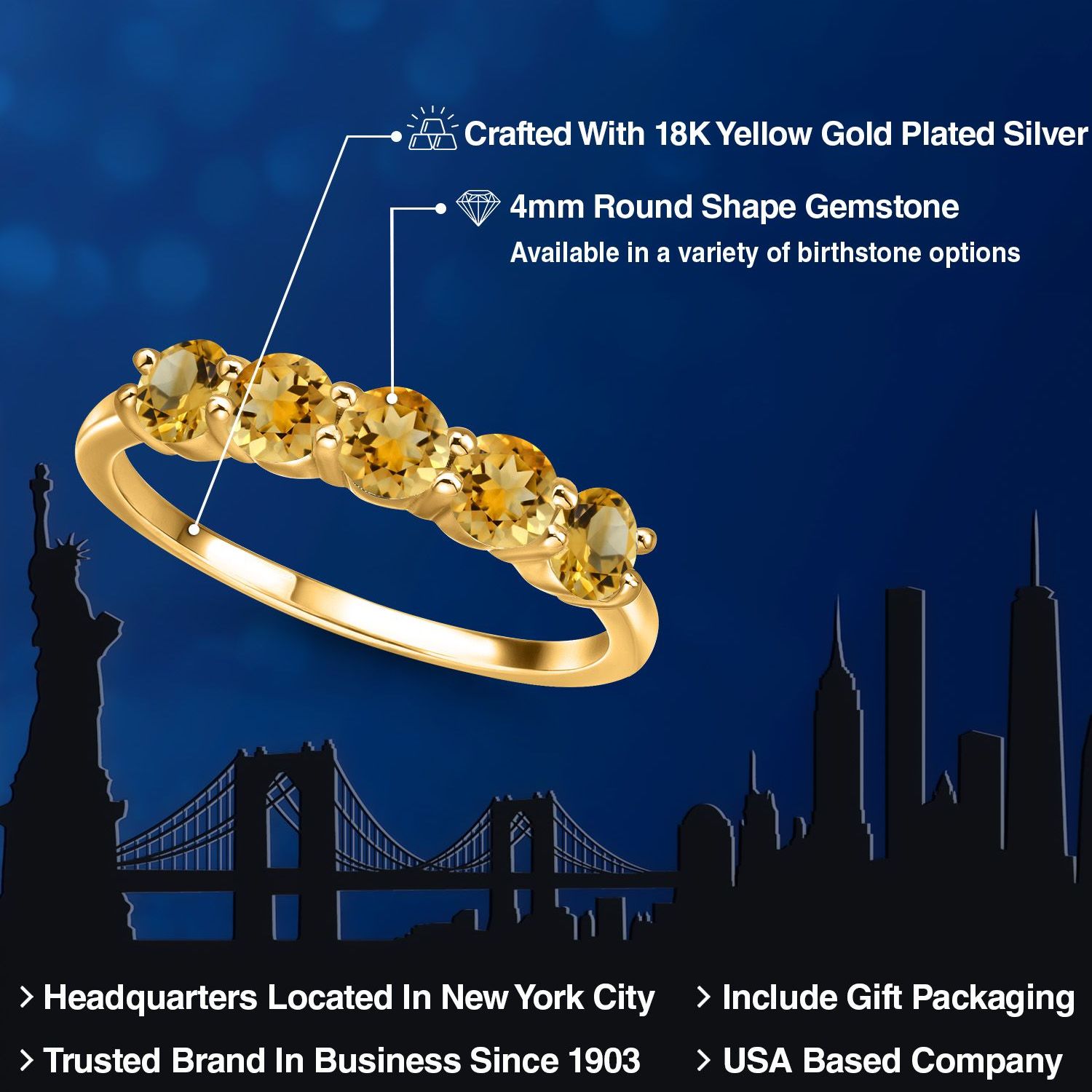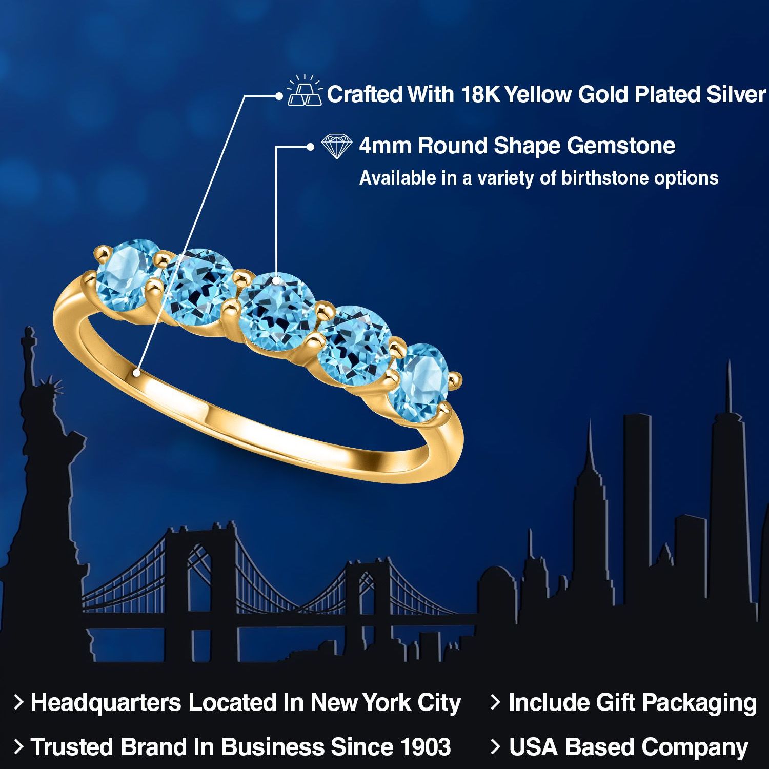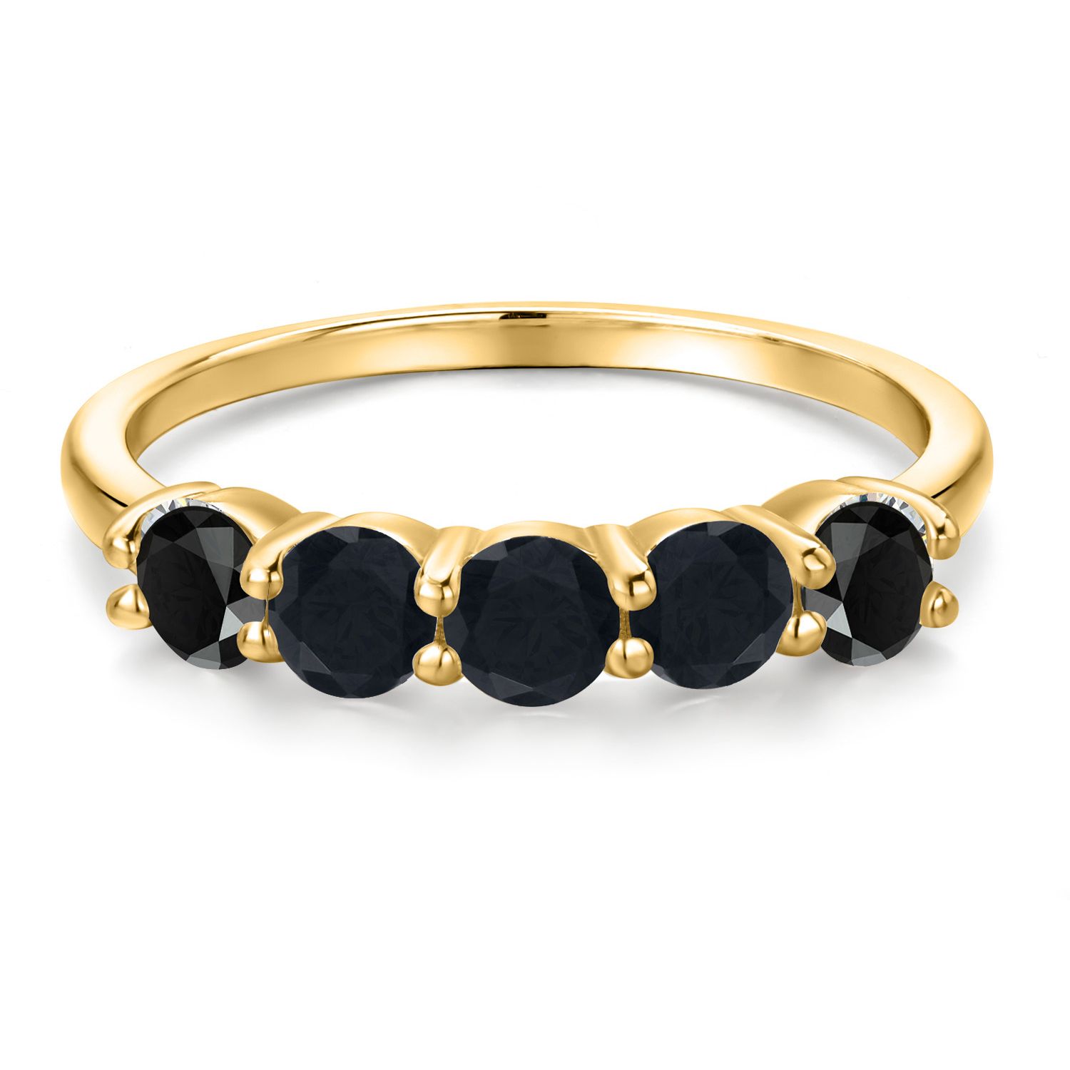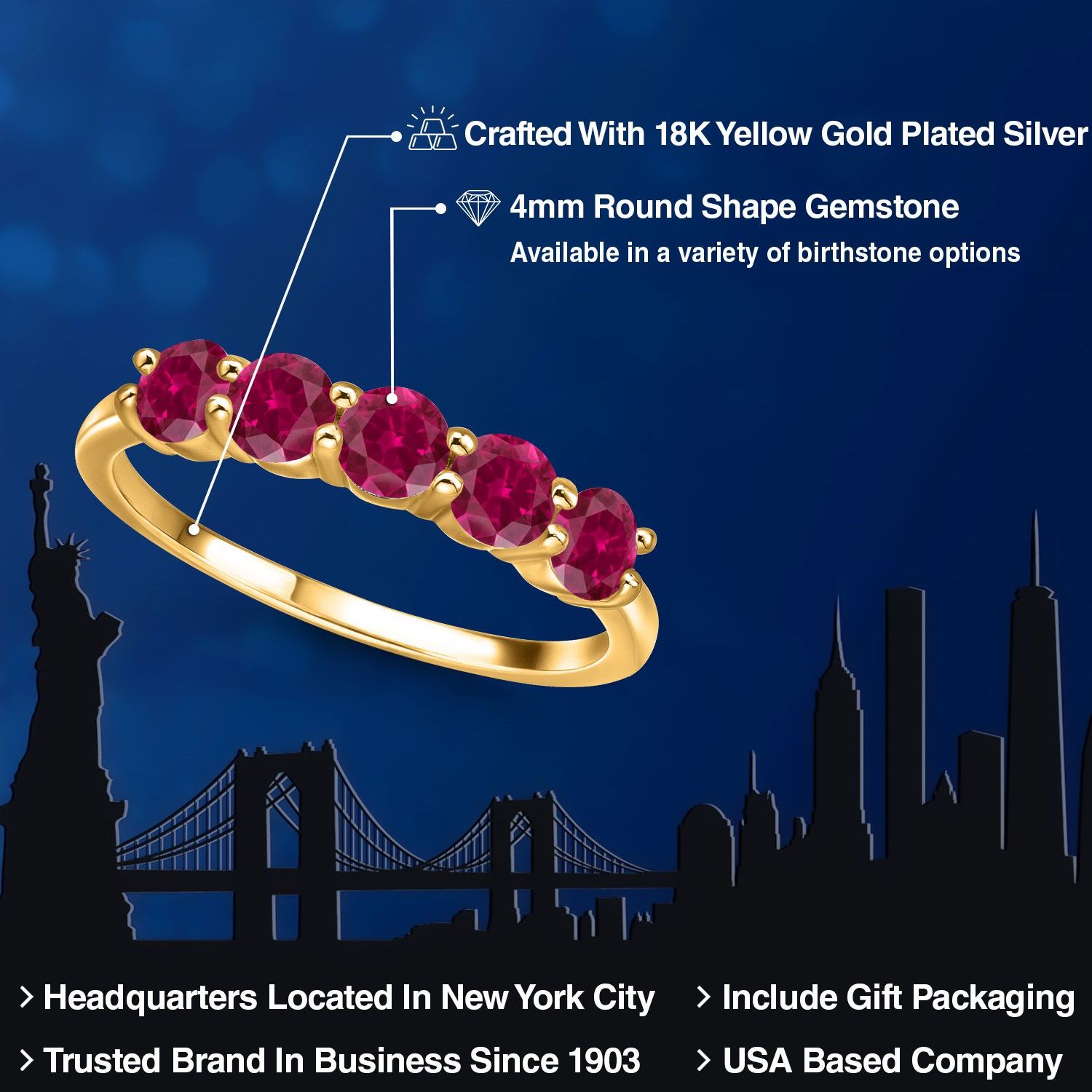 18K Yellow Gold Plated Silver 4MM Round Gemstone Birthstone 5-Stone Wedding Band Ring | Five Stone Engagement Anniversary Promise Ring For Women | Available in Size 5, 6, 7, 8, 9