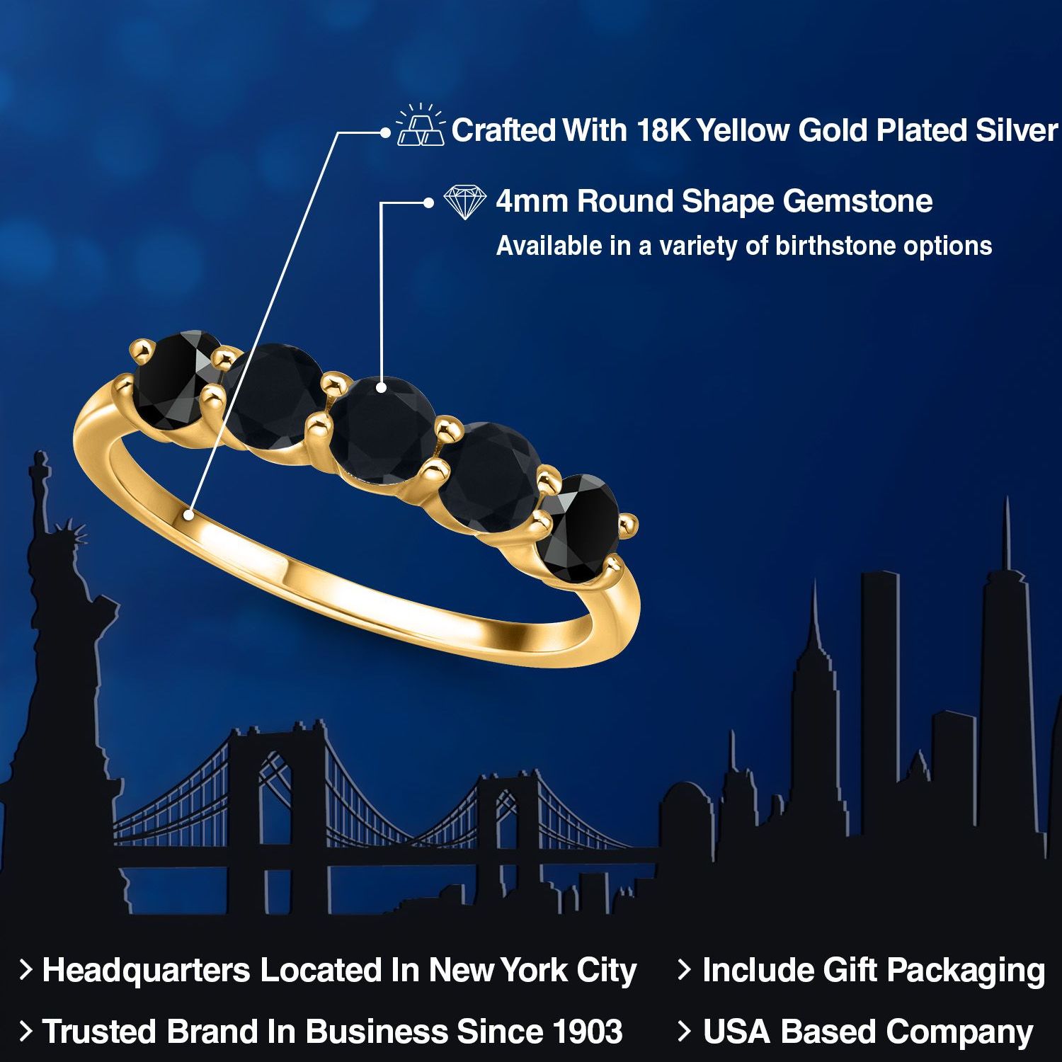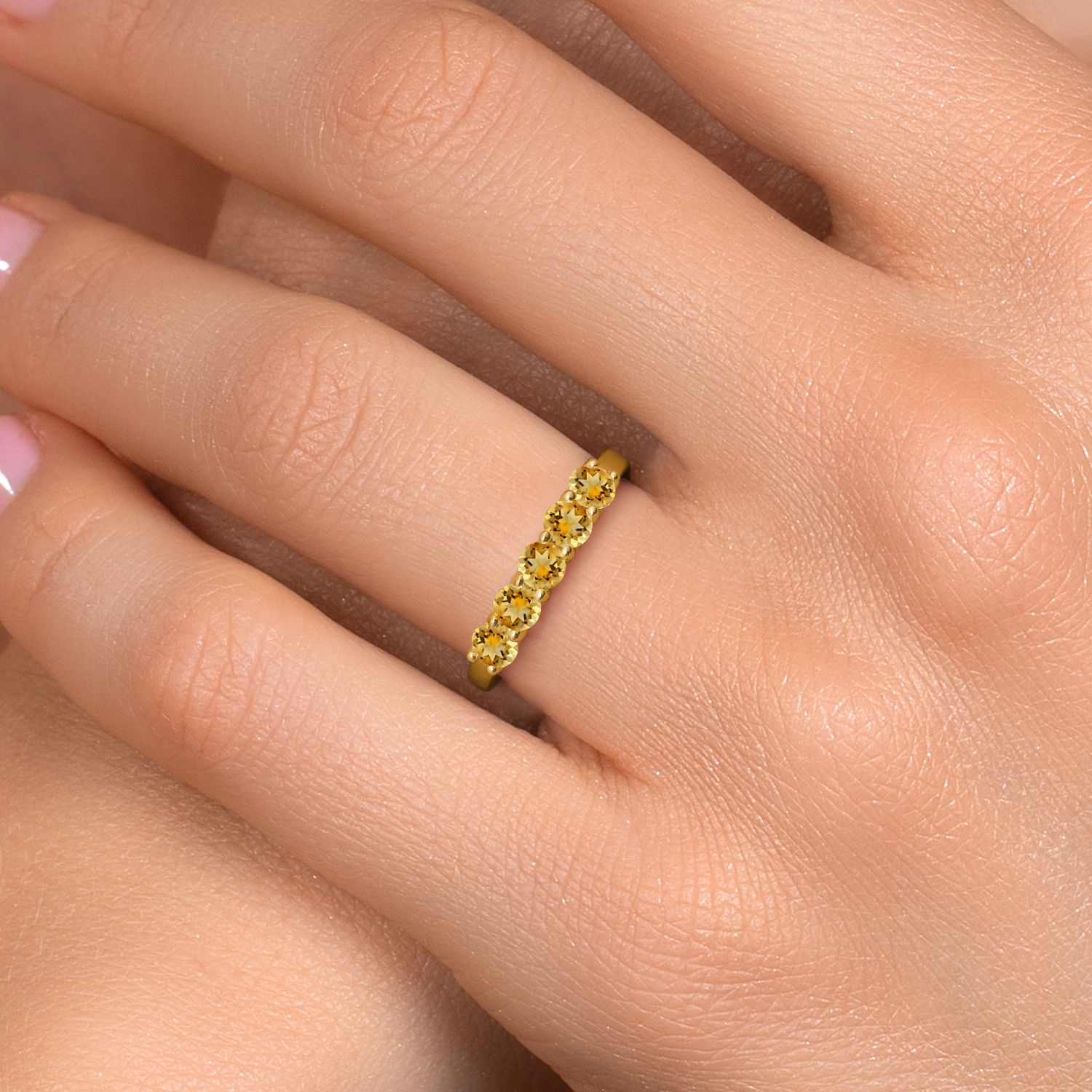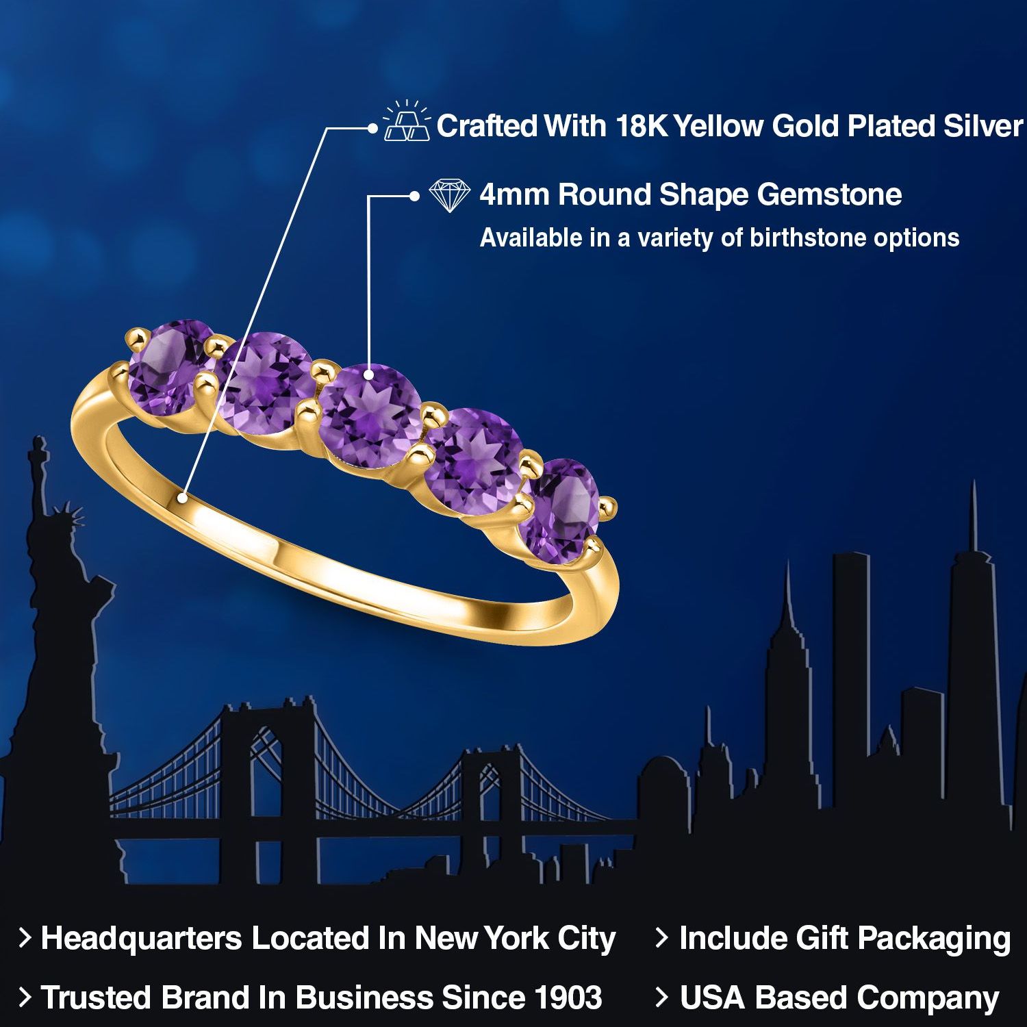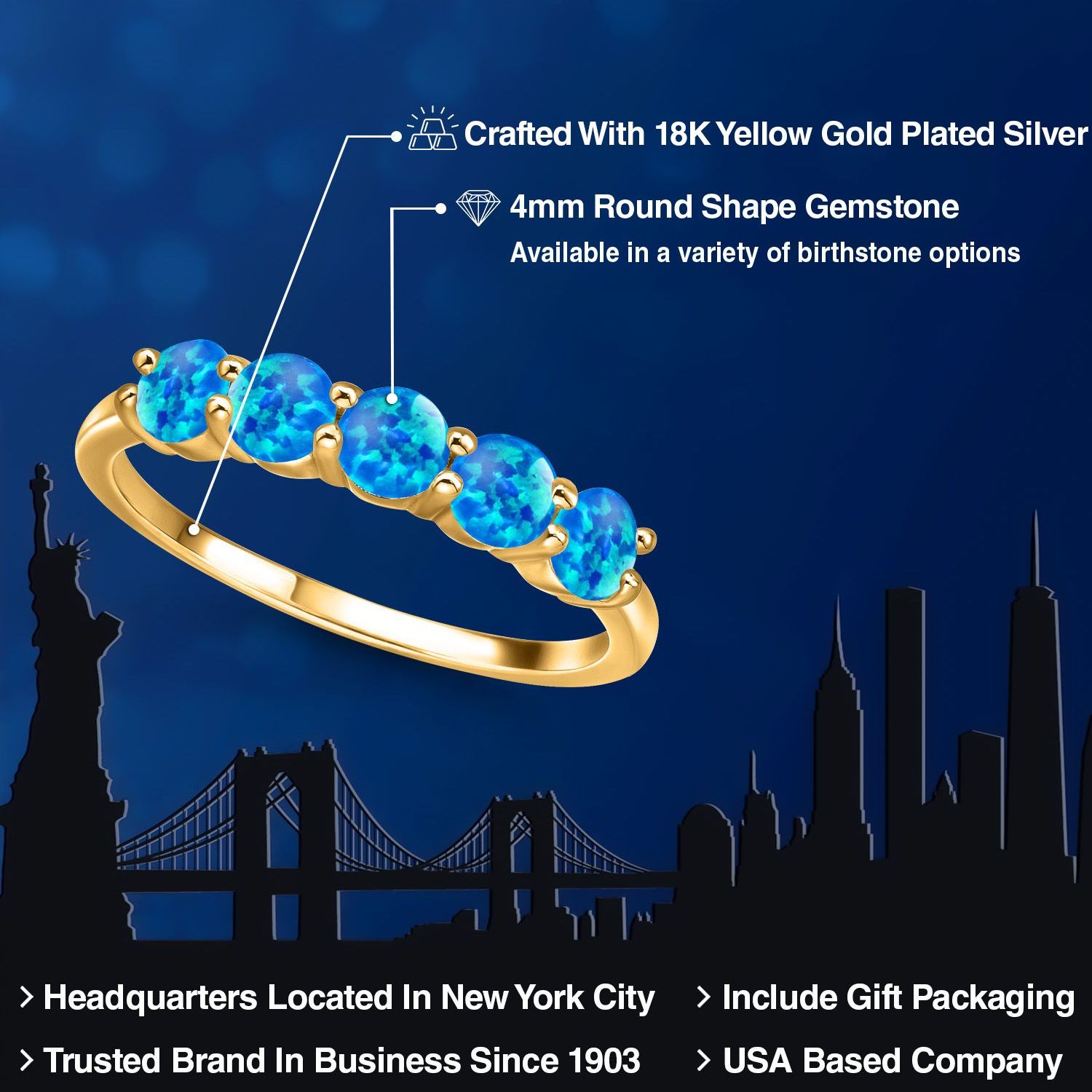 18K Yellow Gold Plated Silver 4MM Round Gemstone Birthstone 5-Stone Wedding Band Ring | Five Stone Engagement Anniversary Promise Ring For Women | Available in Size 5, 6, 7, 8, 9