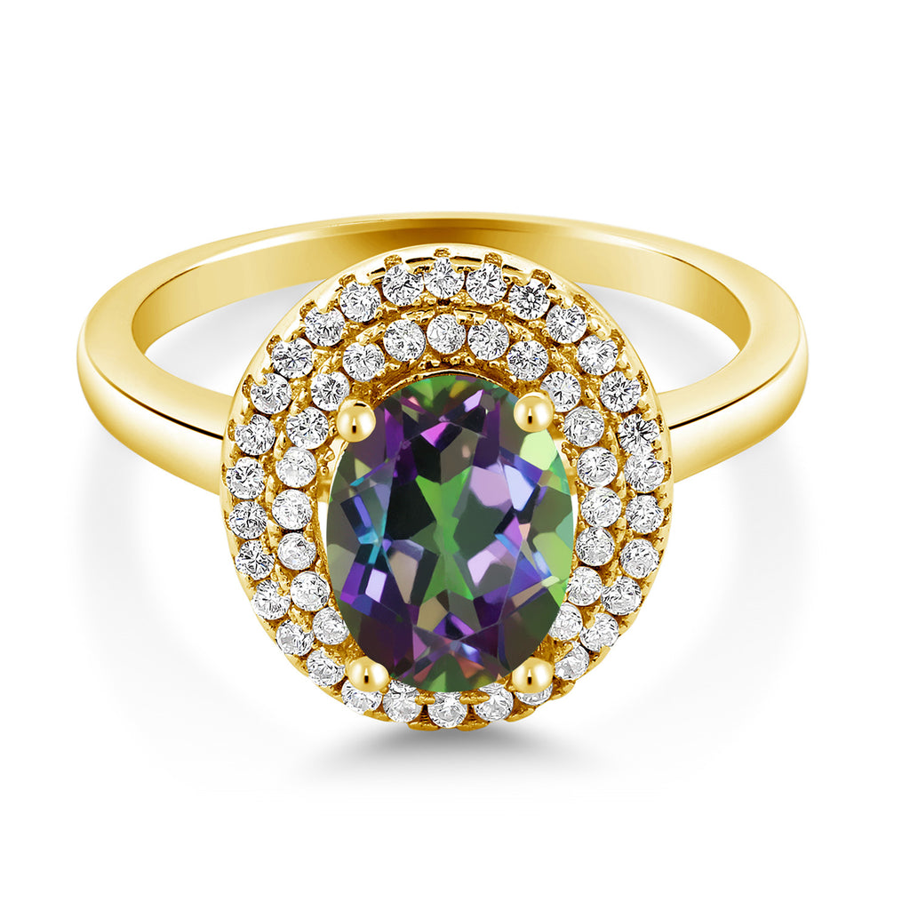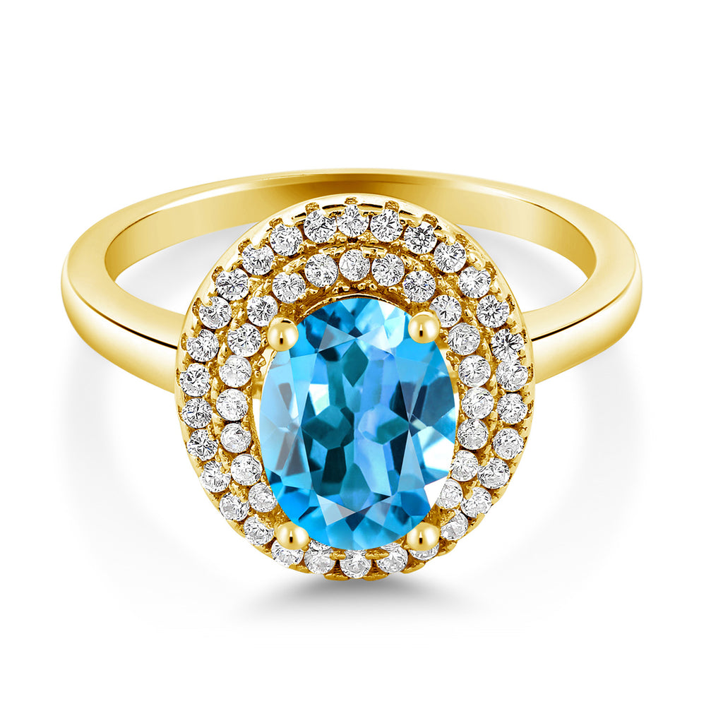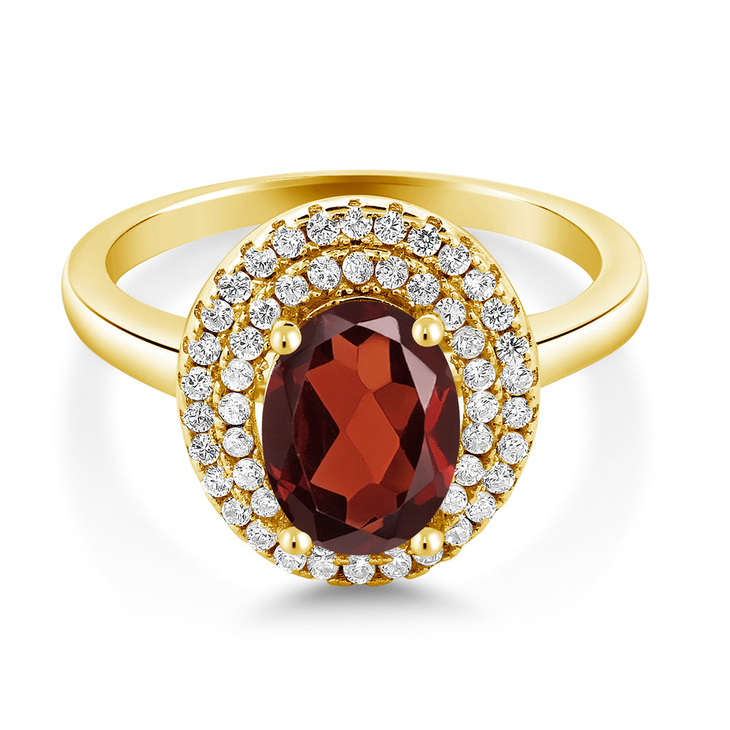 18K Yellow Gold Plated Silver 8X6MM Oval Gemstone Birthstone Double Halo Engagement Ring | Wedding Anniversary Promise Ring For Women | Size 5,6,7,8,9