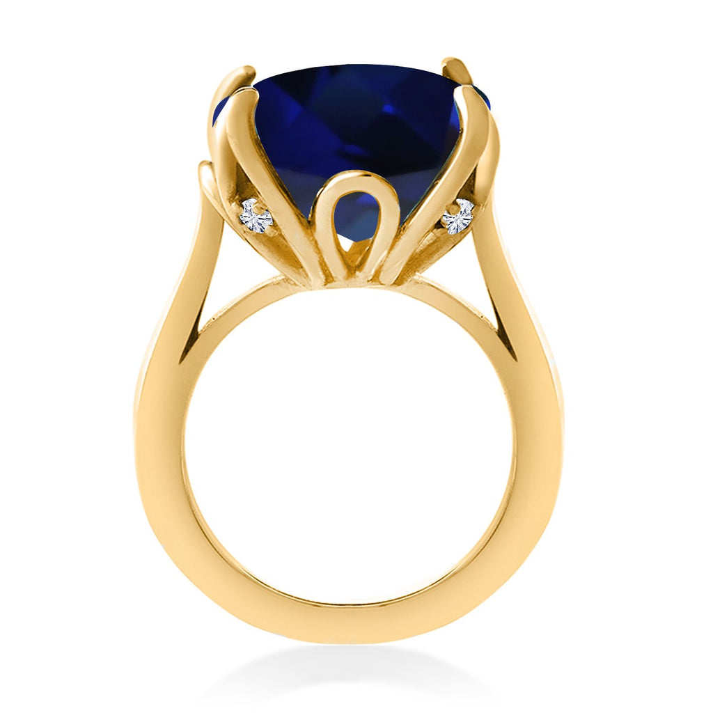 18K Yellow Gold Plated Silver Blue Created Sapphire and White Created Sapphire Engagement Ring For Women (14.12 Cttw, 14MM Cushion, Available in Size 5,6,7,8,9)
