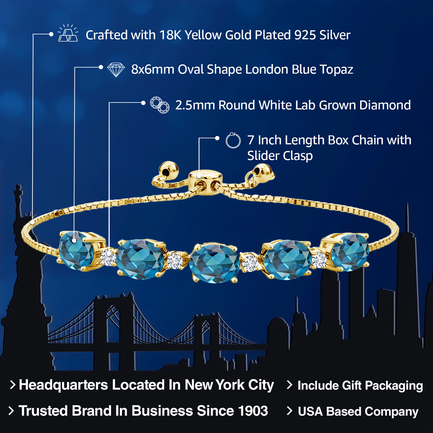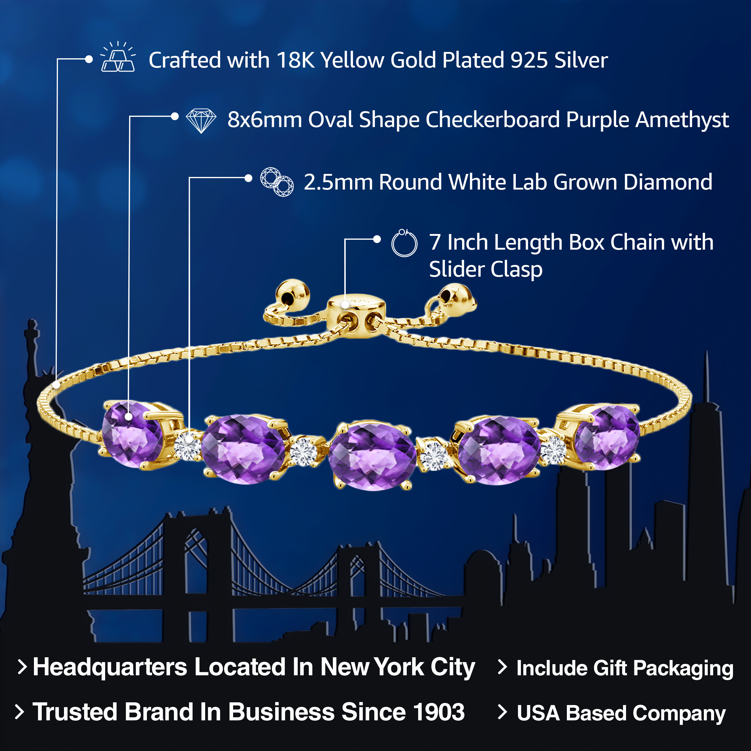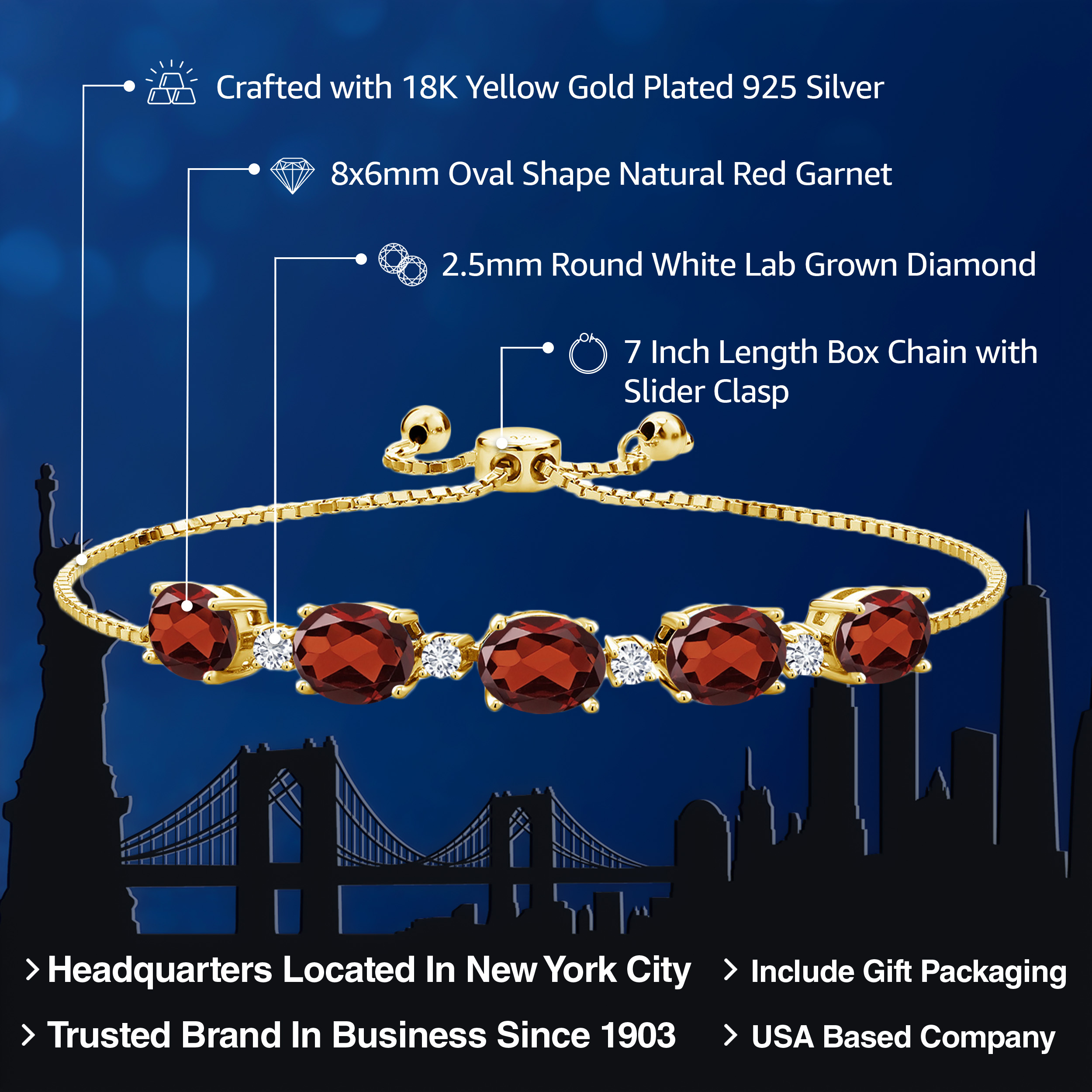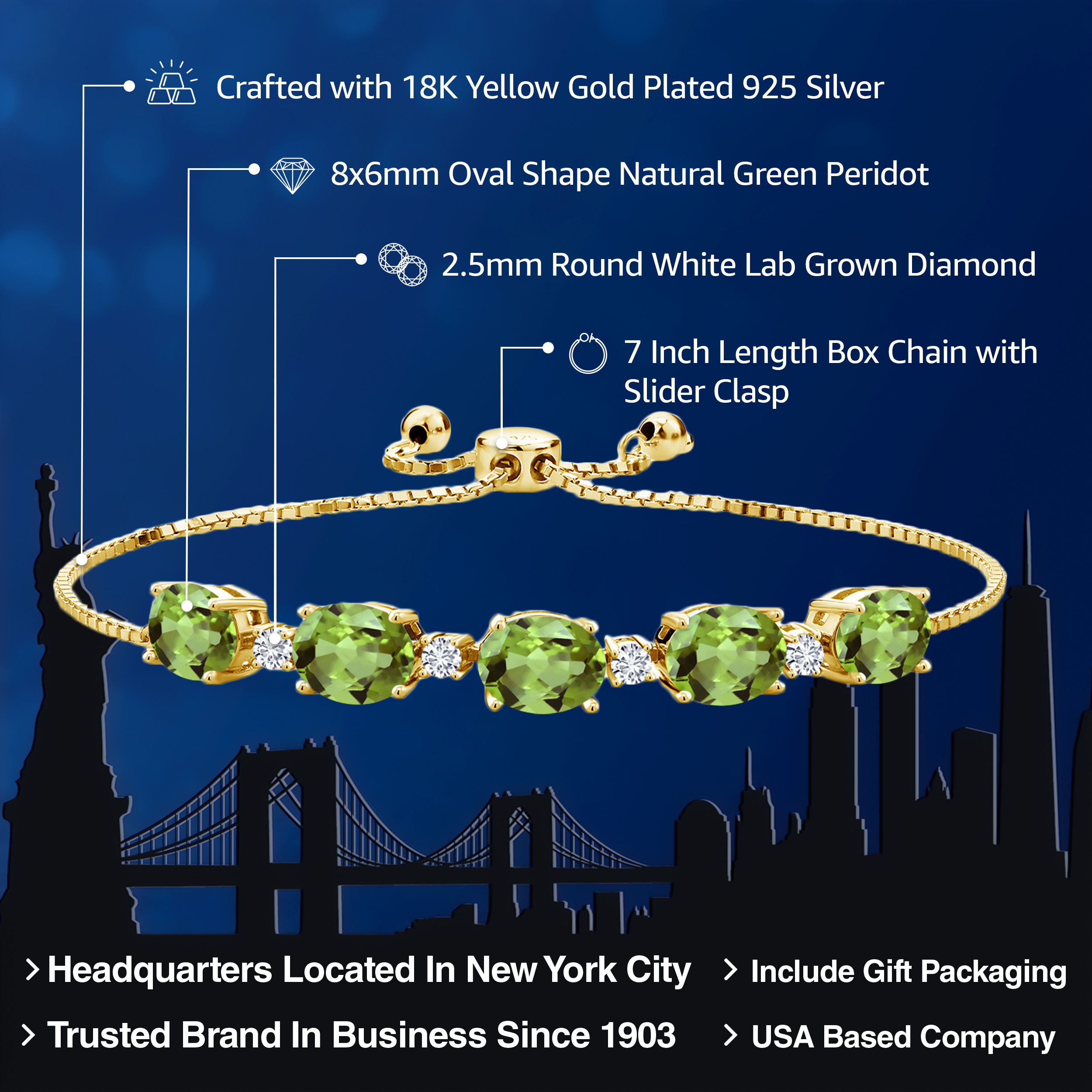 18K Yellow Gold Plated Silver Gemstone Birthstone and White Lab Grown Diamond Tennis Bracelet for Women | Oval 8X6MM with Round 2.5MM Accents | Adjustable Bolo Chain | Fine Jewelry for Her Mom Wife