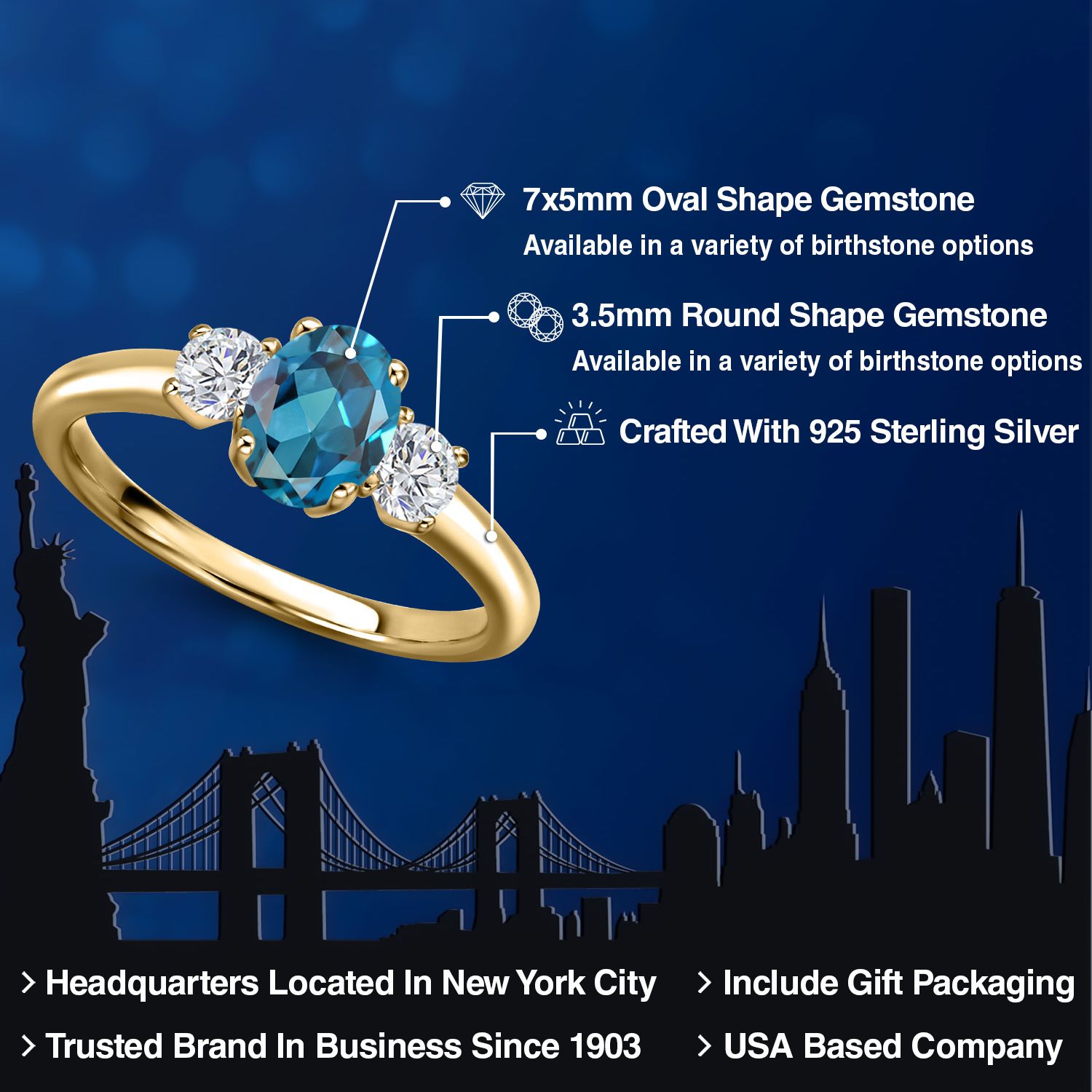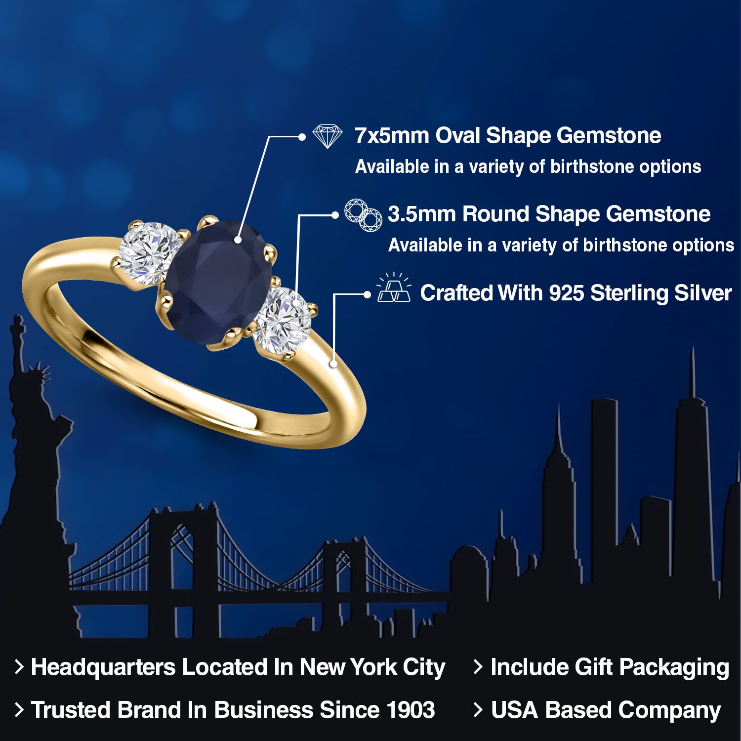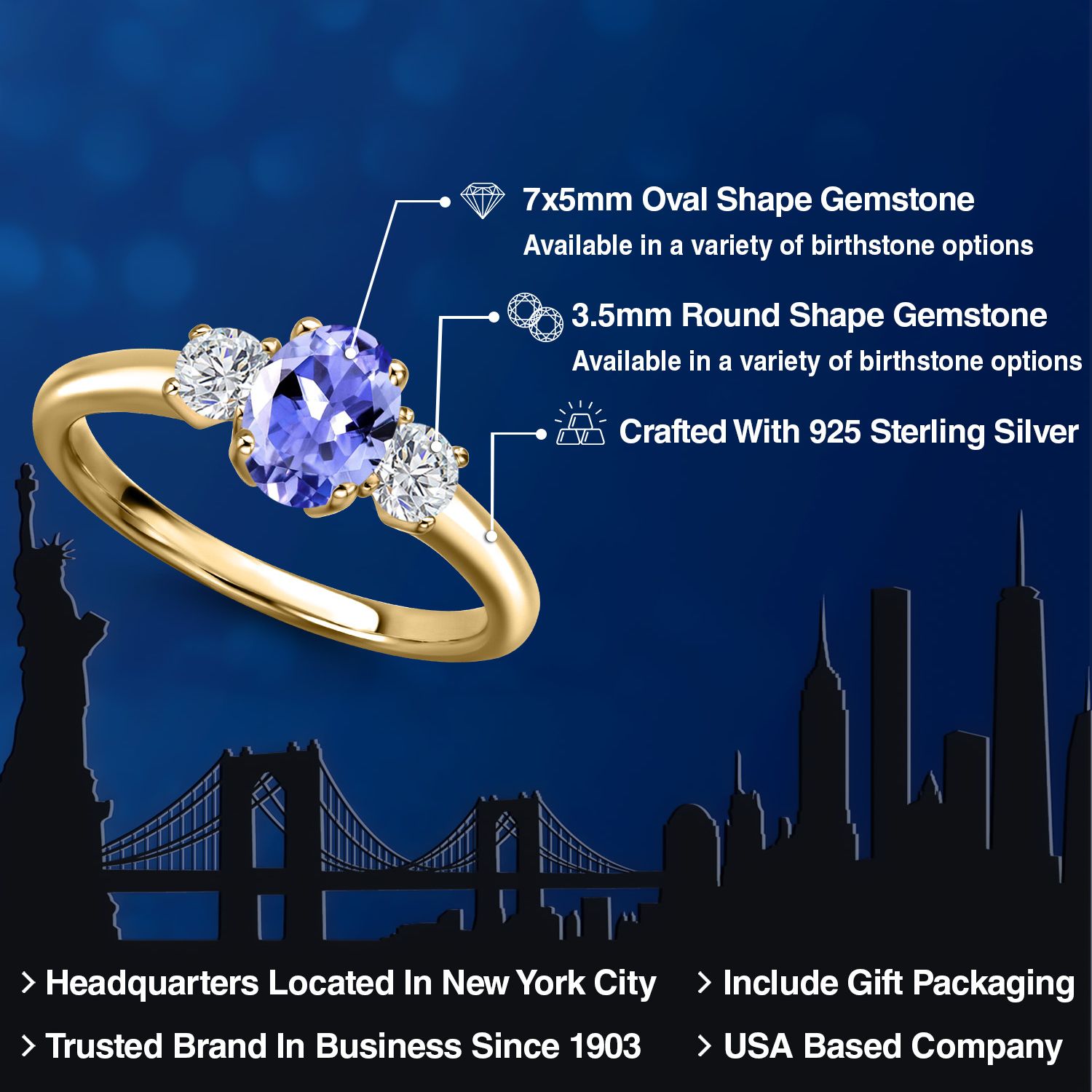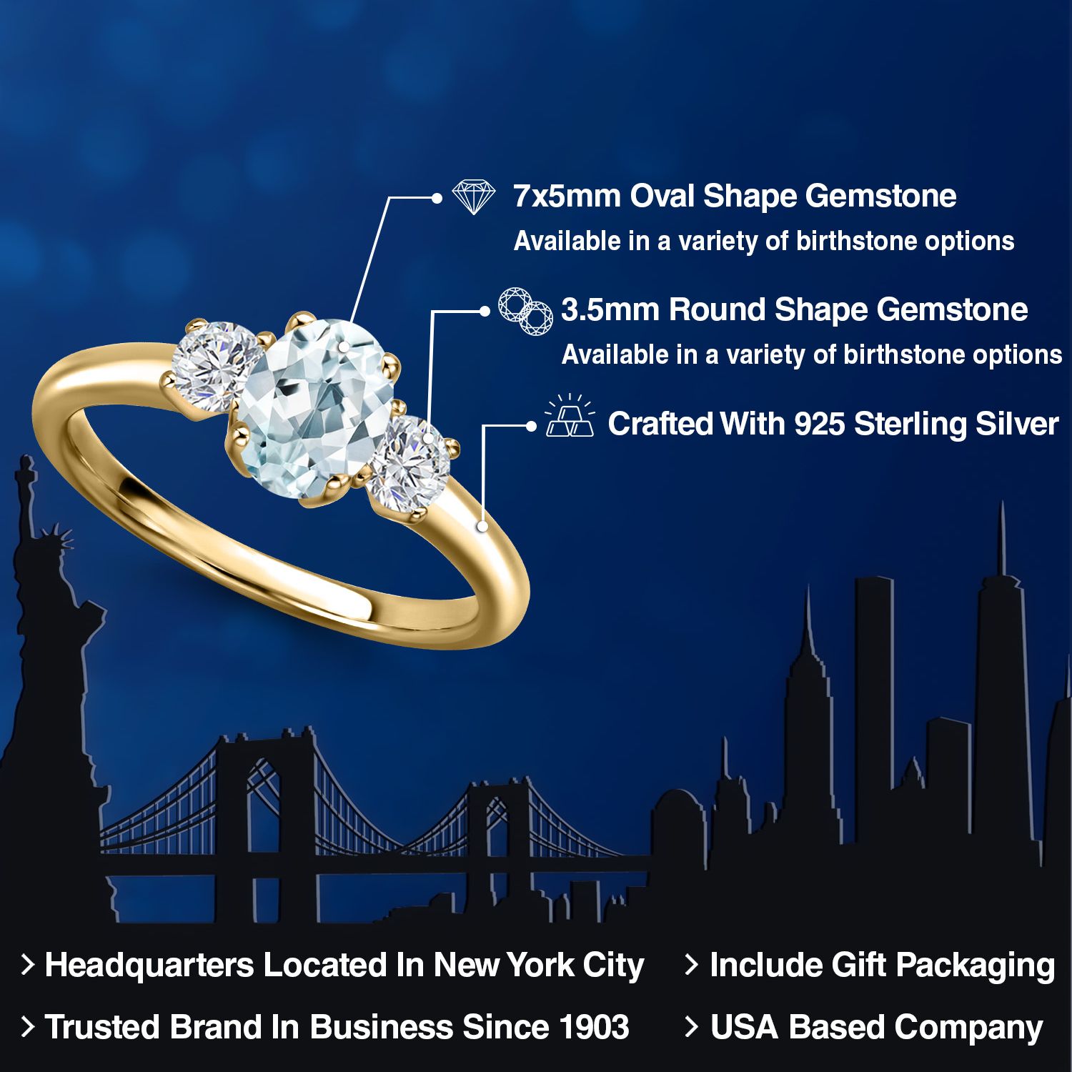 18K Yellow Gold Plated Silver Gemstone Birthstone and White Lab Grown Diamond 3-Stone Engagement Ring for Women | Oval 7X5MM and Round 3MM | Wedding Anniversary Promise Ring | Sizes 5, 6, 7, 8, 9
