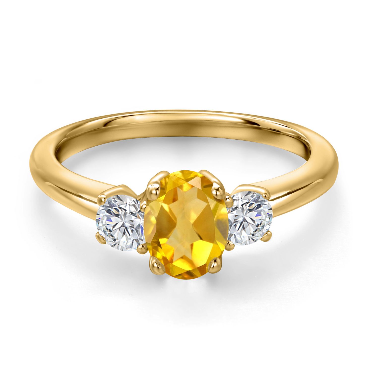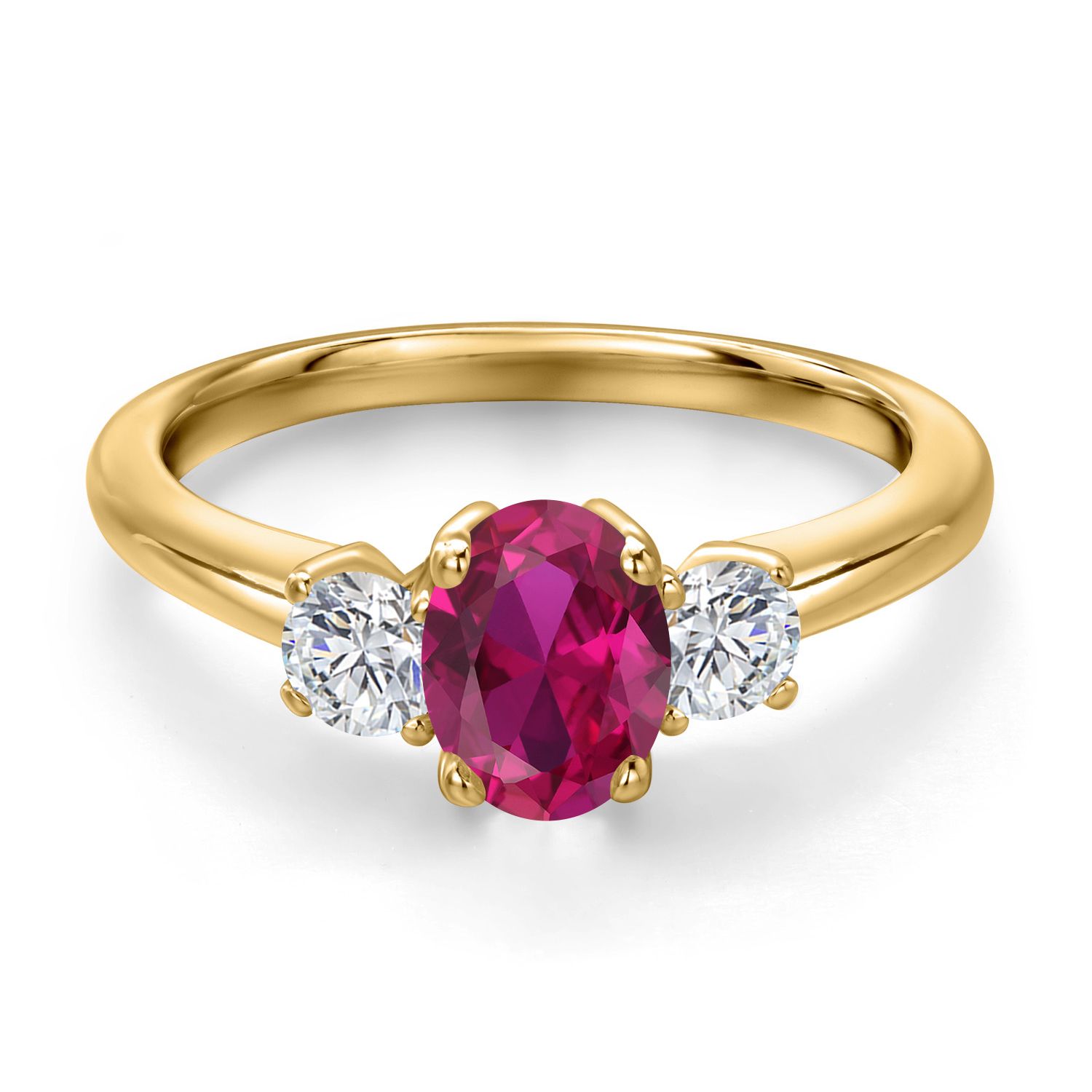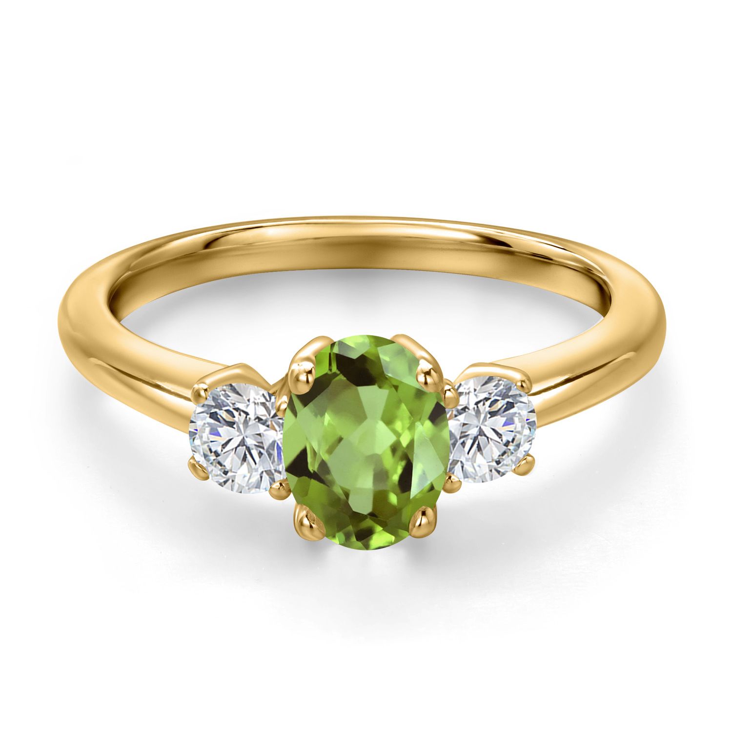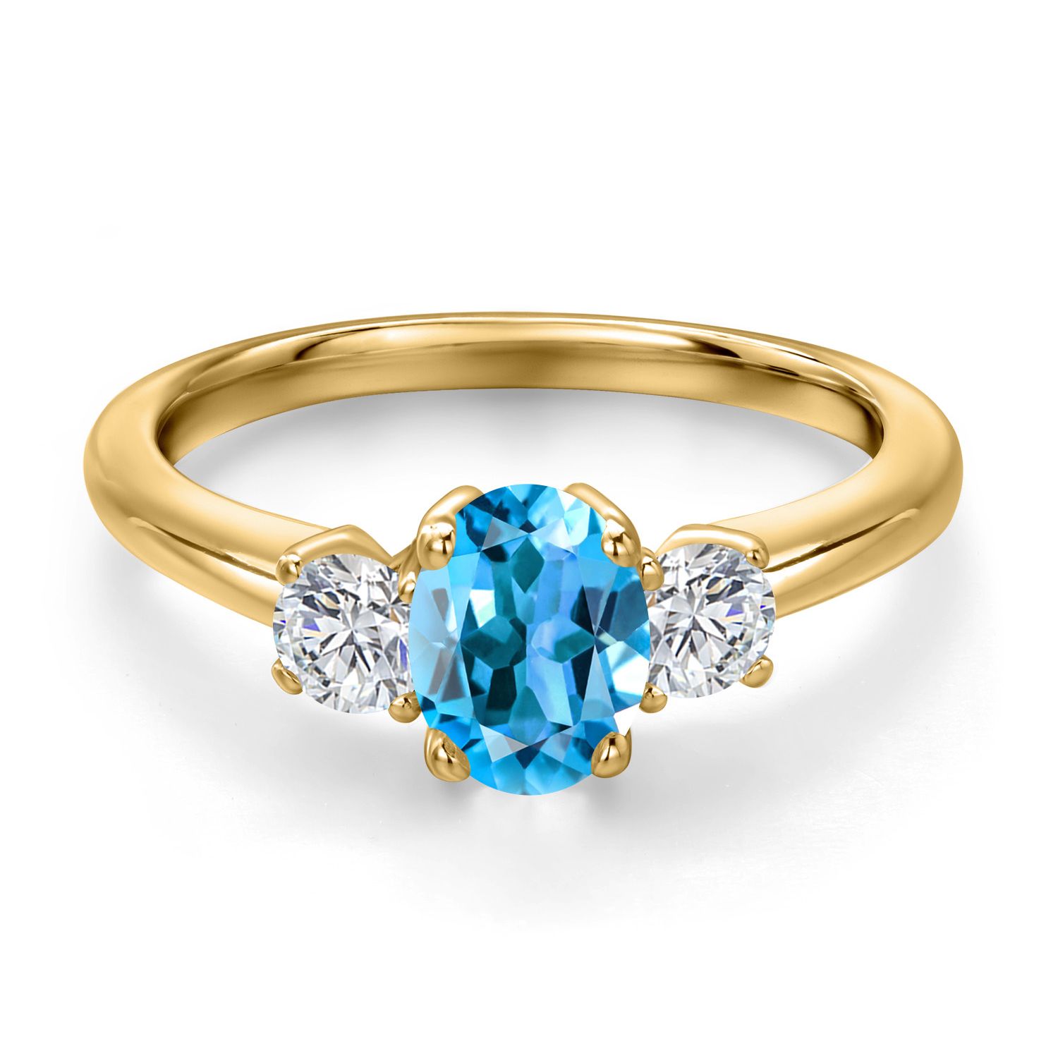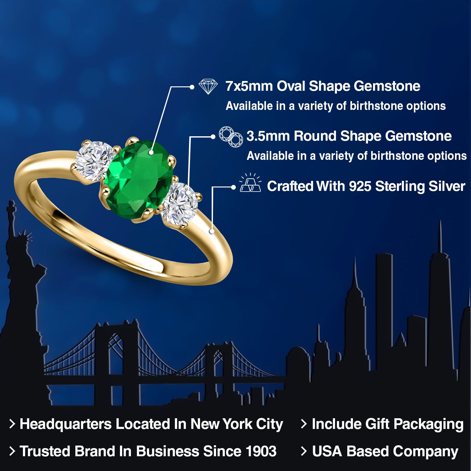 18K Yellow Gold Plated Silver Gemstone Birthstone and White Lab Grown Diamond 3-Stone Engagement Ring for Women | Oval 7X5MM and Round 3MM | Wedding Anniversary Promise Ring | Sizes 5, 6, 7, 8, 9