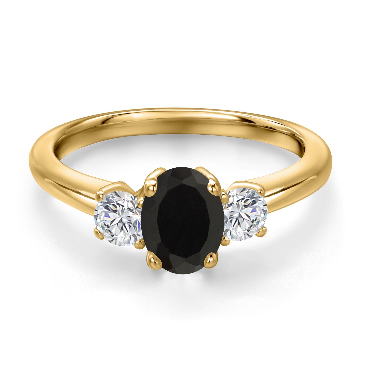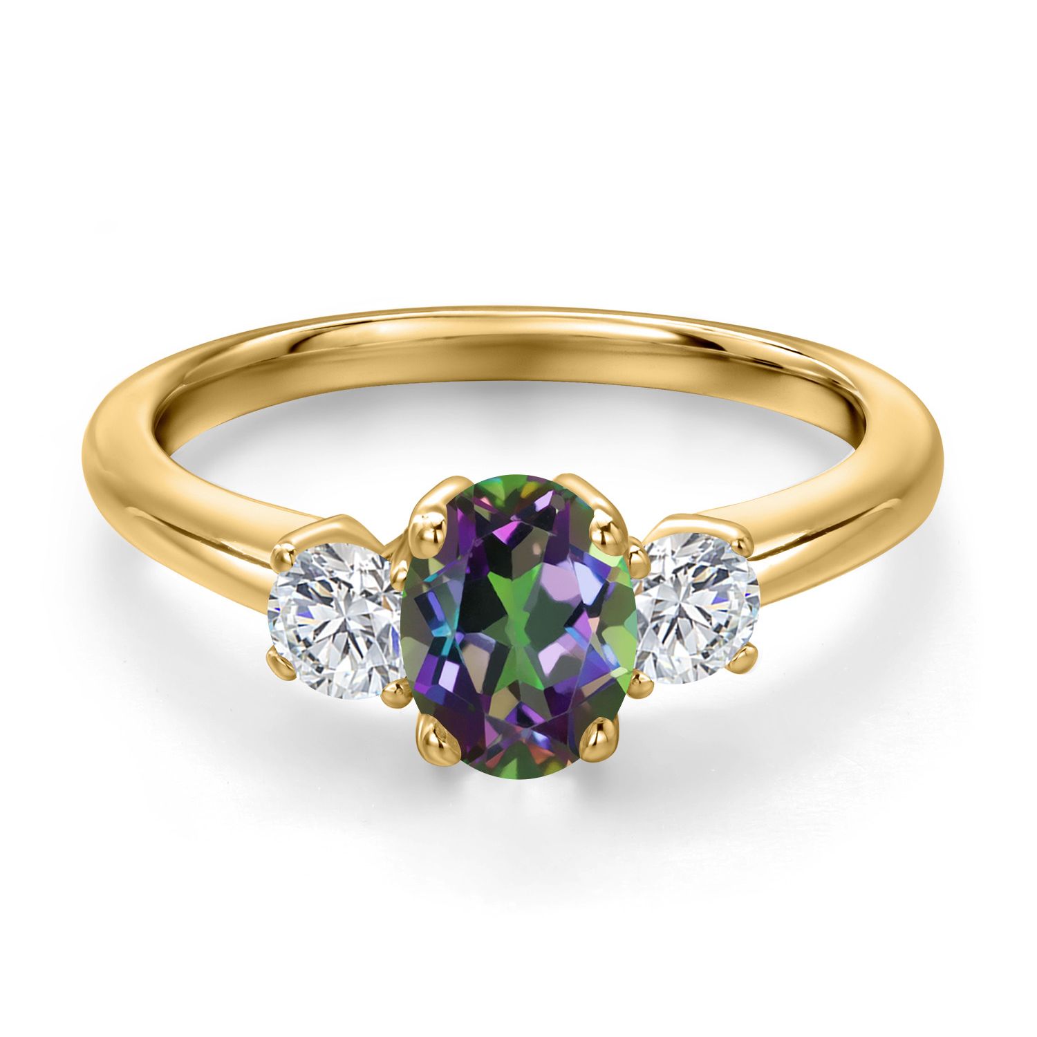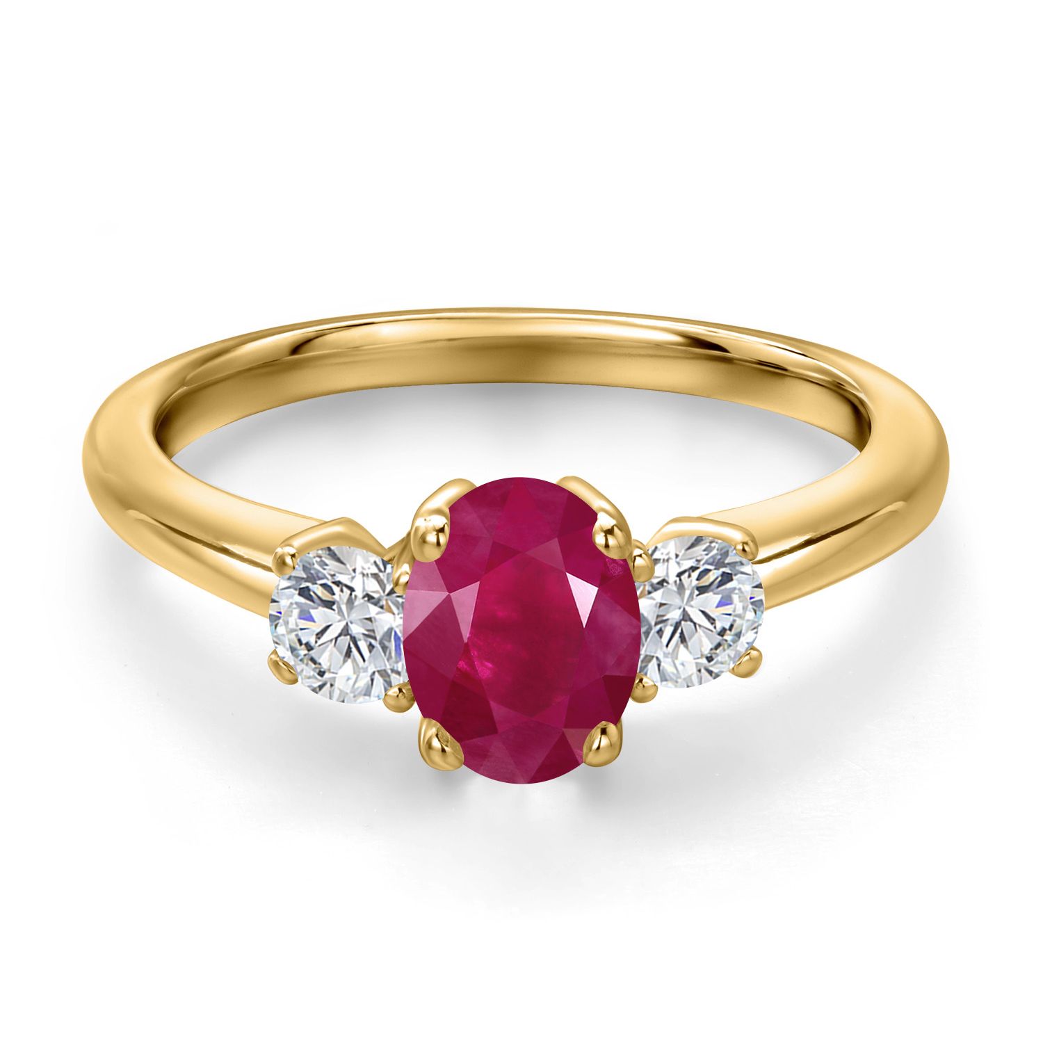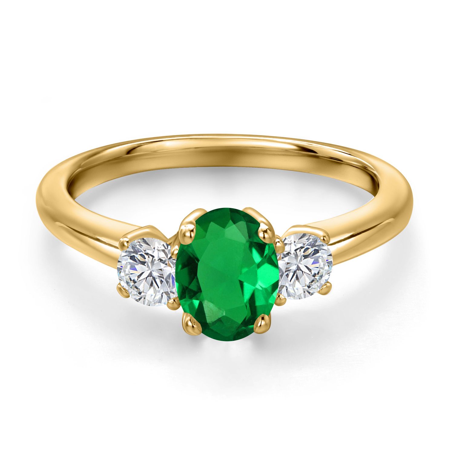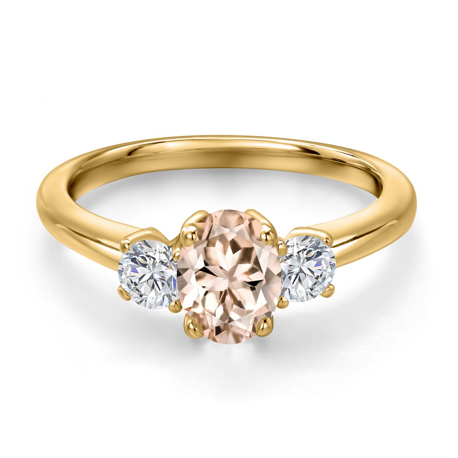 18K Yellow Gold Plated Silver Gemstone Birthstone and White Lab Grown Diamond 3-Stone Engagement Ring for Women | Oval 7X5MM and Round 3MM | Wedding Anniversary Promise Ring | Sizes 5, 6, 7, 8, 9