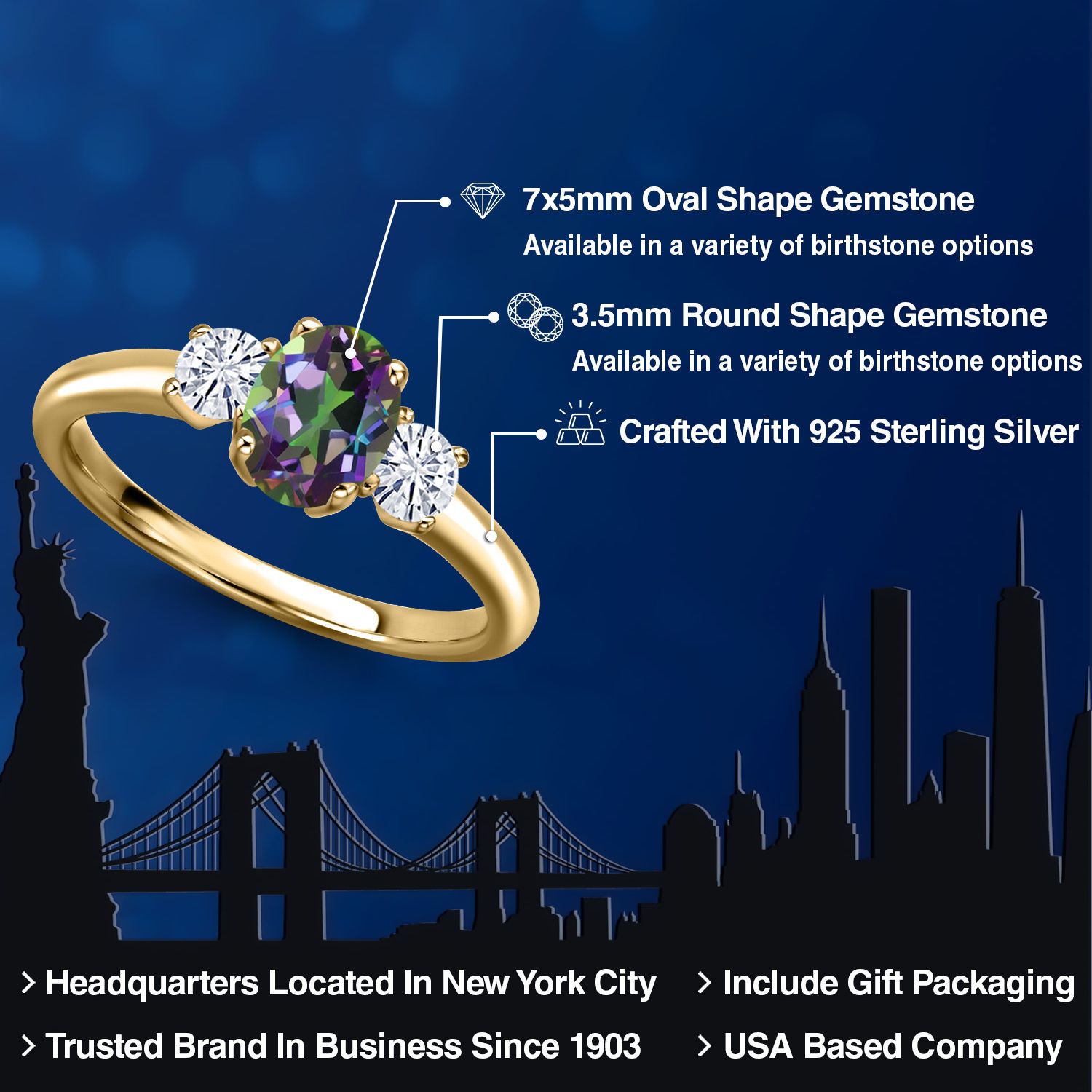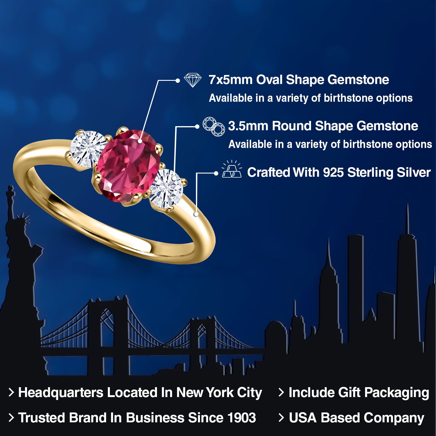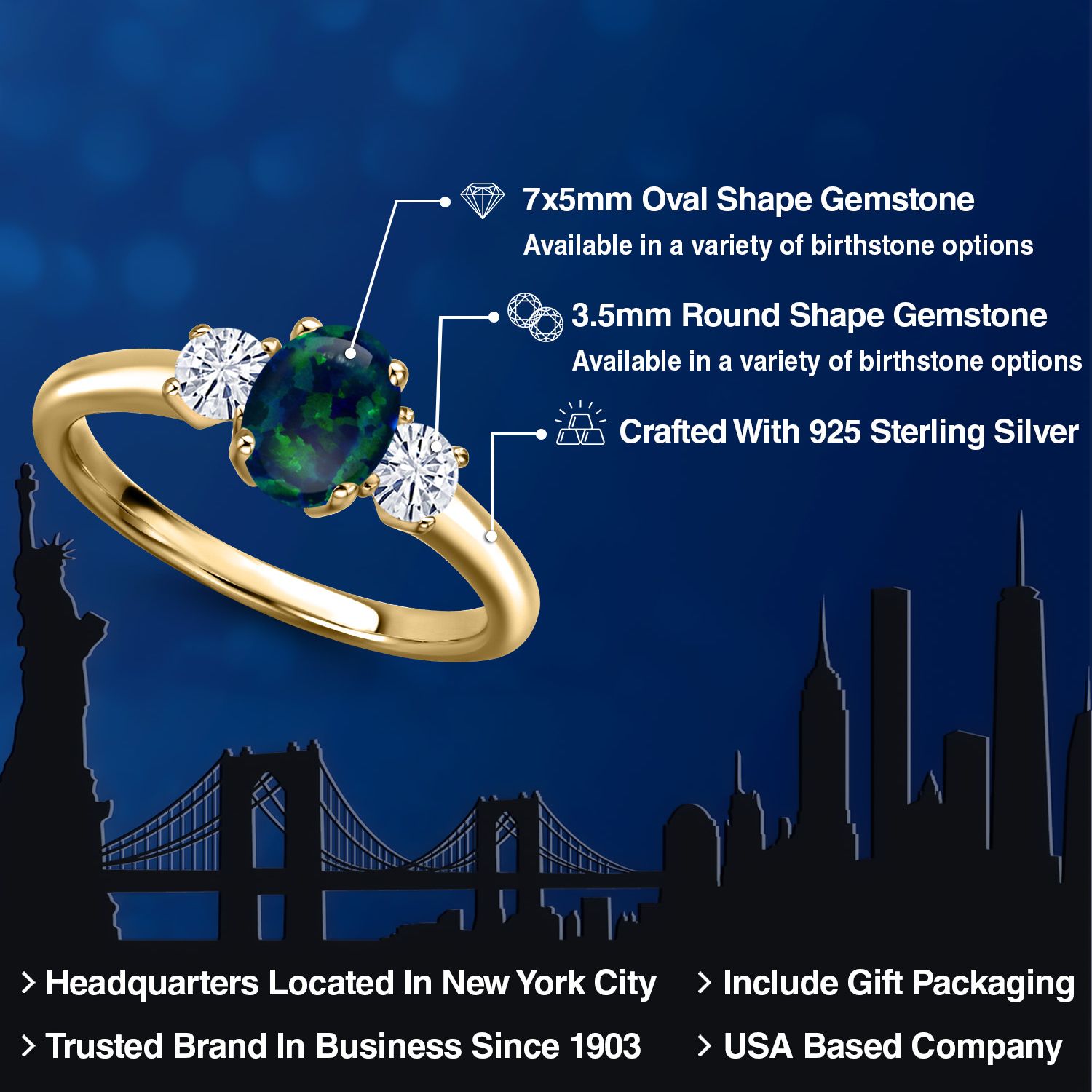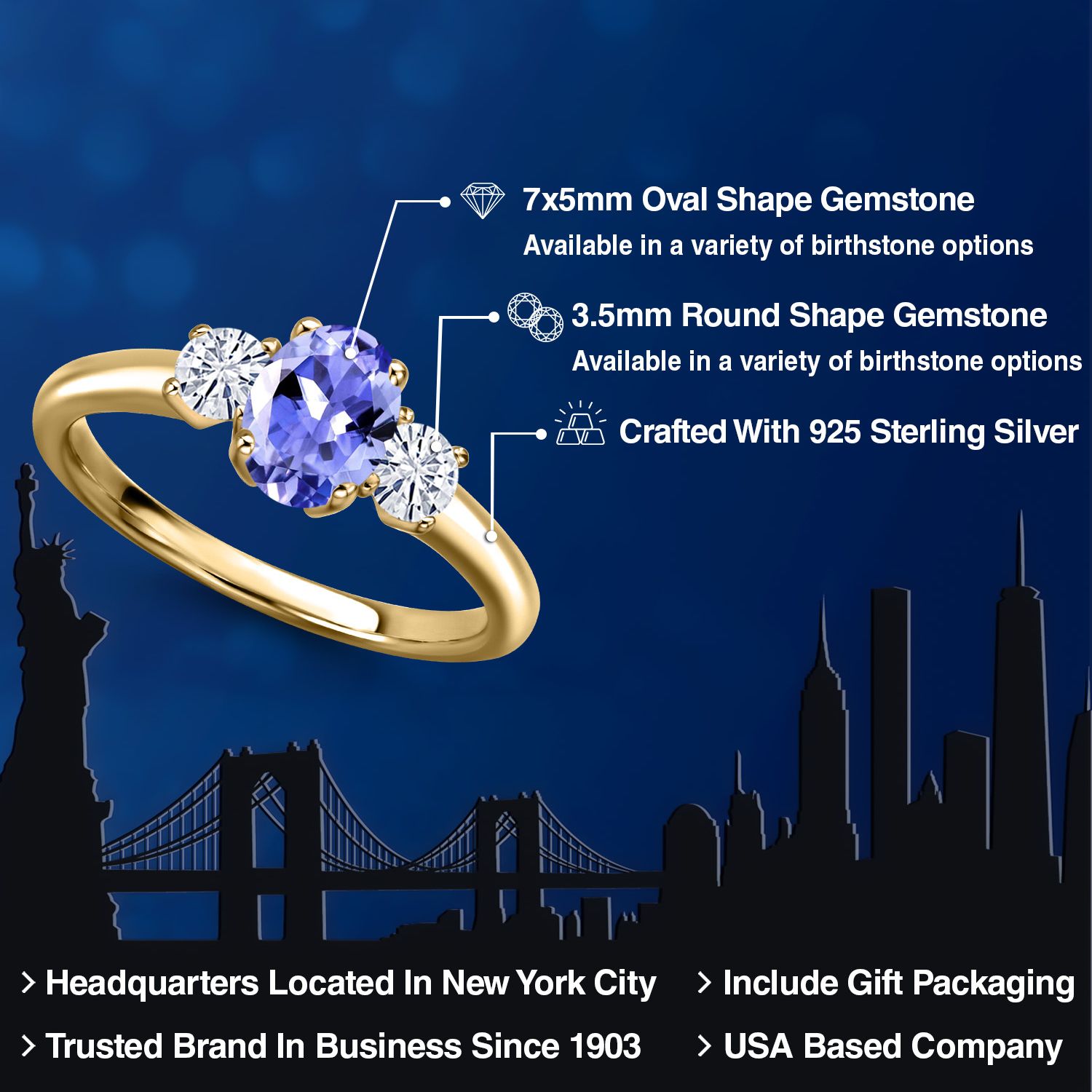 18K Yellow Gold Plated Silver Gemstone Birthstone and White Moissanite 3-Stone Engagement Ring for Women | Oval 7X5MM and Round 3MM | Wedding Anniversary Promise Ring | Sizes 5, 6, 7, 8, 9
