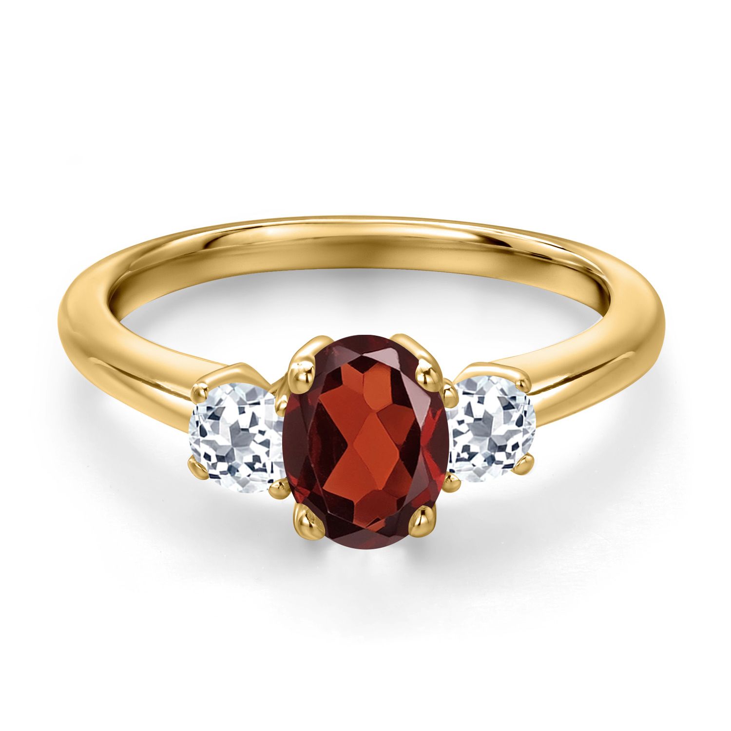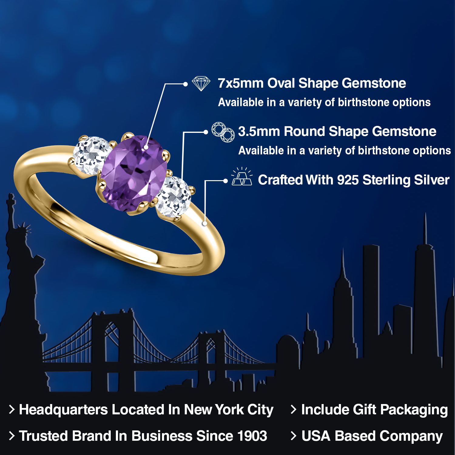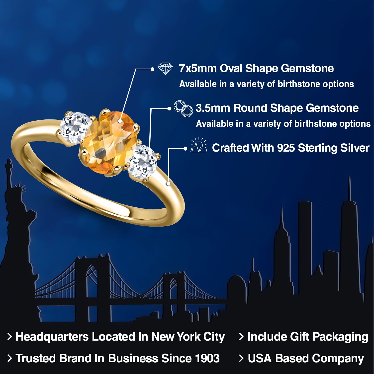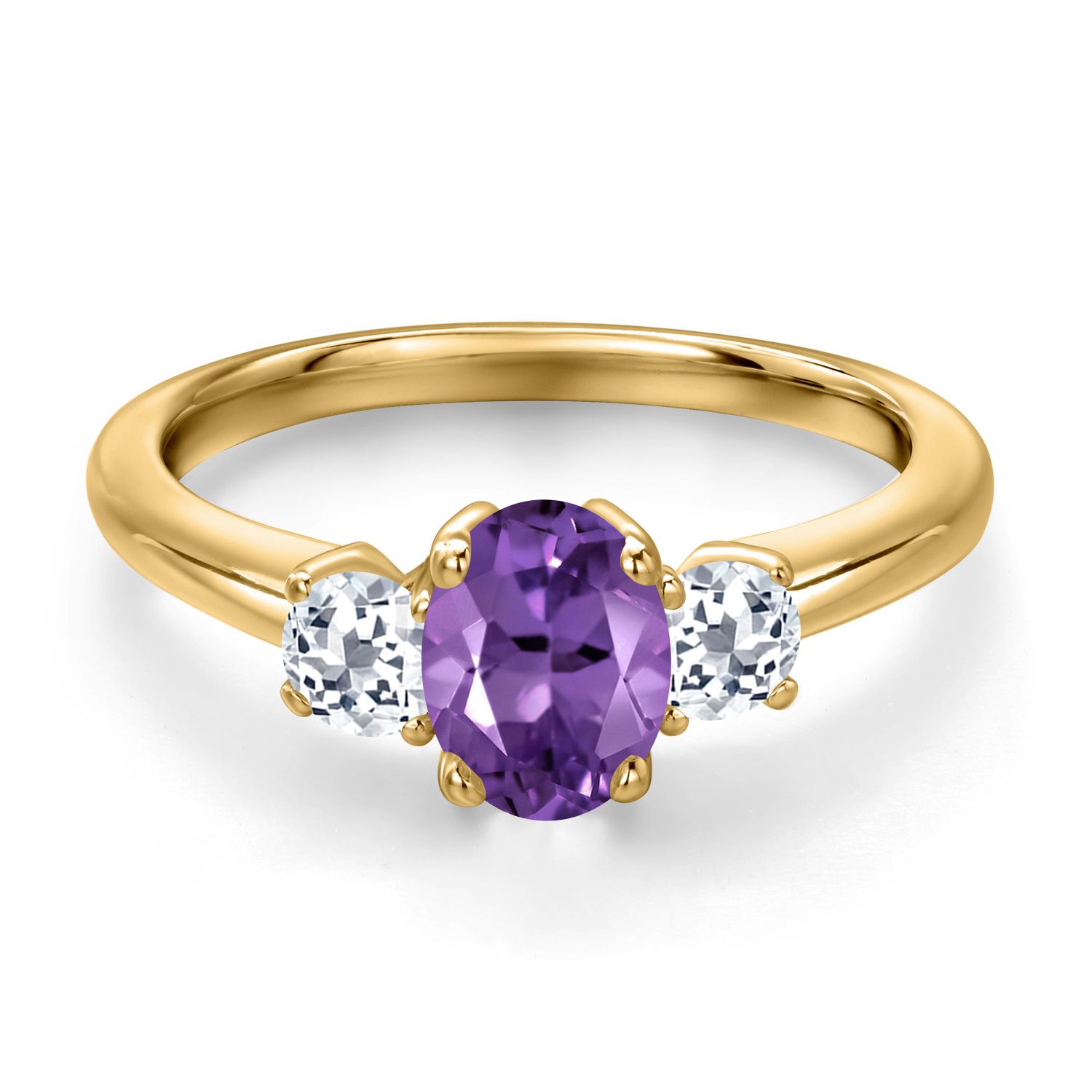 18K Yellow Gold Plated Silver Gemstone Birthstone and White Topaz 3-Stone Engagement Ring for Women | Oval 7X5MM and Round 3MM | Wedding Anniversary Promise Ring | Sizes 5, 6, 7, 8, 9