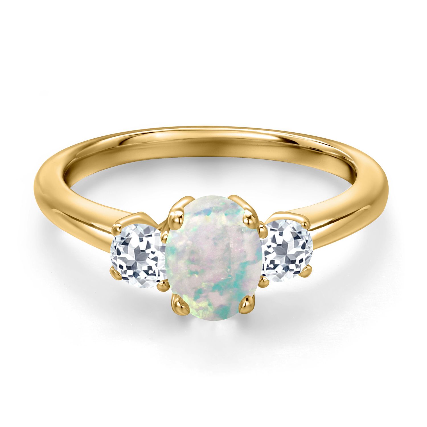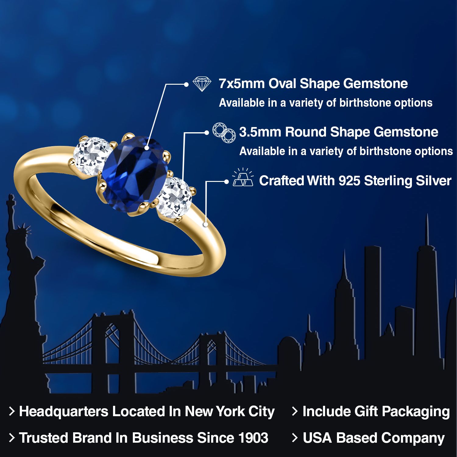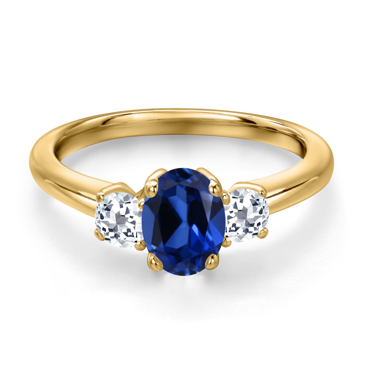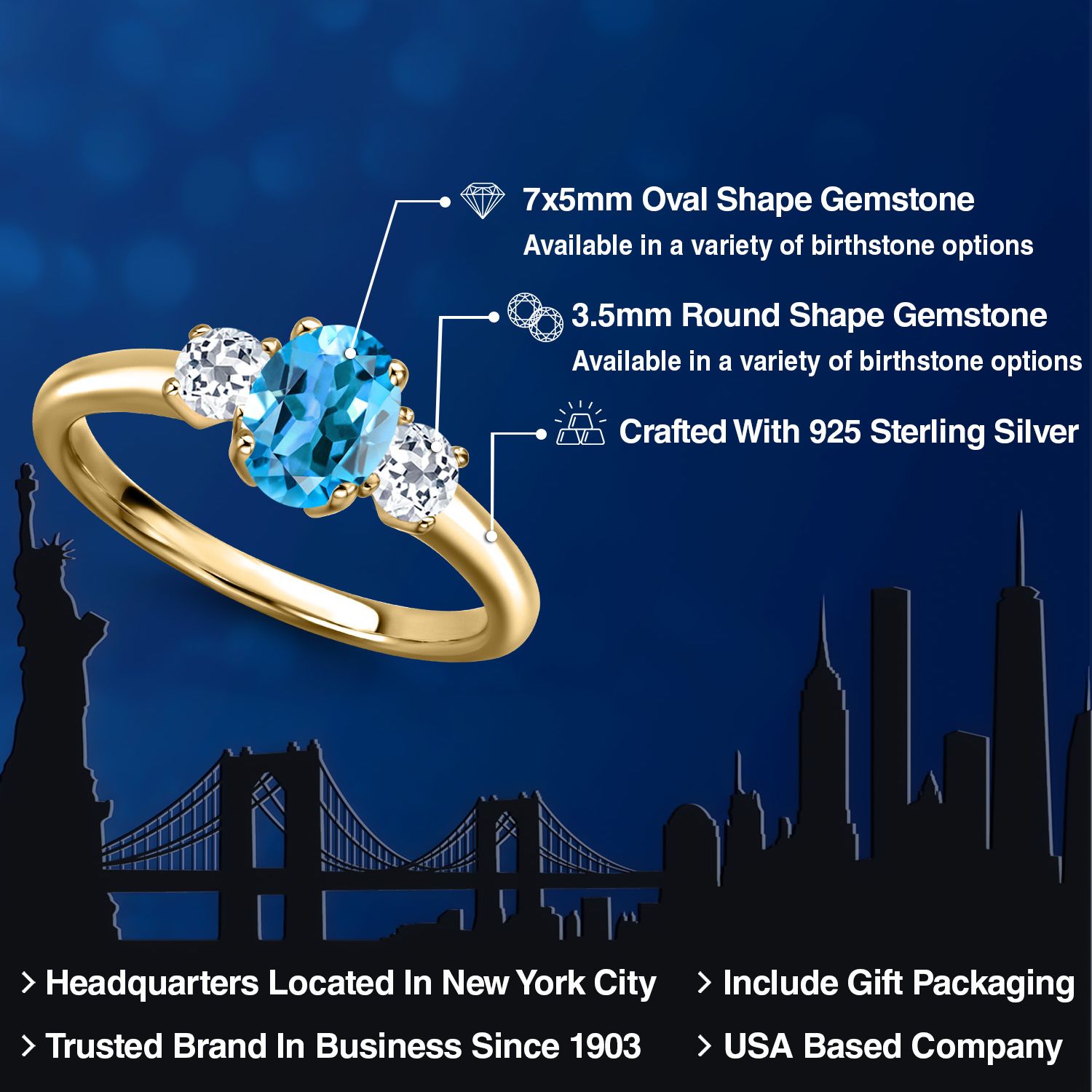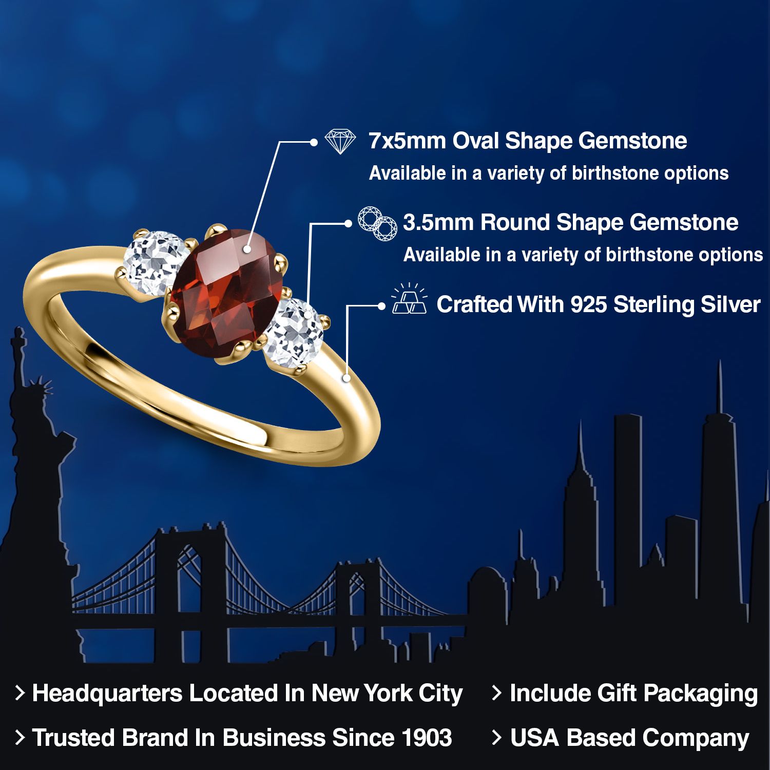 18K Yellow Gold Plated Silver Gemstone Birthstone and White Topaz 3-Stone Engagement Ring for Women | Oval 7X5MM and Round 3MM | Wedding Anniversary Promise Ring | Sizes 5, 6, 7, 8, 9