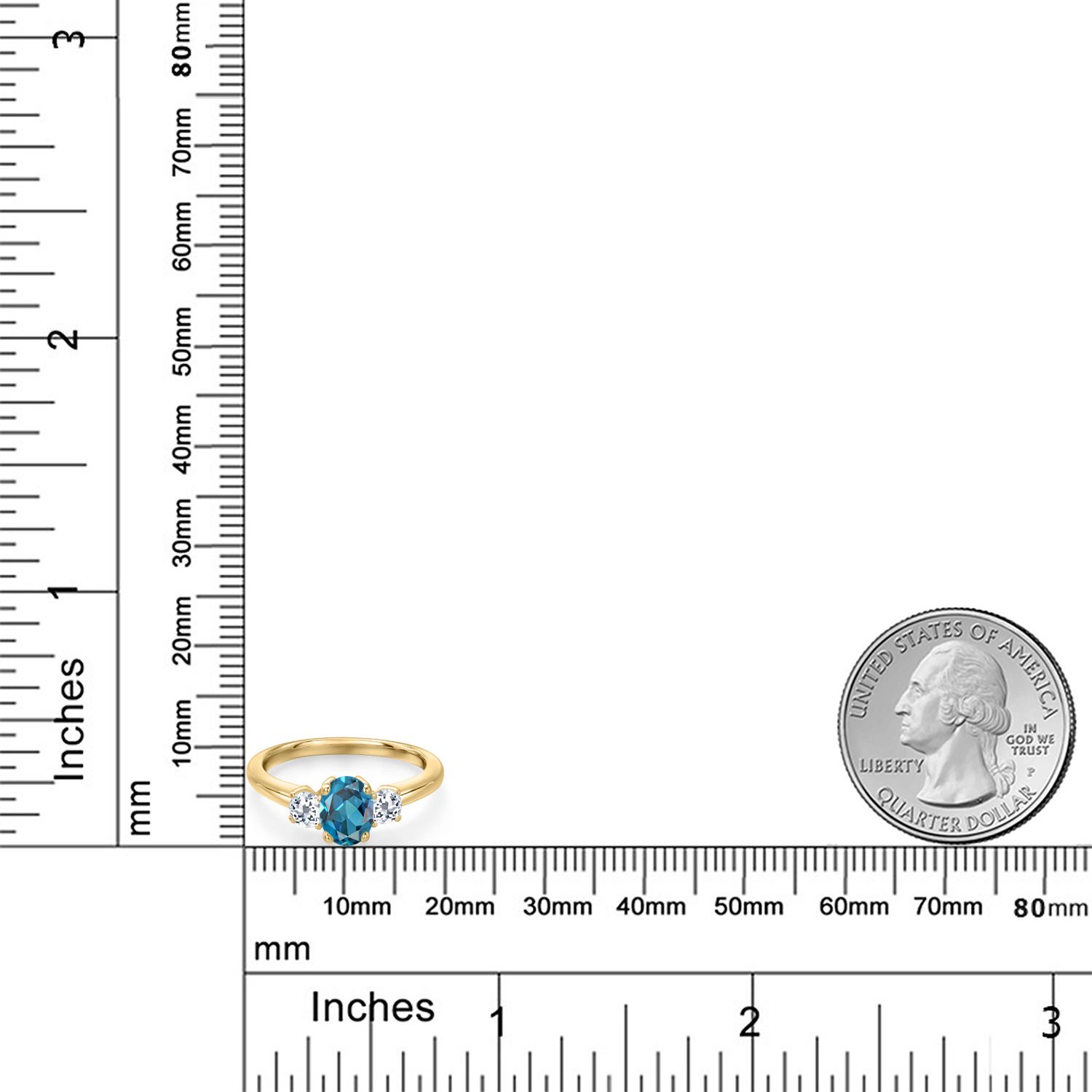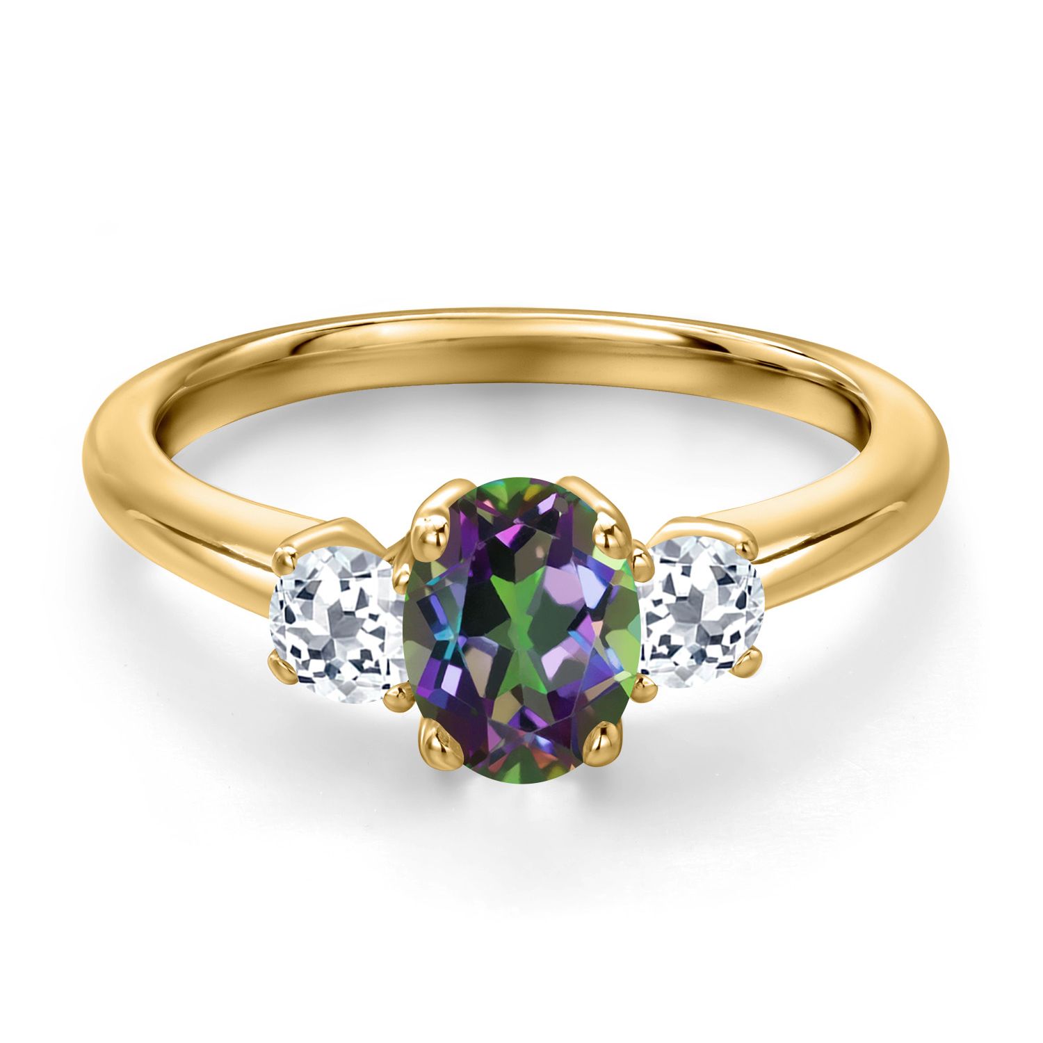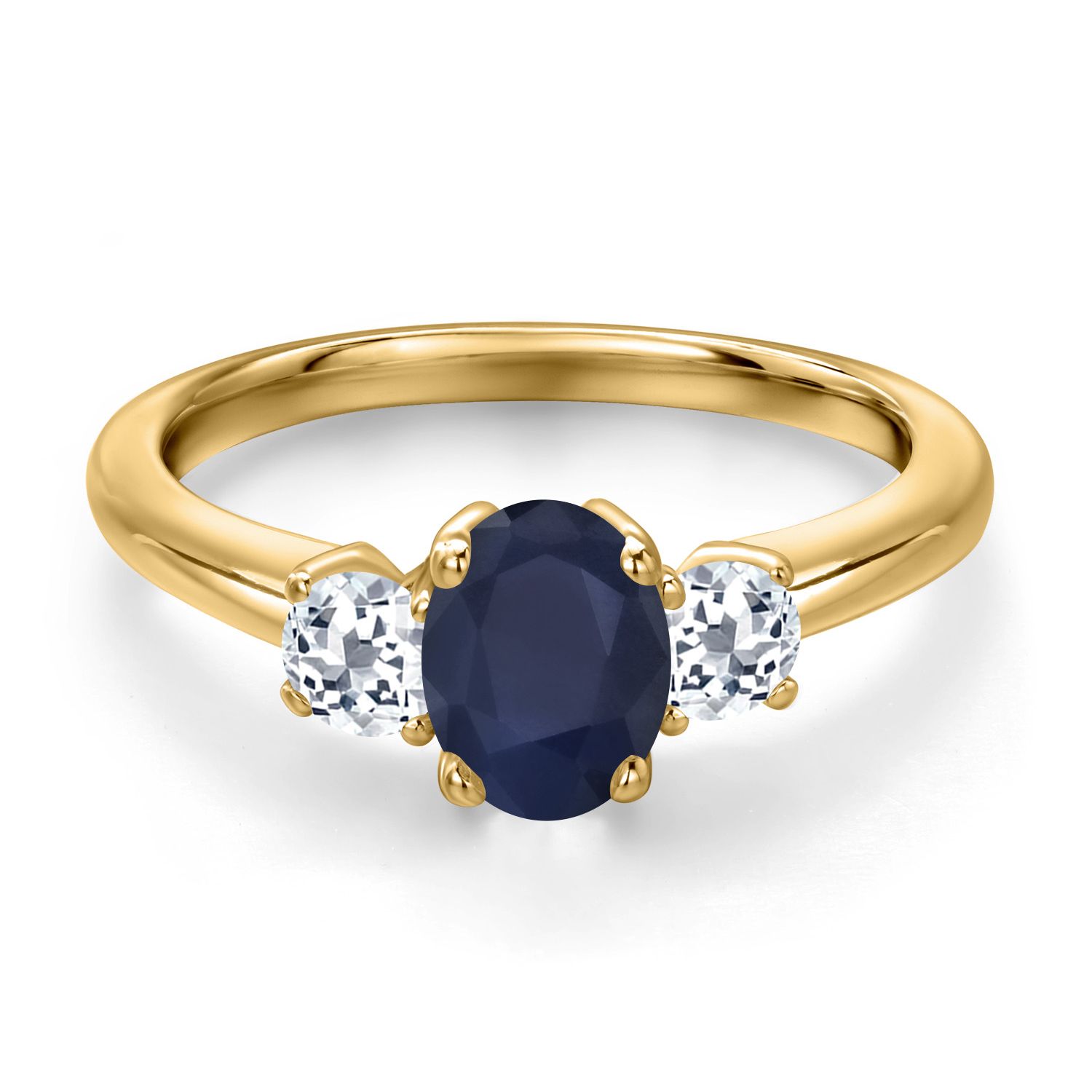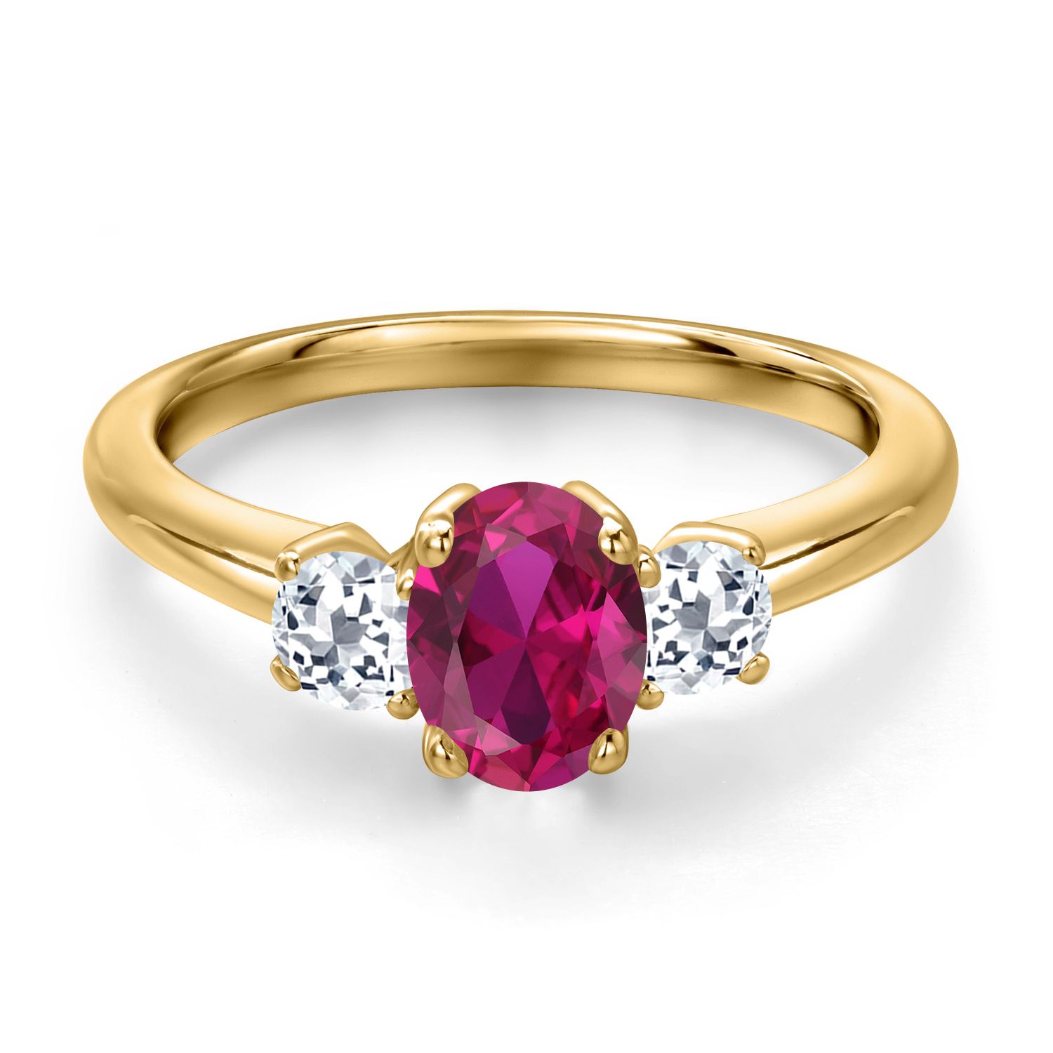 18K Yellow Gold Plated Silver Gemstone Birthstone and White Topaz 3-Stone Engagement Ring for Women | Oval 7X5MM and Round 3MM | Wedding Anniversary Promise Ring | Sizes 5, 6, 7, 8, 9
