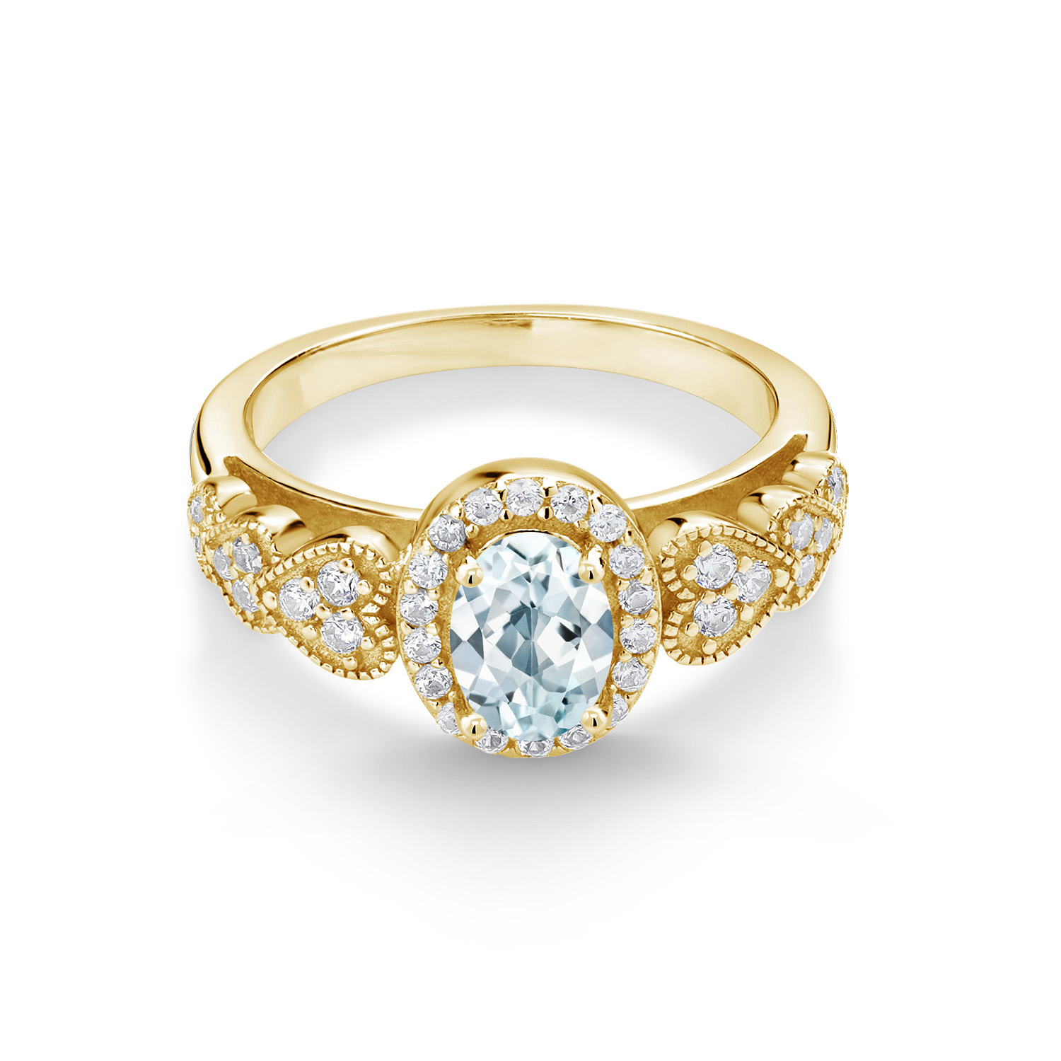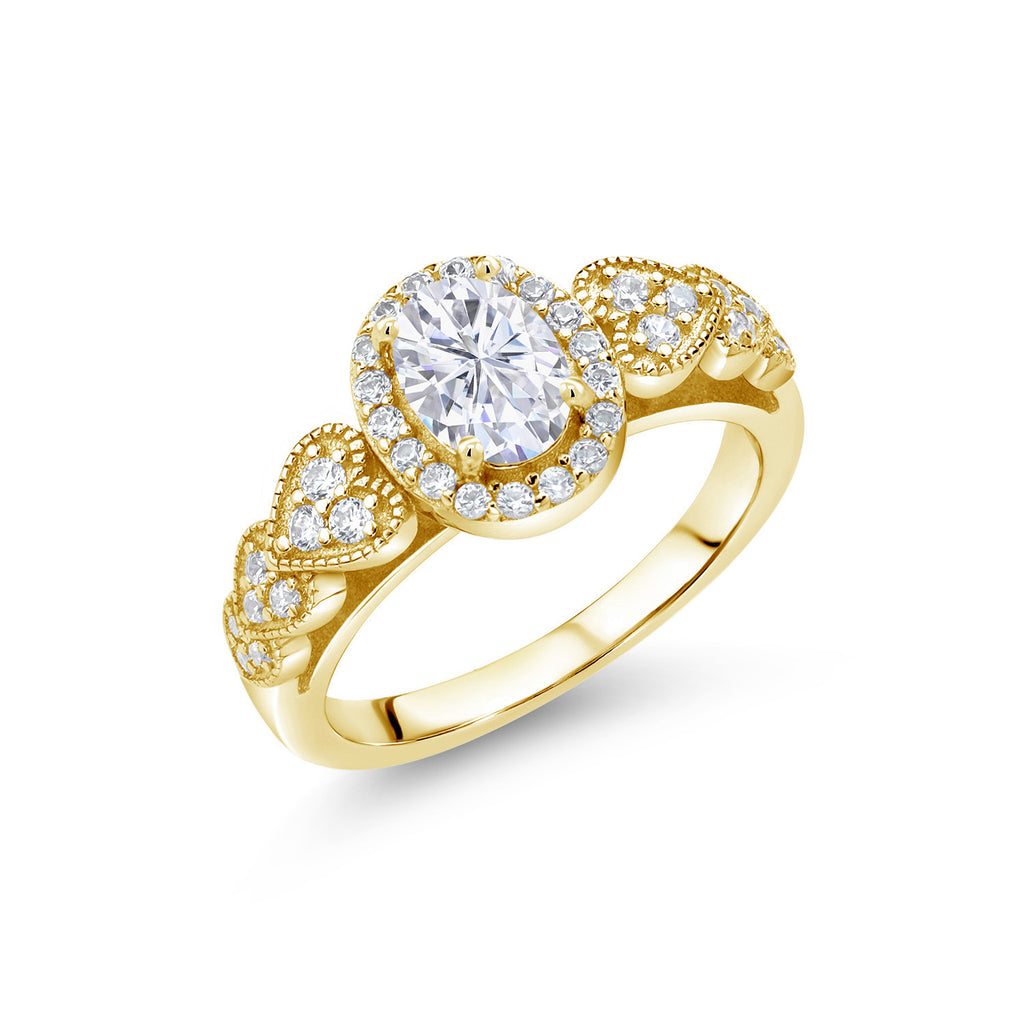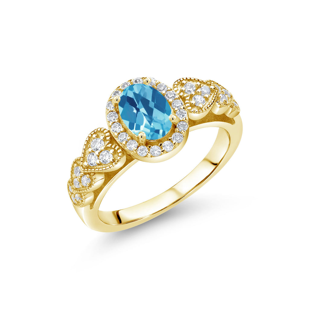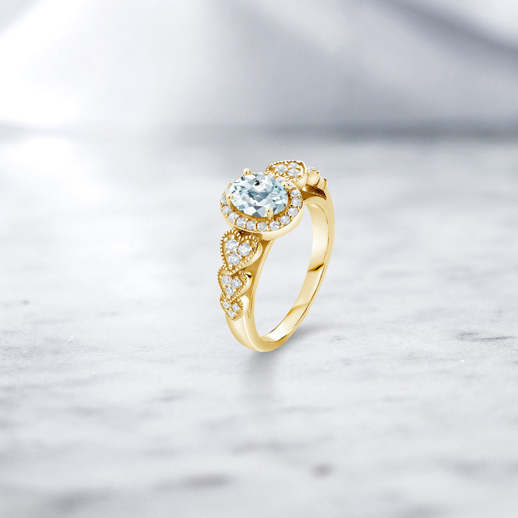 18K Yellow Gold Plated Silver Gemstone Birthstone Halo Engagement Ring for Women | Oval 7X5MM with White Accent Stones | Fine Wedding Anniversary Promise Ring | Sizes 5, 6, 7, 8, 9