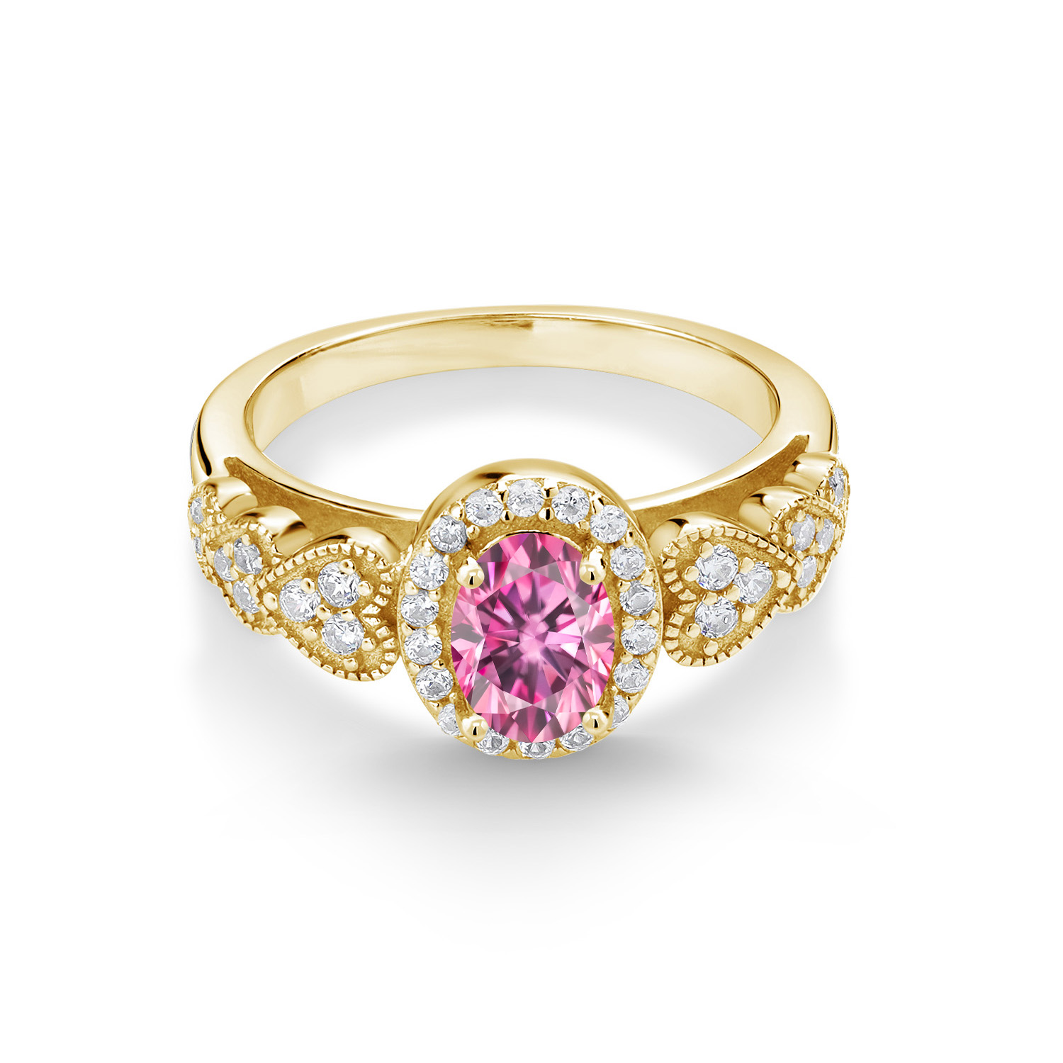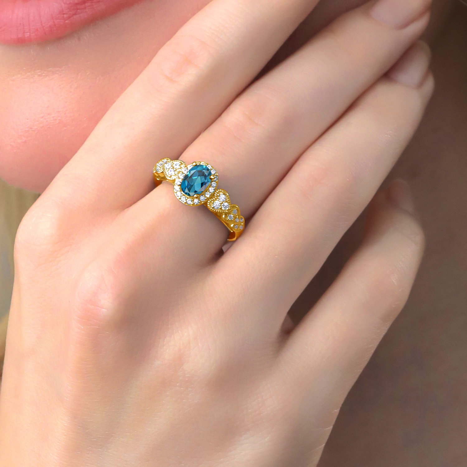 HALO DESIGN WITH WHITE ACCENT STONES: The halo setting adds a touch of vintage-inspired charm, encircling the main gemstone with a sparkling array of white accent stones. This intricate design amplifies the ring's brilliance, catching light from every angle. Meticulous craftsmanship is evident in every detail, from the secure prong settings to the smooth, polished band, ensuring a flawless finish that speaks to the artistry behind this piece.