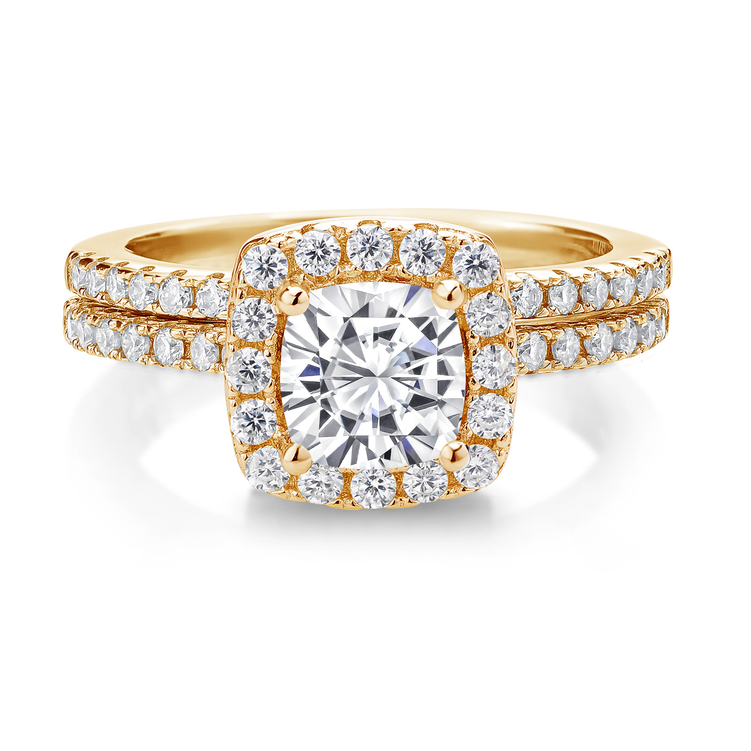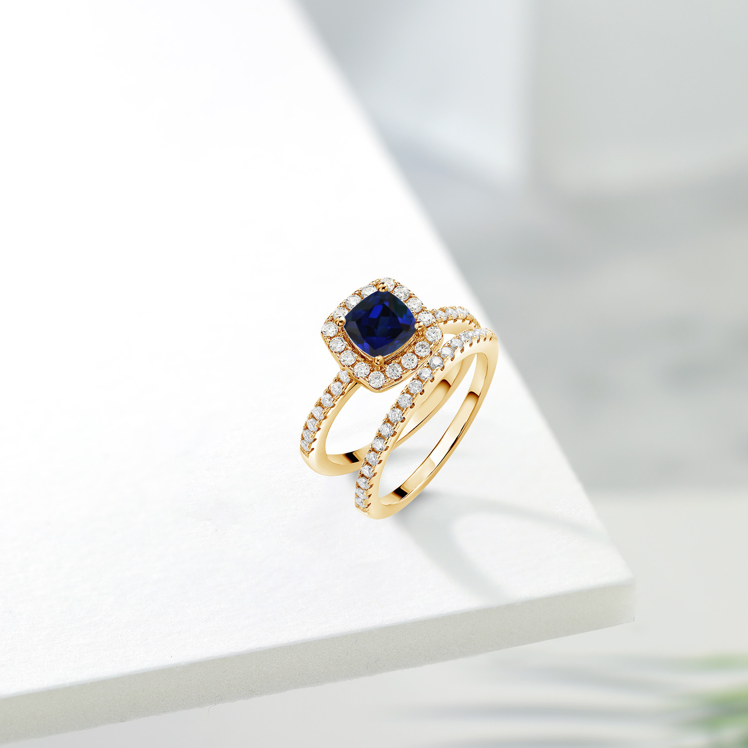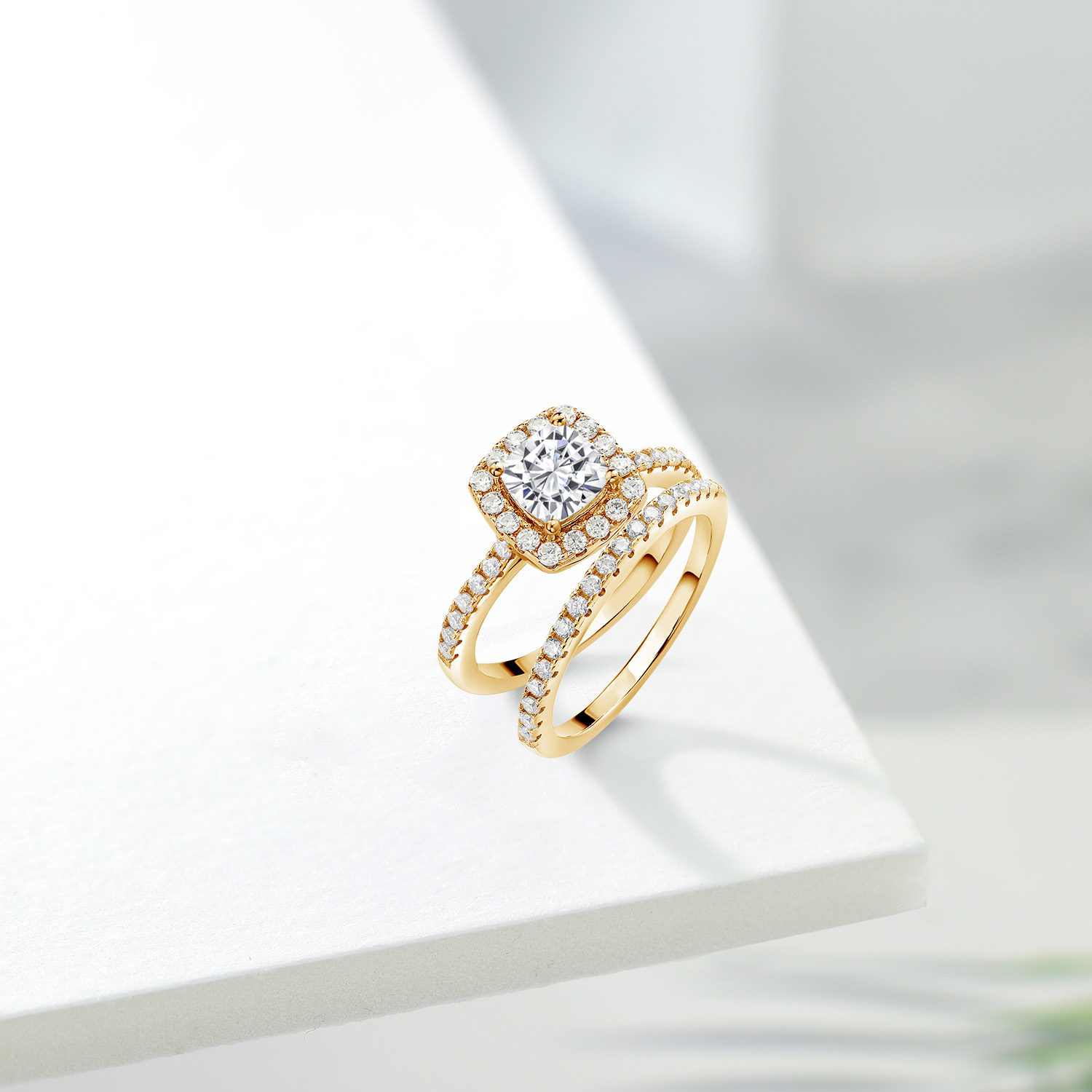 HALO & ACCENT STONE ELEGANCE: Surrounding the central gemstone, a halo of finely cut 1.3MM round accent stones enhances the ring's brilliance and adds a touch of regal charm. These perfectly set accents reflect exceptional craftsmanship, capturing light brilliantly with every movement. The intricate design work highlights the artistry involved in its creation, setting this bridal set apart as a masterpiece of elegance and sophistication.