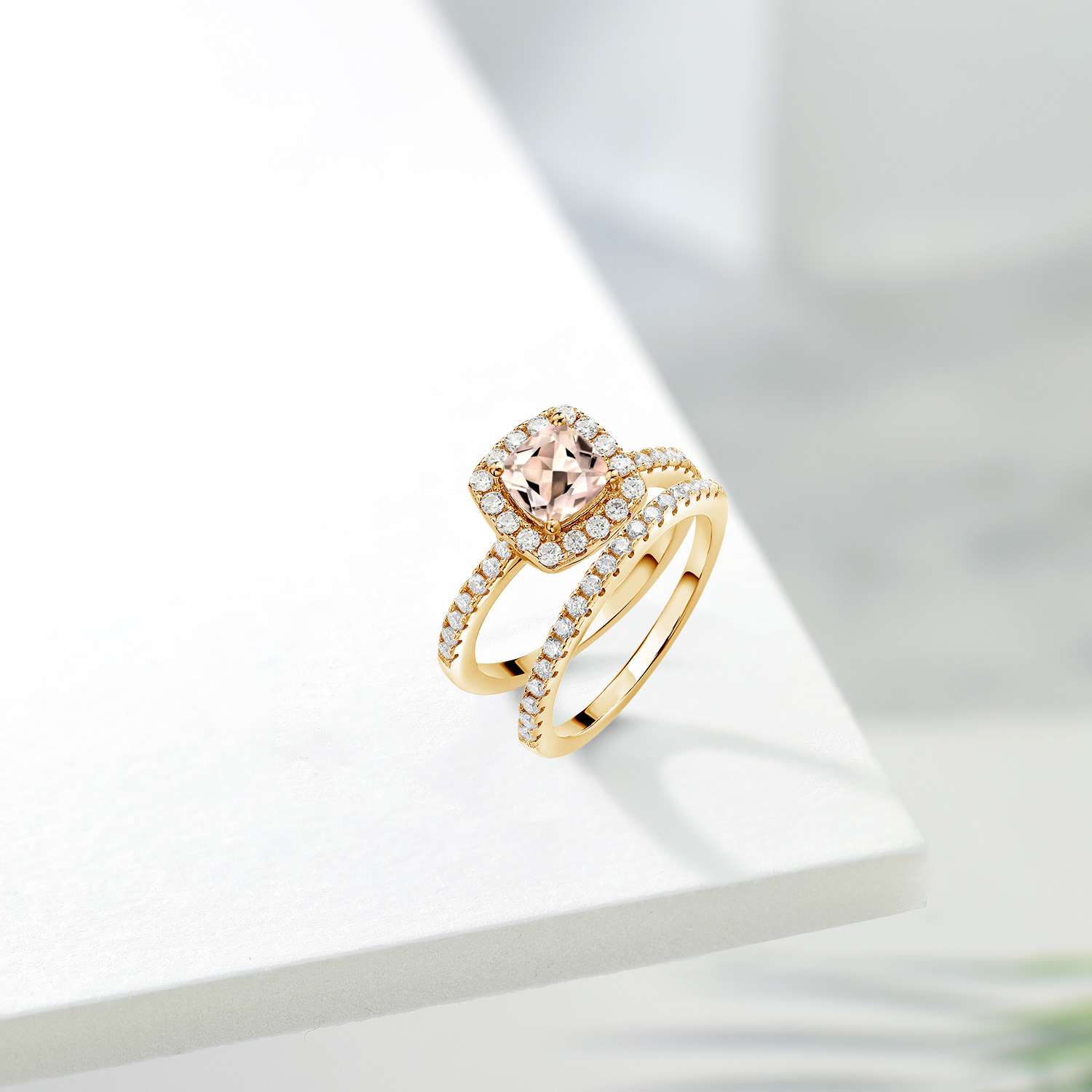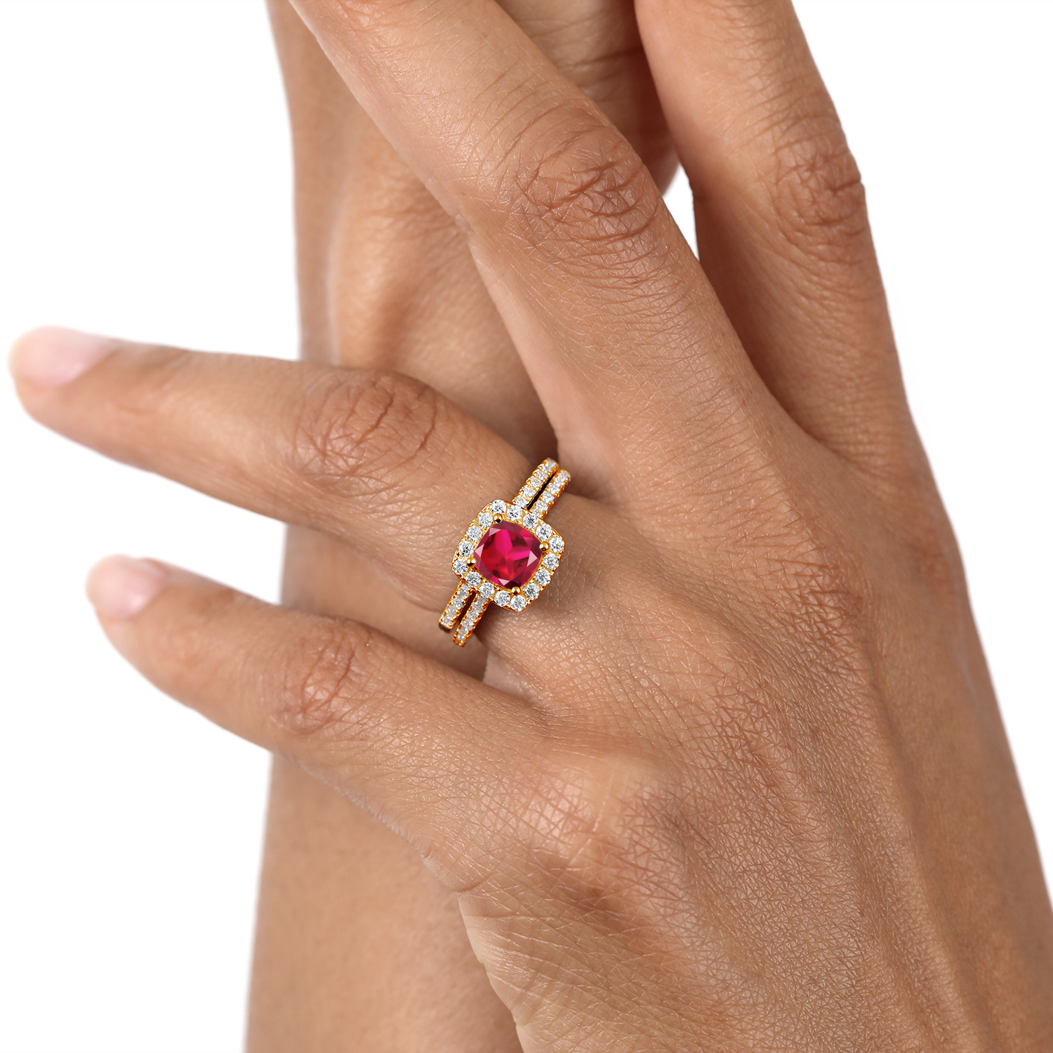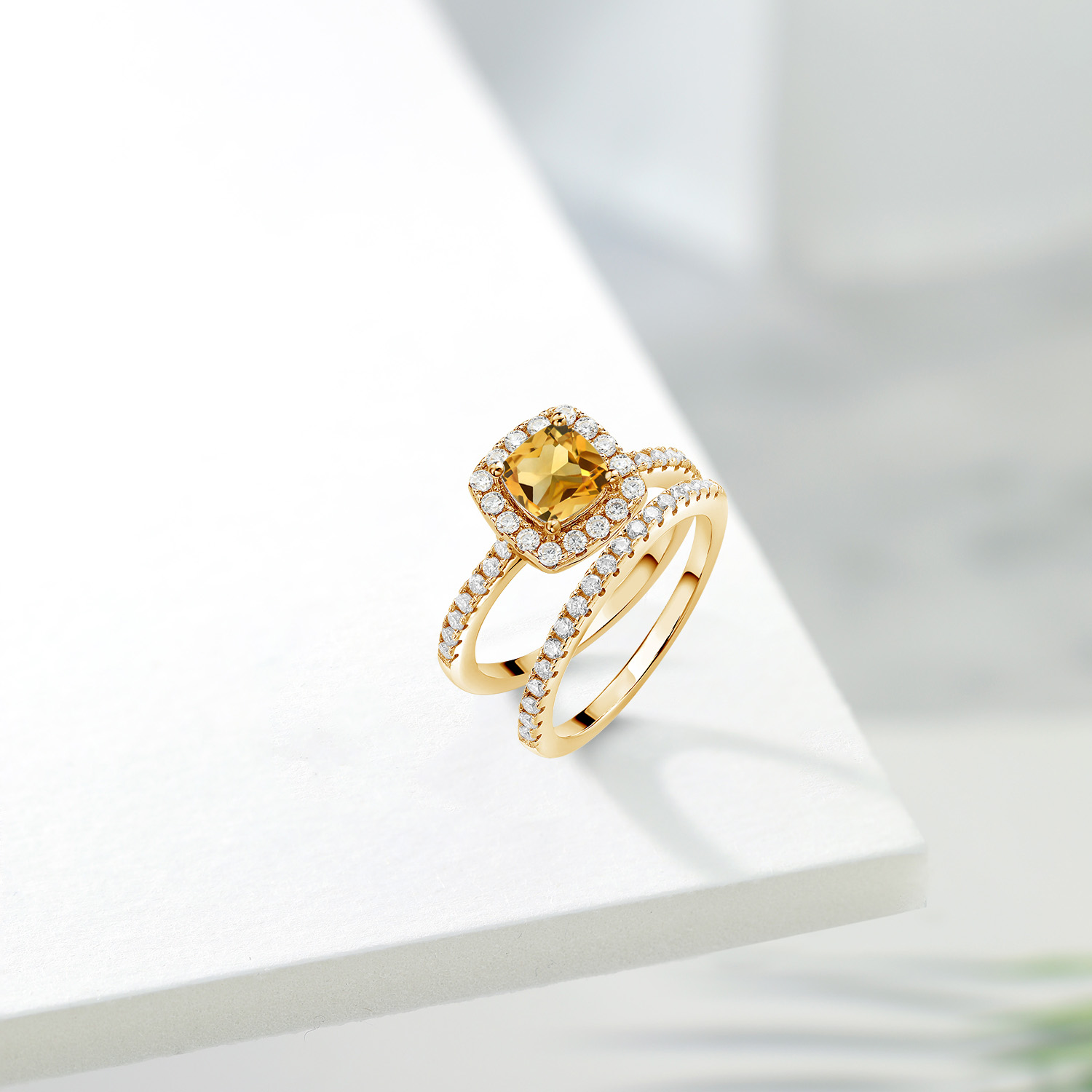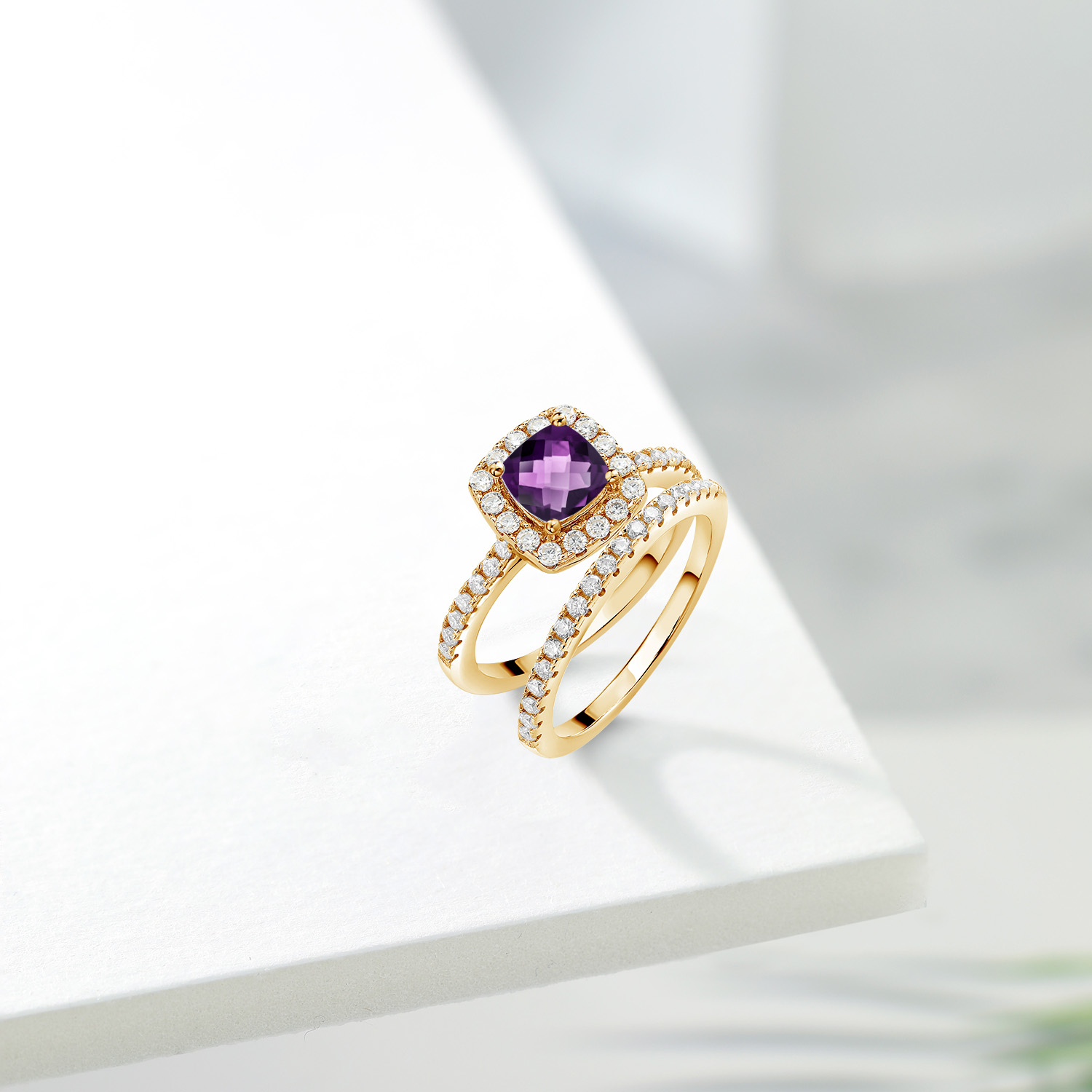 CUSHION CUT GEMSTONE ALLURE: At the heart of this exquisite bridal set is a captivating 6MM cushion cut gemstone, a timeless symbol of elegance and sophistication. This central gem shines brilliantly, capturing light from every angle to enhance its mesmerizing allure. Available in various birthstone options, this ring is not only a personal statement of identity and taste but also a reflection of distinguished craftsmanship, making it a perfect engagement or anniversary gift.
