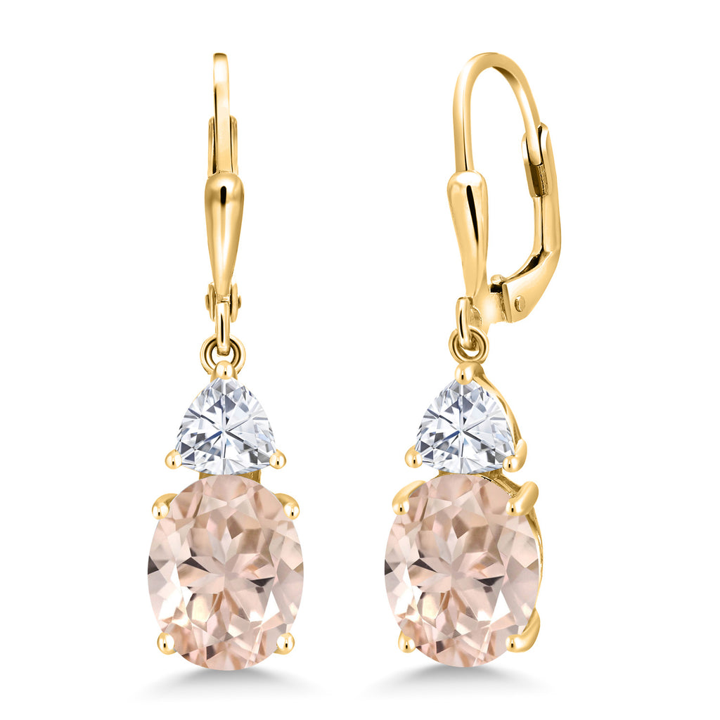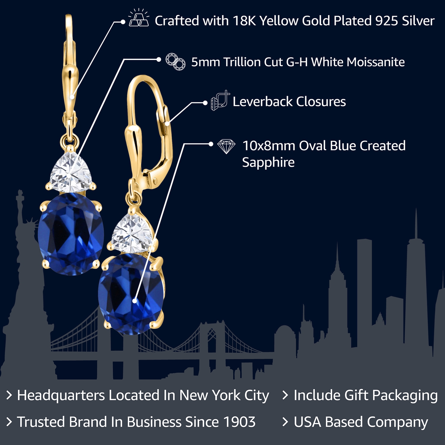 18K Yellow Gold Plated Silver Gemstone Birthstone and White Moissanite Leverback Dangle Earrings For Women | Oval 10X8MM | Trillion 5MM | Elegant Drop Design | Gift for Her Wife Mom