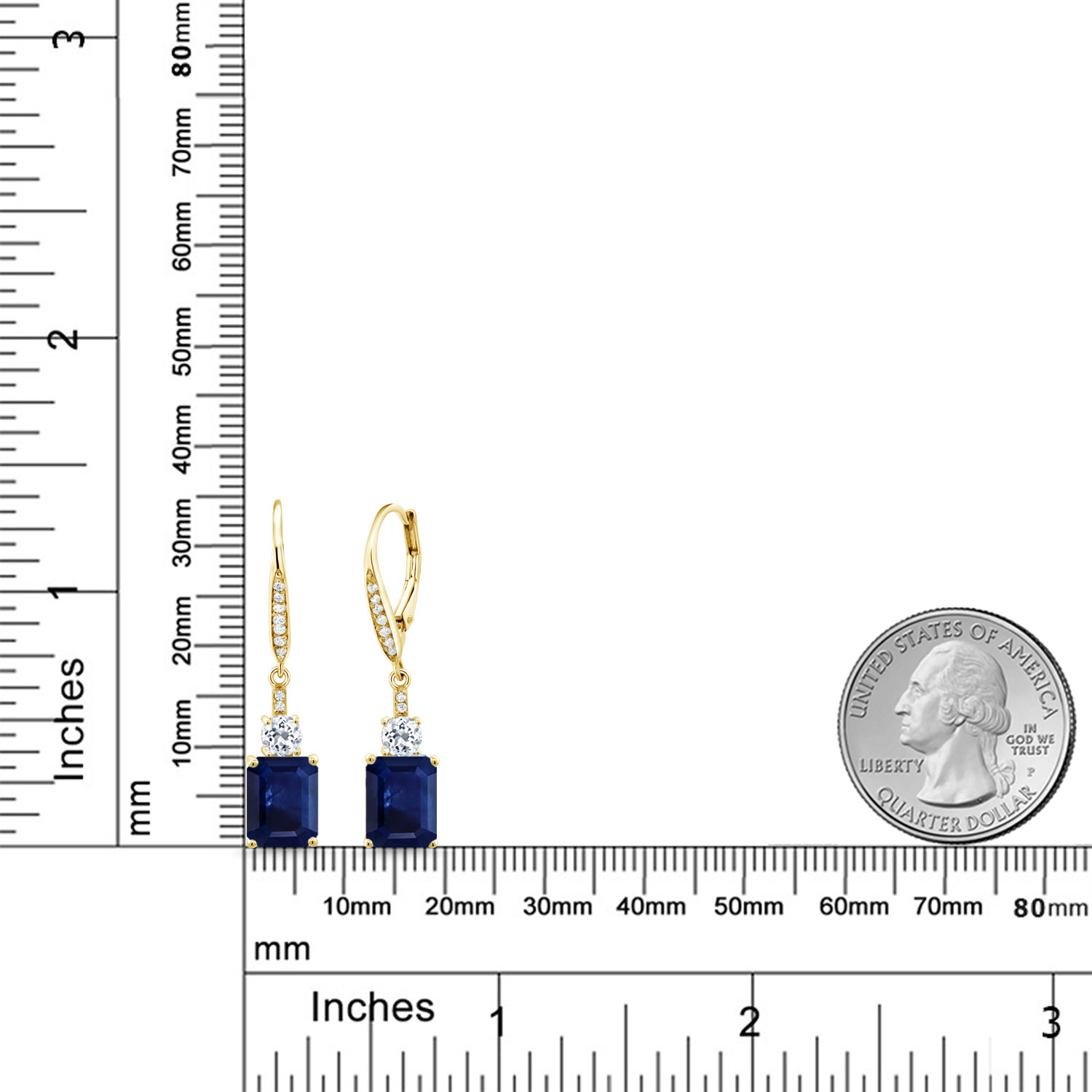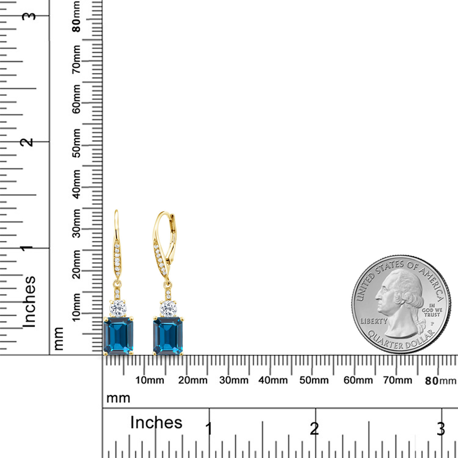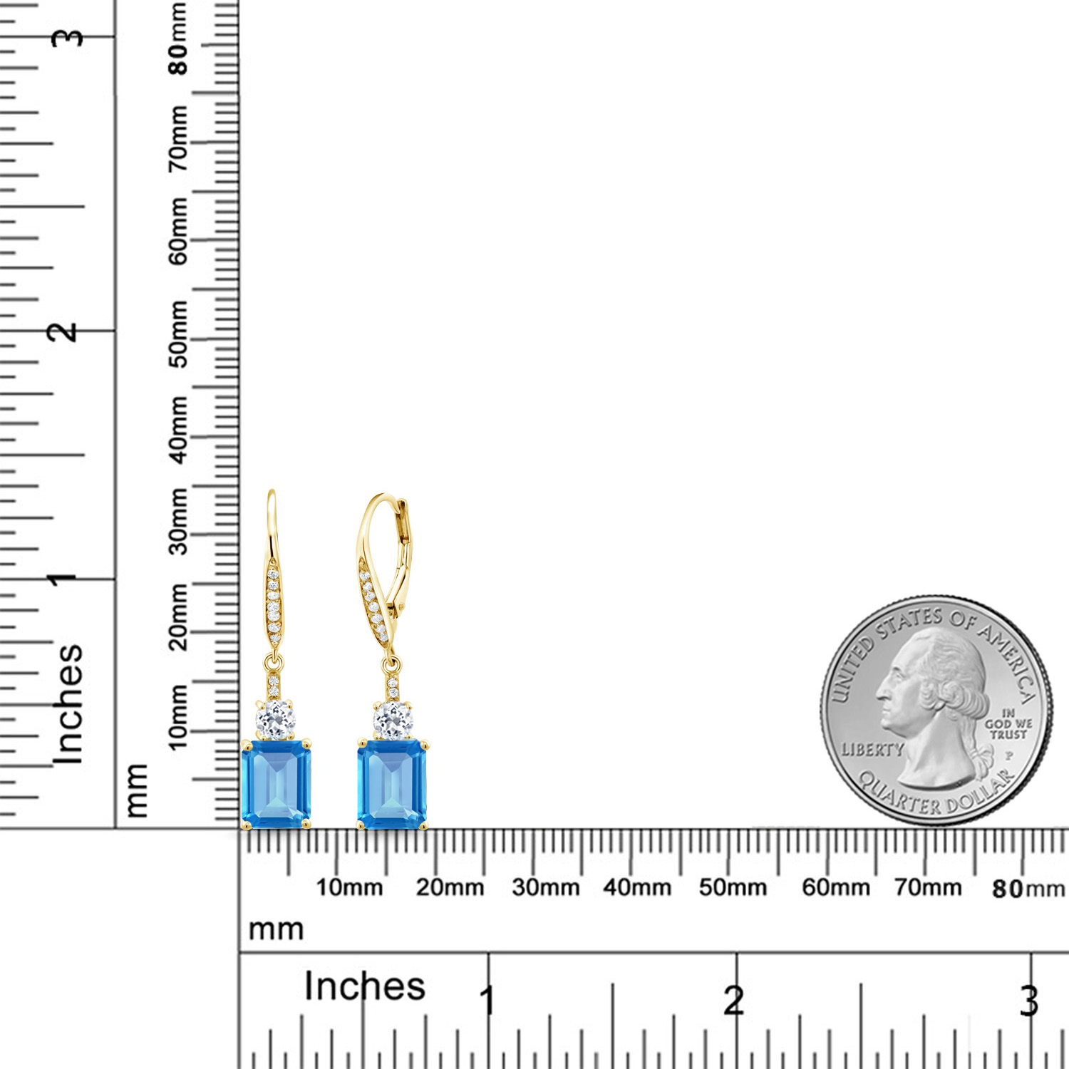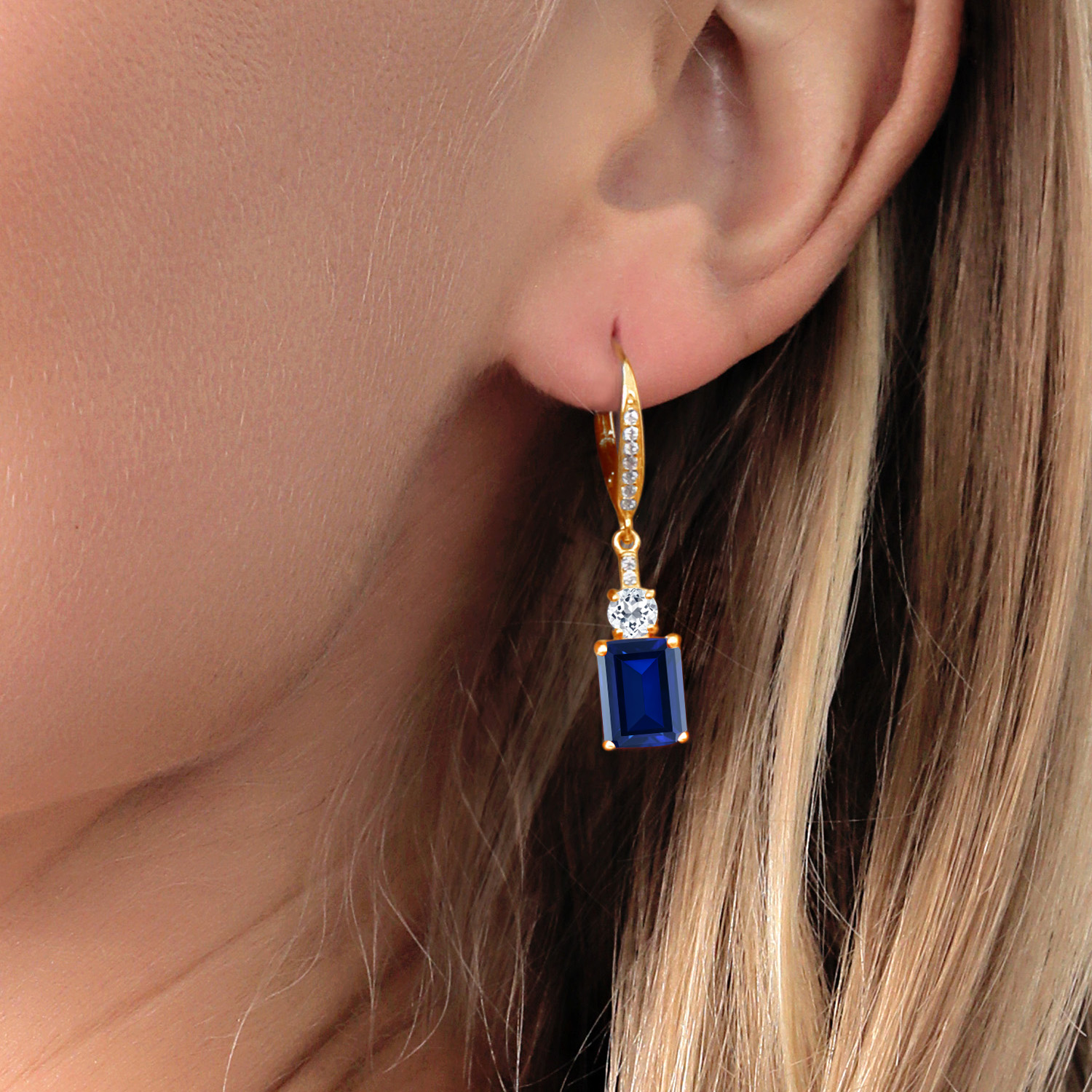 DAZZLING WHITE TOPAZ ACCENTS: Complementing the main gemstone, 4MM round white topaz accents add an unprecedented sparkle that elevates the overall design. These stones are meticulously set, showcasing the artisan craftsmanship in every detail. The contrast between the emerald cut and round accents emanates a harmonious balance, transforming the elegant drop design into a symphony of glittering sophistication suitable for any occasion.