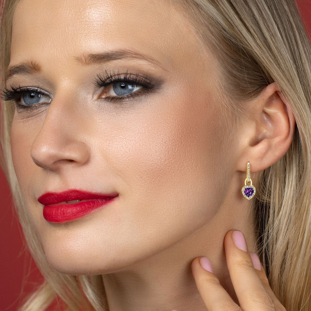 HIGH-QUALITY CRAFTSMANSHIP: Crafted from 18K Yellow Gold Plated Silver, these earrings offer both durability and a luxurious shine. The heart-shaped gemstone birthstones and white created sapphires are meticulously selected for their exceptional clarity and vibrant color, ensuring a radiant sparkle that will be admired from every angle.