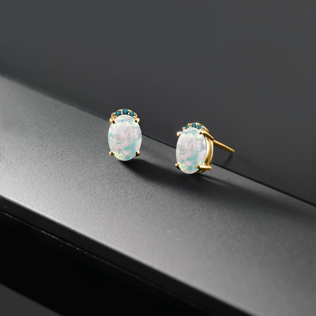 18K Yellow Gold Plated Silver White Simulated Opal and Blue Diamond Stud Earrings For Women (2.07 Cttw, Gemstone October Birthstone, Oval Cabochon 7X5MM)