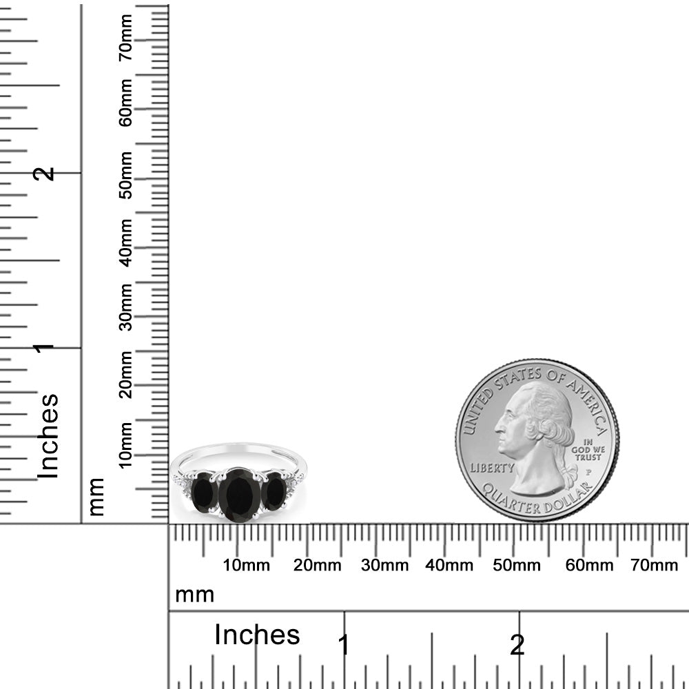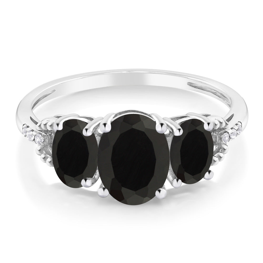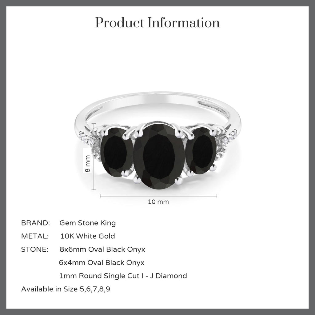 2.08 Cttw 10K White Gold Black Onyx and Diamond Accent 3-Stone Engagement Ring | Oval 8X6MM and 6X4MM | Three Stone Wedding Anniversary Promise Ring For Women