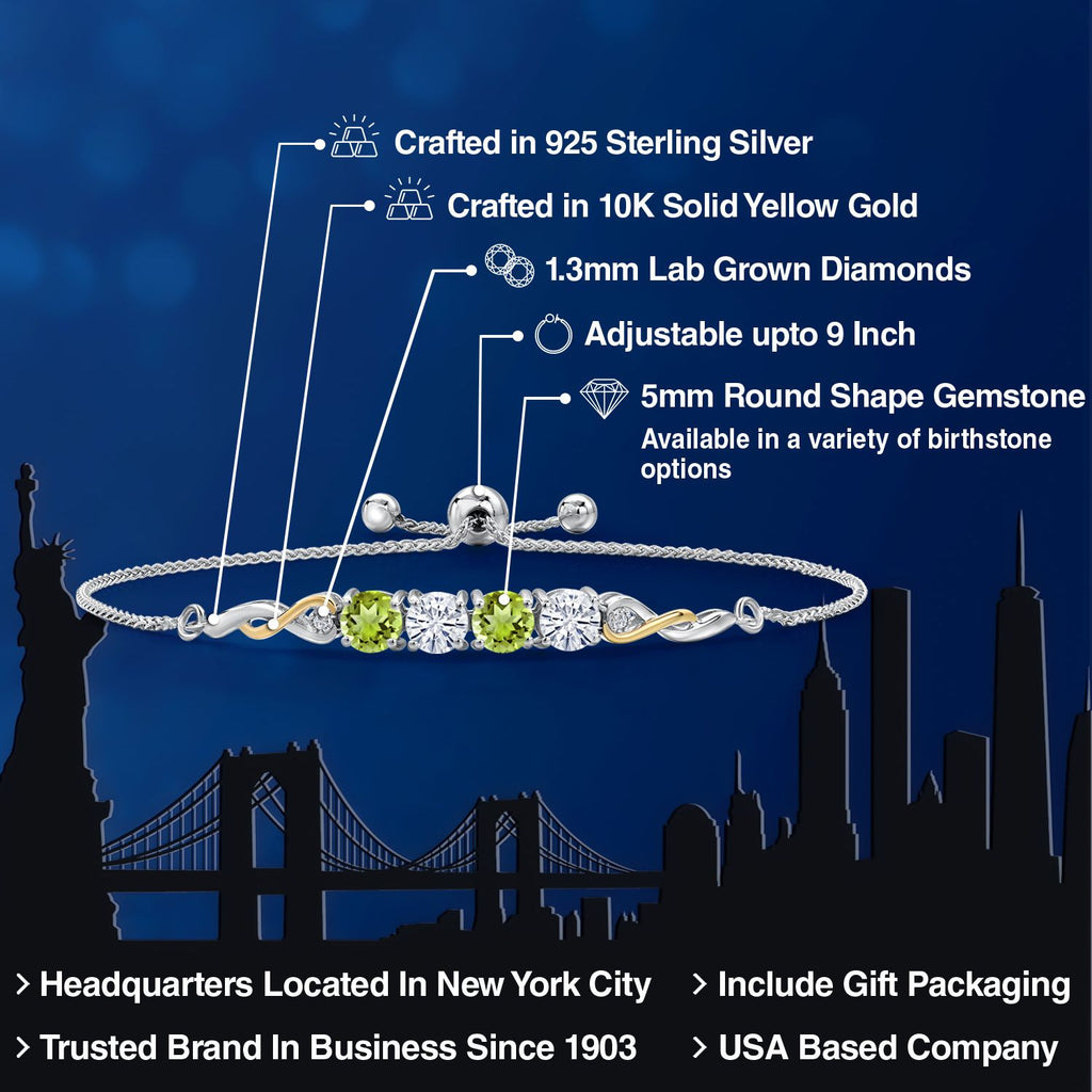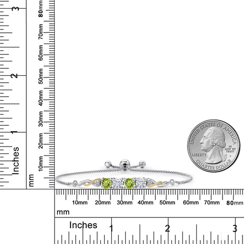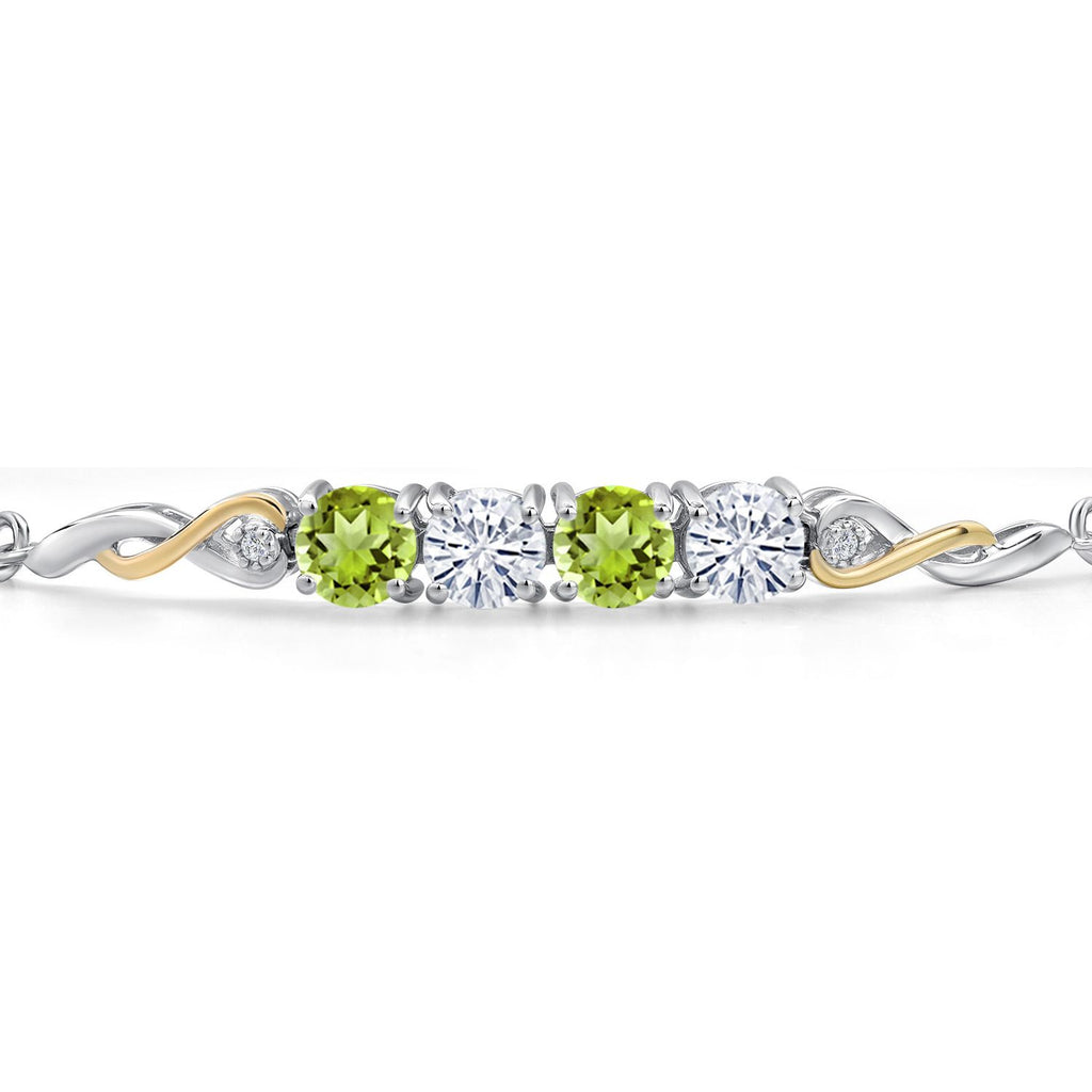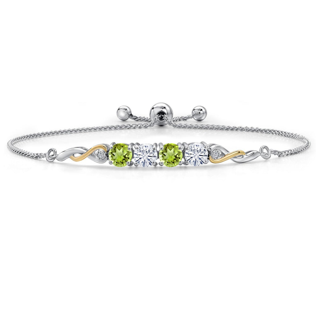 2.12 Cttw 925 Silver and 10K Yellow Gold Green Peridot White Moissanite and White Lab Grown Diamond Bracelet For Women | Gemstone Birthstone | Round 5MM | Fully Adjustable 9 Inch
