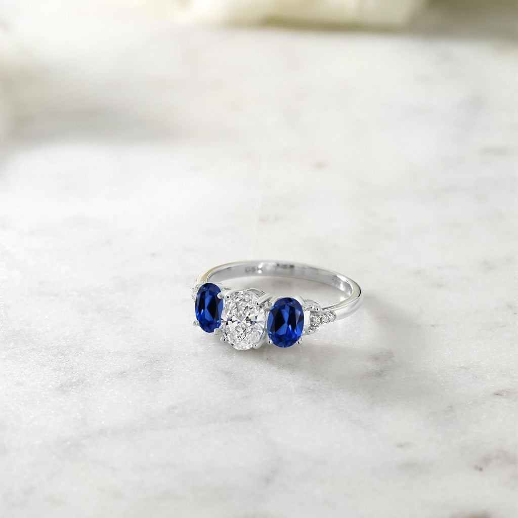 EXQUISITE CRAFTSMANSHIP AND DESIGN: This stunning 3-stone engagement ring features a total of 2.22 Cttw, including a 1.00 Ct oval center diamond, flanked by two blue created sapphires. Set in luxurious 10K White Gold, this ring offers a perfect blend of classic elegance and modern sophistication.