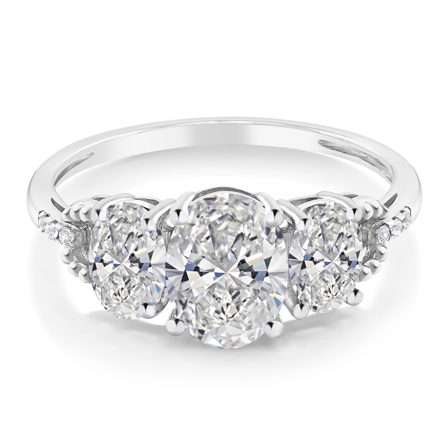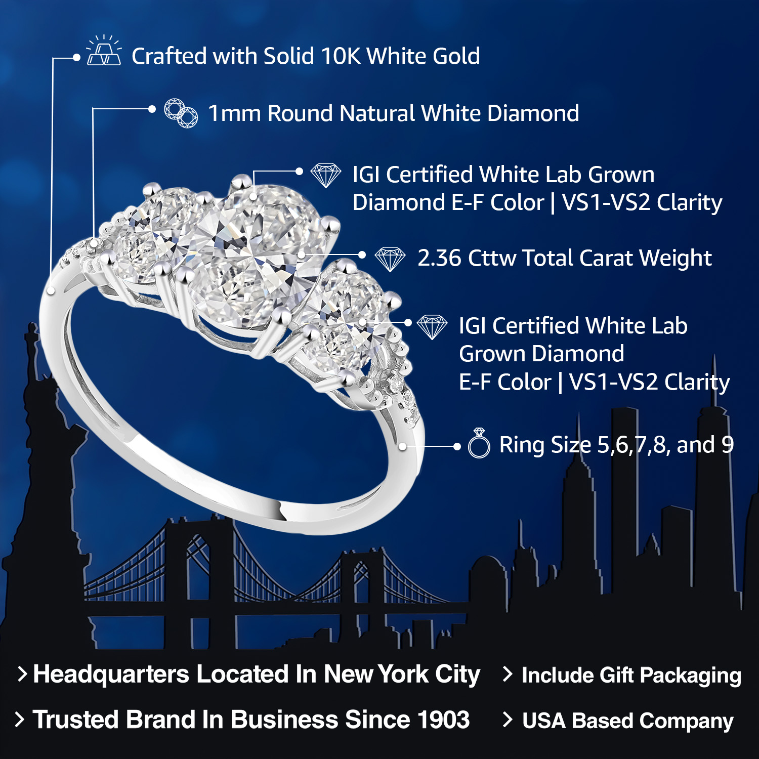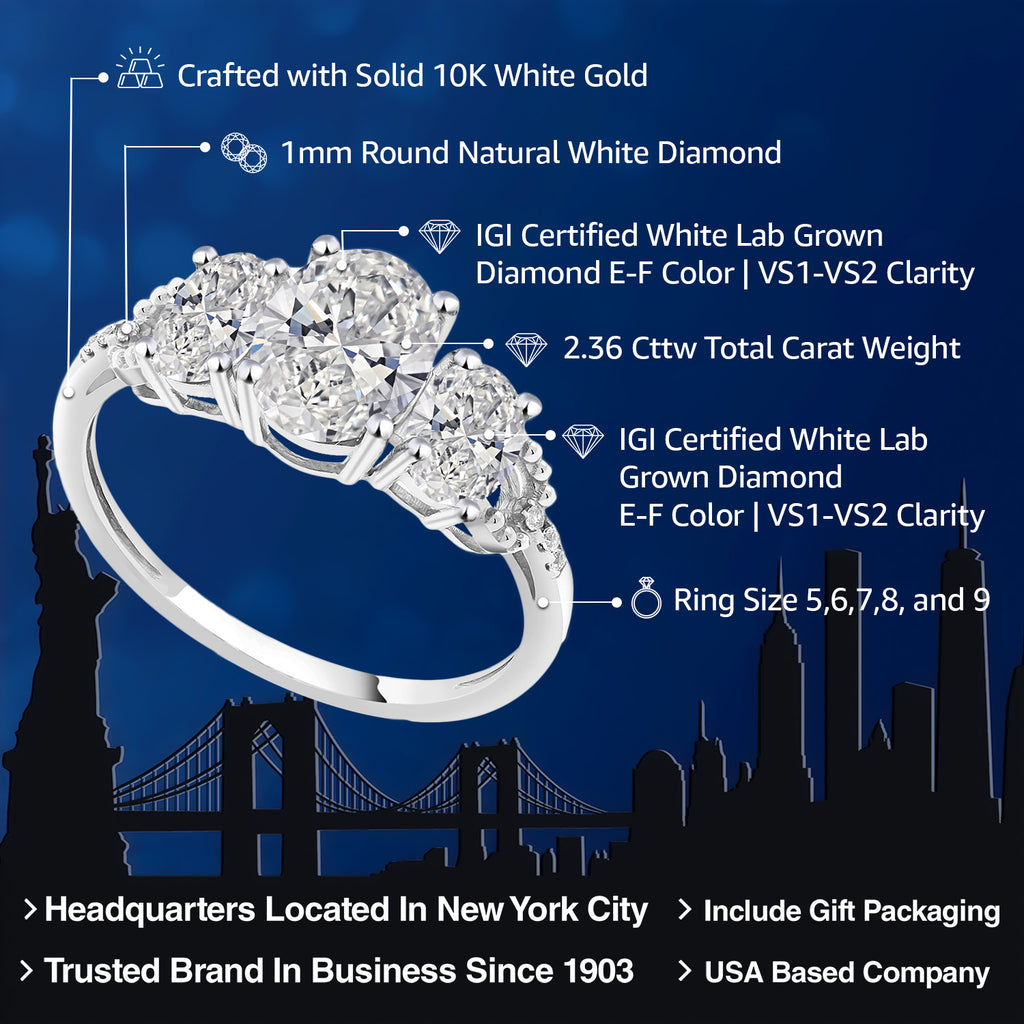 STUNNING THREE-STONE DESIGN: This exquisite engagement ring features a 1.5 Ct IGI certified oval-cut center diamond, flanked by two additional lab grown diamonds, totaling 2.36 Cttw. The three-stone design symbolizes the past, present, and future, making it a meaningful and romantic choice.