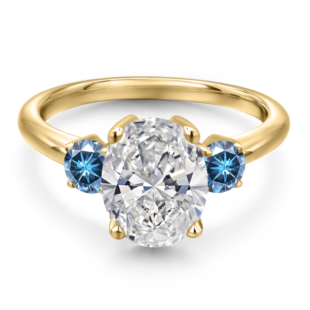 2.46 cttw IGI Certified Lab Grown Diamond and Persian Blue Moissanite 3-Stone Engagement Ring For Women | 18K Yellow Gold Plated Silver | Center 2.00 Ct Diamond | E-F Color | VS1-VS2