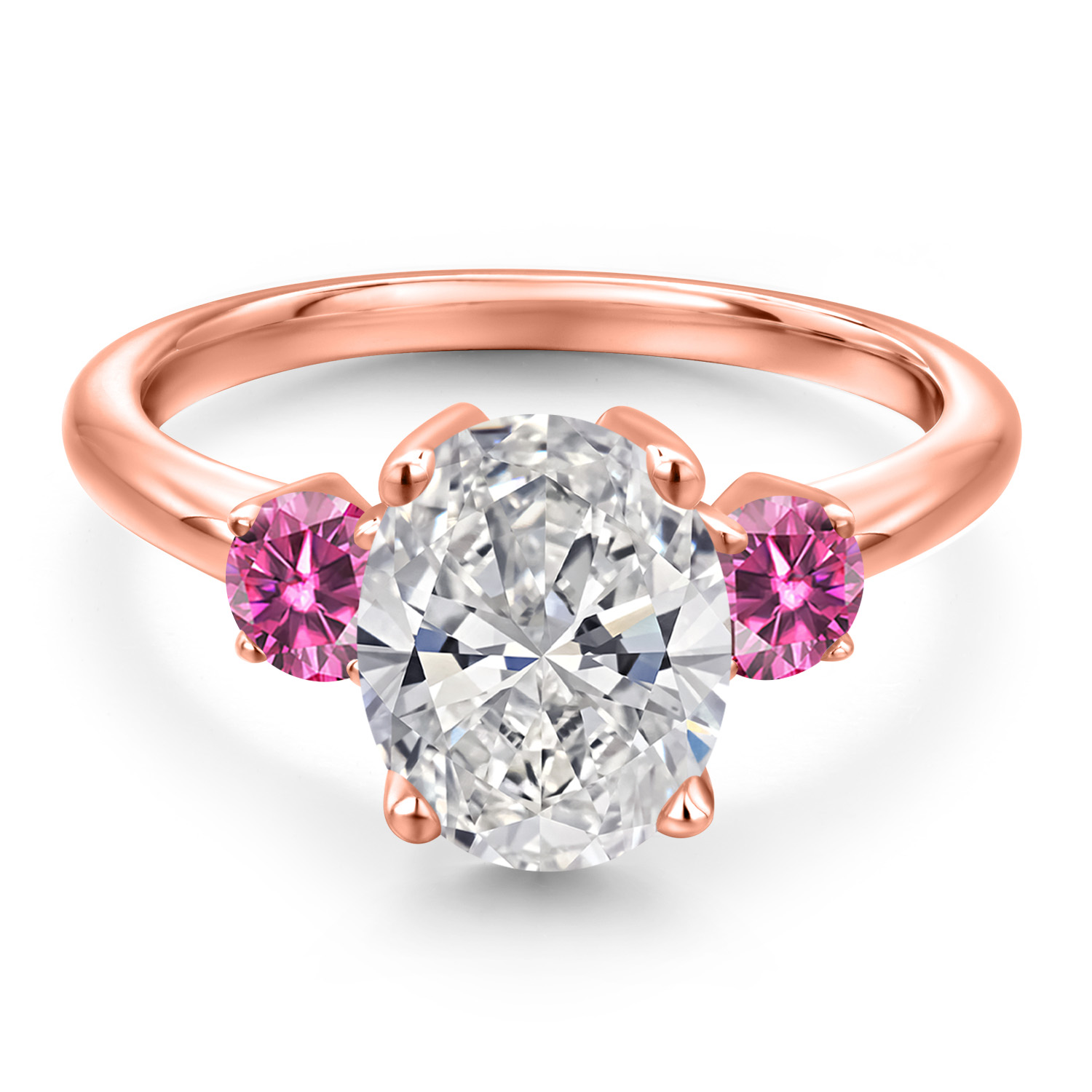 MEASUREMENTS: 10x8mm Oval E - F Lab Grown Diamond, 4x4mm Round Coated Pink Moissanite. Total Carat Weight is 2.46 cttw