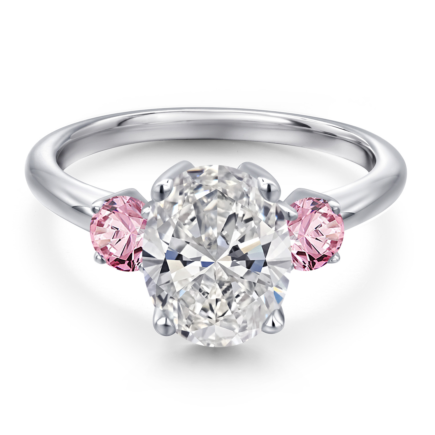MEASUREMENTS: 10x8mm Oval E - F Lab Grown Diamond, 4x4mm Round Irradiated Pink Lab Grown Diamond. Total Carat Weight is 2.5 cttw