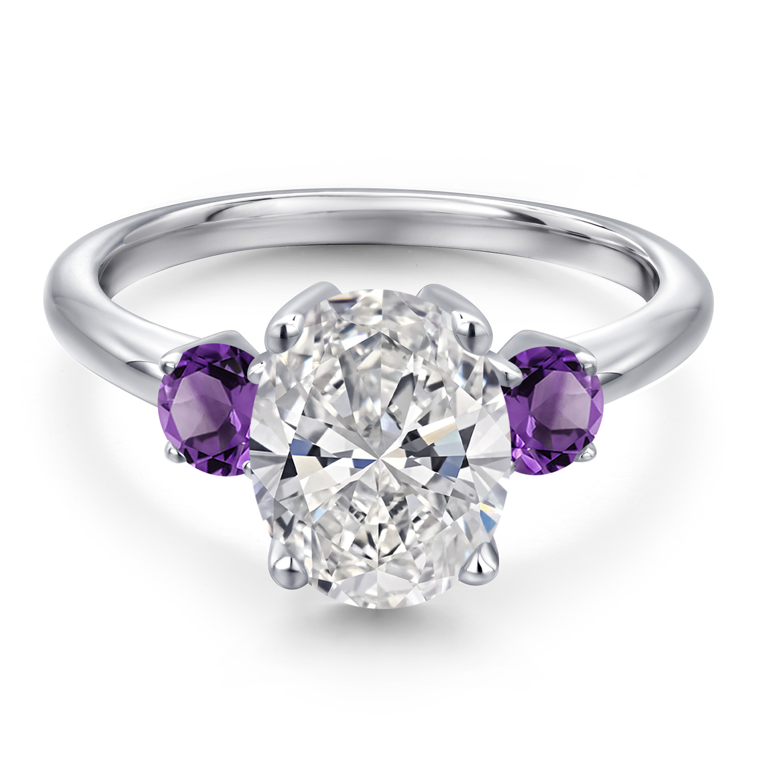 MEASUREMENTS: 10x8mm Oval E - F Lab Grown Diamond, 4x4mm Round Heat-Treated Purple Amethyst. Total Carat Weight is 2.5 cttw