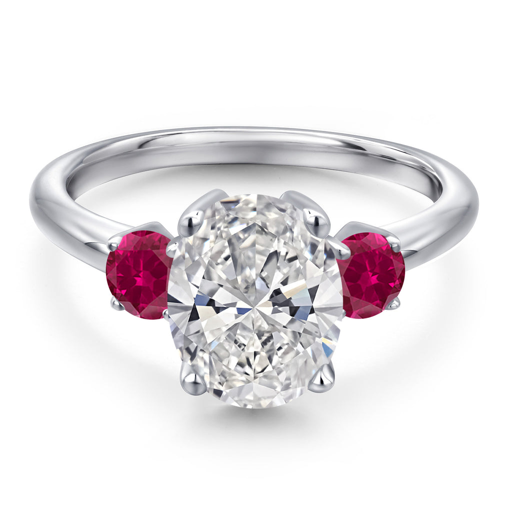 MEASUREMENTS: 10x8mm Oval E - F Lab Grown Diamond, 4x4mm Round Heat-Treated Red Created Ruby. Total Carat Weight is 2.5 cttw
