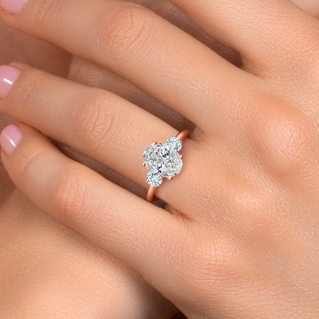 MEASUREMENTS: 10x8mm Oval E - F Lab Grown Diamond, 4x4mm Round Heat-Treated Sky Blue Aquamarine. Total Carat Weight is 2.5 cttw