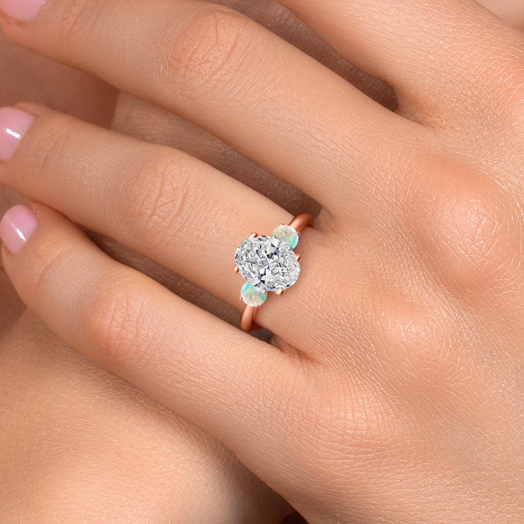 MEASUREMENTS: 10x8mm Oval E - F Lab Grown Diamond, 4x4mm Round Cabochon White Opal. Total Carat Weight is 2.5 cttw