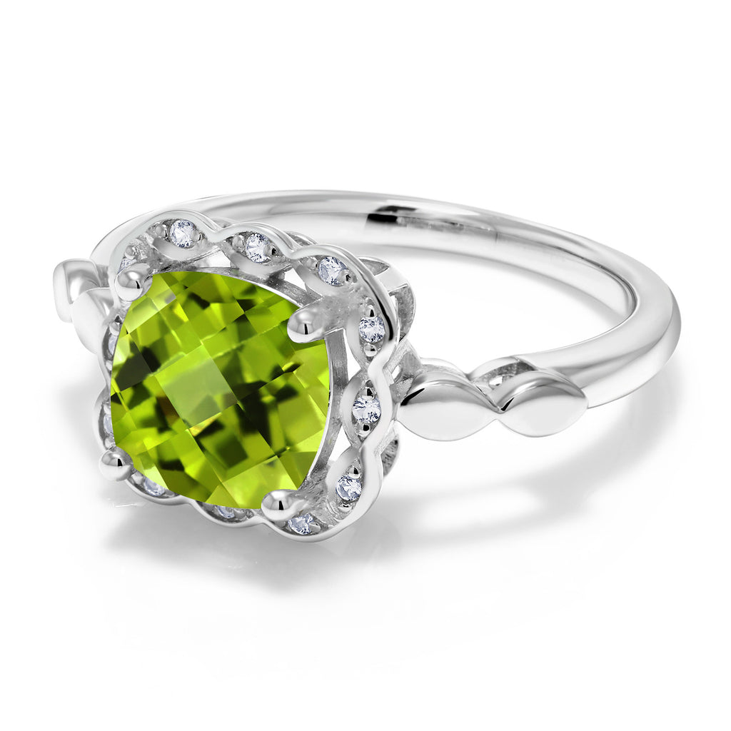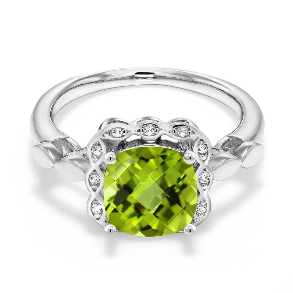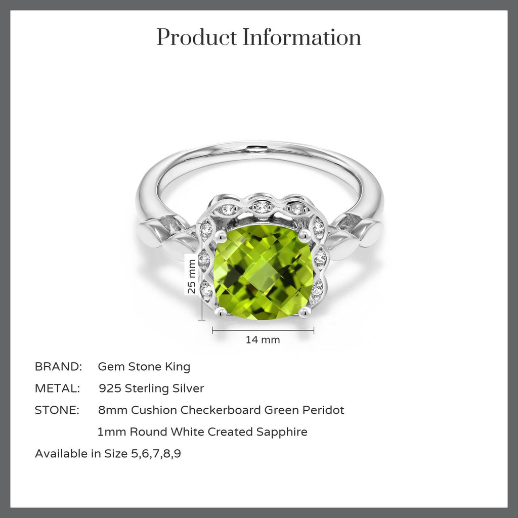 MEASUREMENTS: 8x8mm Cushion Checkerboard Green Peridot, 1x1mm Round Heat-Treated White Created Sapphire. Total Carat Weight is 2.6 cttw