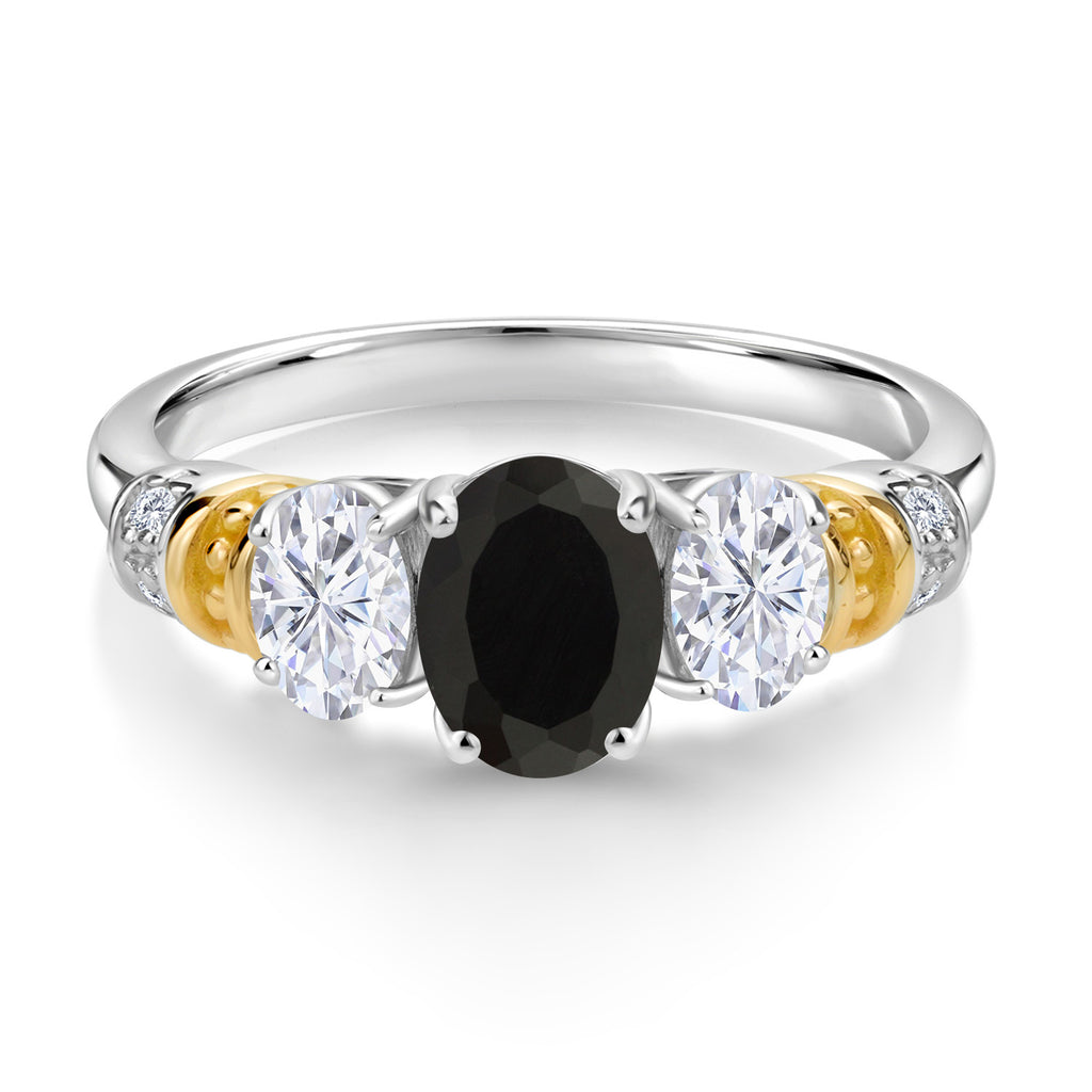 2.63 Cttw Oval Black Onyx White Moissanite and White Diamond 3-Stone Ring For Women | 925 Sterling Silver and 10K Yellow Gold | Wedding Engagement Anniversary Promise Ring