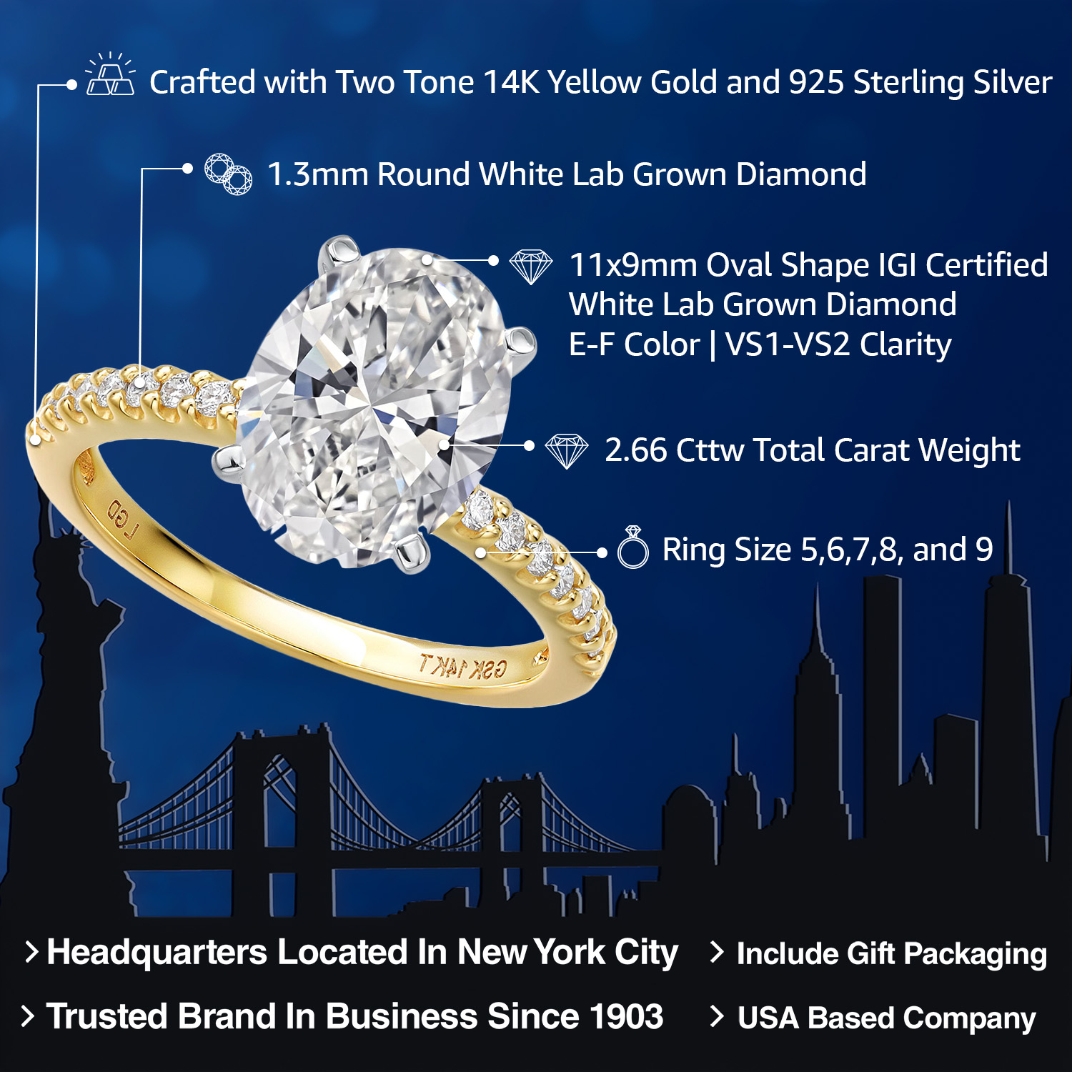 IGI CERTIFIED 2.50 CT OVAL DIAMOND CENTERPIECE: This elegant engagement ring showcases a 2.50 carat oval lab grown diamond at the center, IGI certified for its exceptional E-F color and VS1–VS2 clarity. Known for its soft curves and elongated silhouette, the oval cut creates a slimming effect on the finger and delivers intense fire and brilliance. The total carat weight of the ring is 2.66 cttw, offering breathtaking sparkle from every angle.