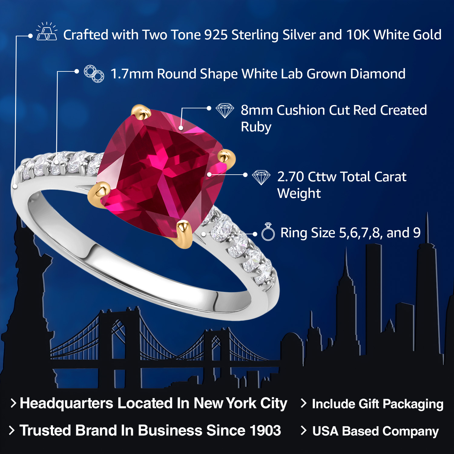 ELEGANT RUBY AND DIAMOND DESIGN: This exquisite engagement ring features an 8MM cushion-cut Red Created Ruby accented by sparkling White Lab-Grown Diamonds, totaling 2.70 carats. The July birthstone symbolizes passion, love, and everlasting devotion.