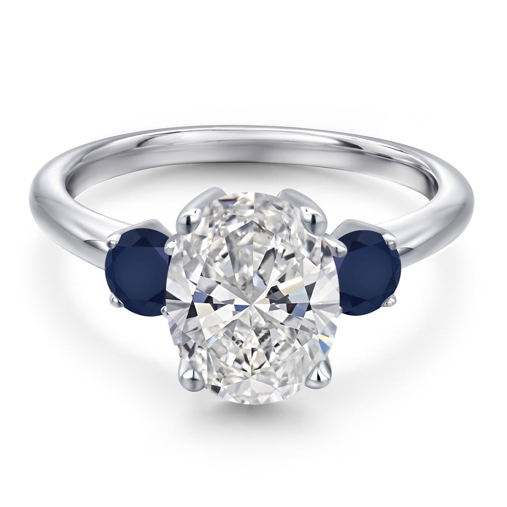 MEASUREMENTS: 10x8mm Oval E - F Lab Grown Diamond, 4x4mm Round Diffused Blue Sapphire. Total Carat Weight is 2.7 cttw