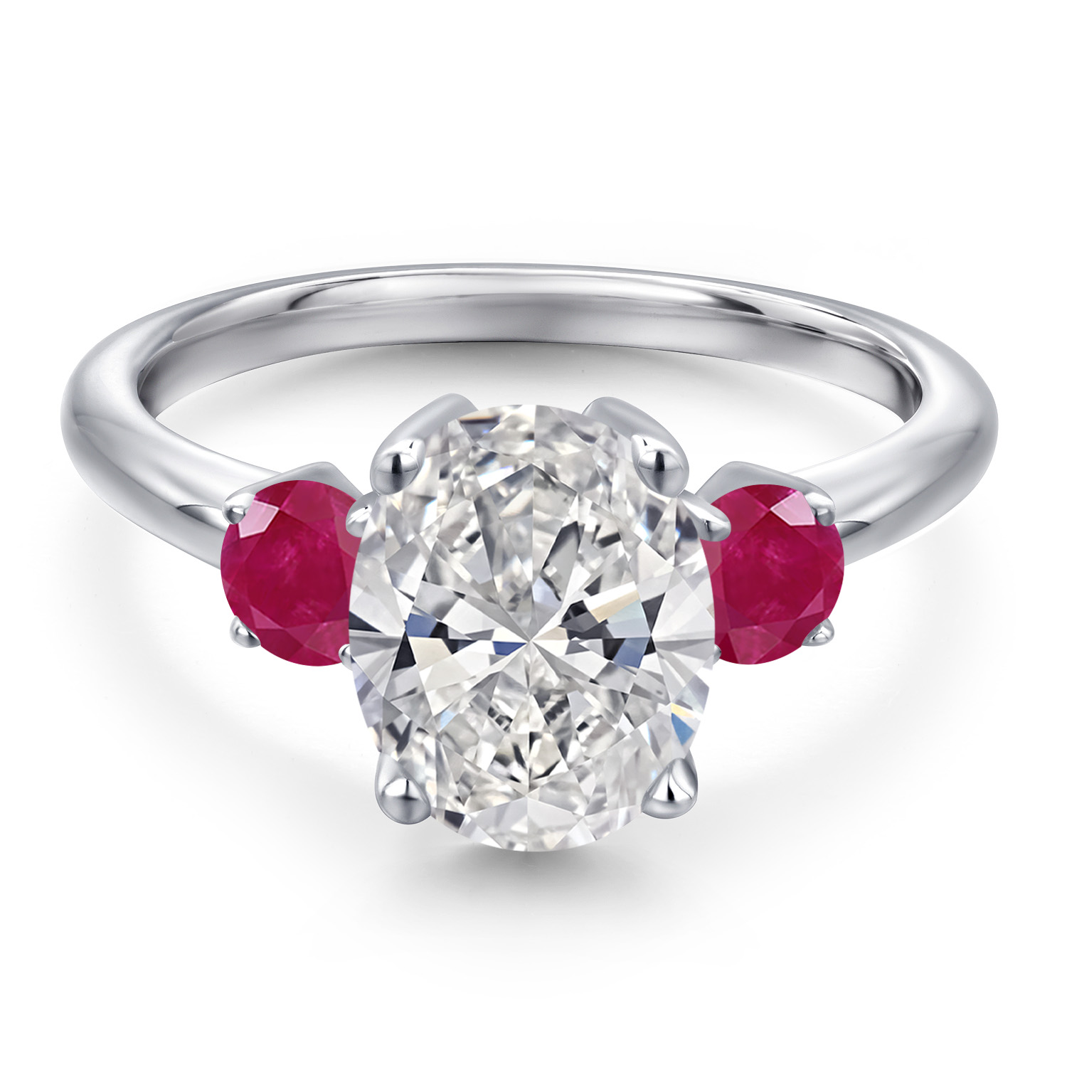 MEASUREMENTS: 10x8mm Oval E - F Lab Grown Diamond, 4x4mm Round Heat-Treated Red Ruby. Total Carat Weight is 2.7 cttw