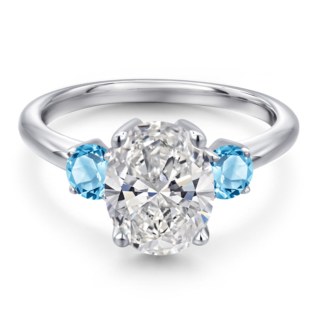 MEASUREMENTS: 10x8mm Oval E - F Lab Grown Diamond, 4x4mm Round Irradiated Swiss Blue Topaz. Total Carat Weight is 2.71 cttw