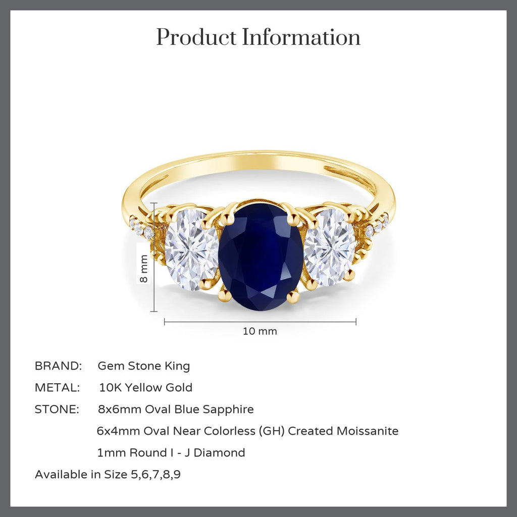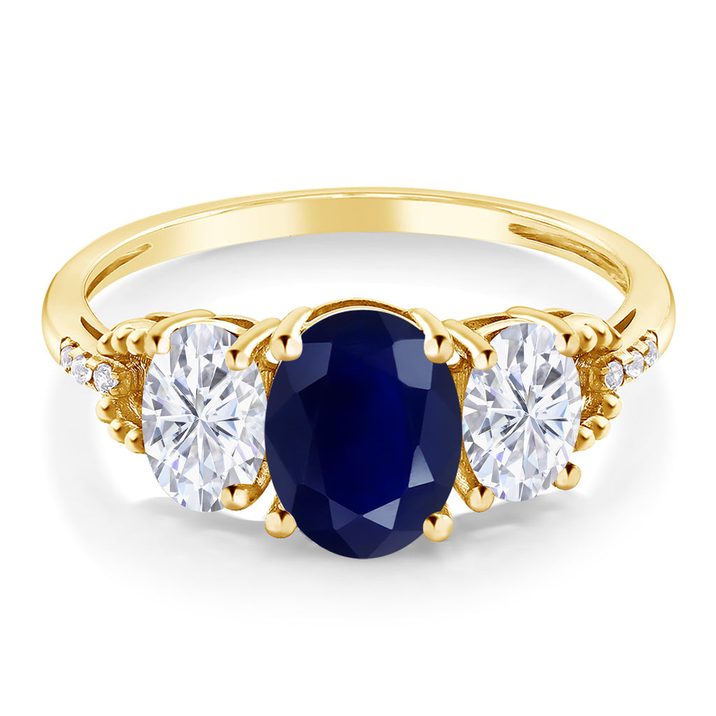 2.84 Cttw 10K Yellow Gold Blue Sapphire White Moissanite and Diamond 3-Stone Engagement Ring | Gemstone Birthstone | Three Stone Wedding Anniversary Promise Ring For Women